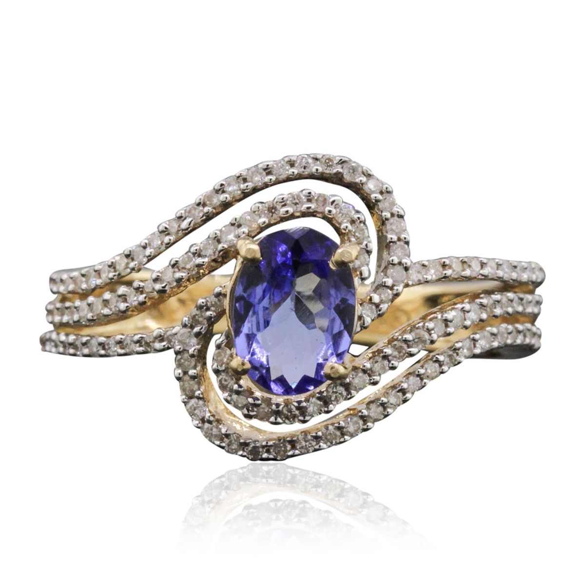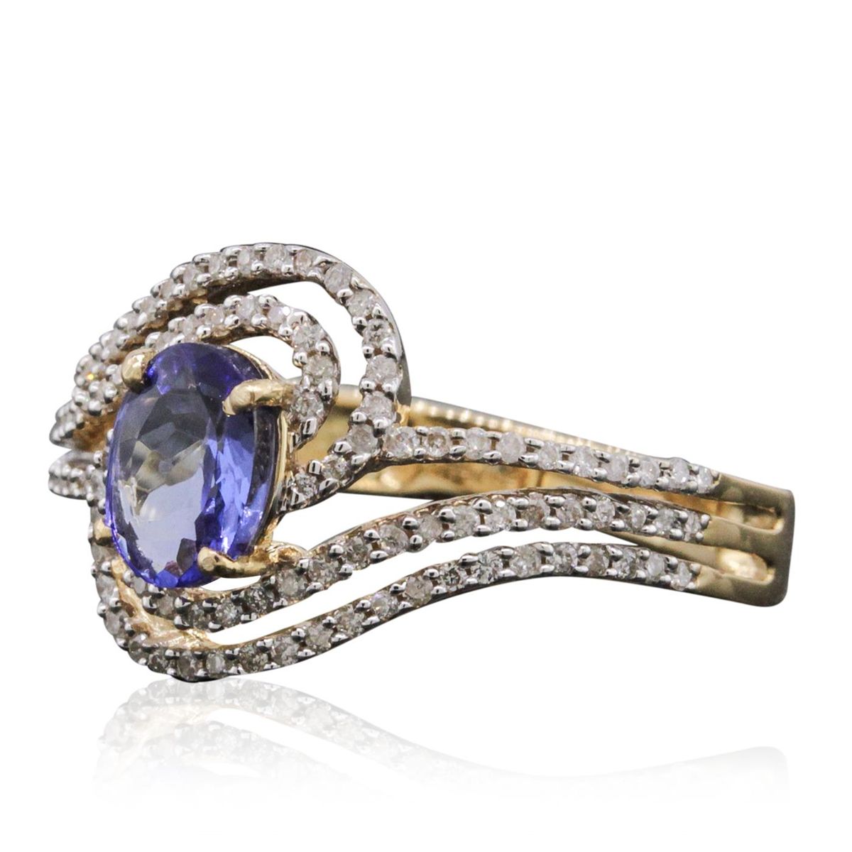 One electronically tested 14KT yellow gold ladies cast tanzanite and diamond ring. The featured tanzanite is set within a stylized diamond set bypass design, completed by a three millimeter wide band. Bright polish finish with rhodium accents. Trademark is Orianne. Identified with markings of "14K". Condition is new, good workmanship. Containing: One prong set oval brilliant cut natural tanzanite, measuring 6.80 x 4.80 x 3.10mm, approximate weight of 0.80ct., clarity is eye clean, type I, medium dark, very slightly grayish, bluish violet color, (GIA bV 6/3), cut is good. Transmitting light with no distortion, transparent. Graded in the setting. Tanzanite is a very rare gemstone that is only found in the country of Tanzania. Originally discovered in 1967. Tiffany & Company, named the stone Tanzanite. It is found in the Usumburu Mountains that border the Umba Valley of northern Tanzania. Tanzanite occurs in gray, brown, violet, blue, reddish-purple, & green. The gem is interesting because of its exceptional pleochroism. Rotated in different directions a tanzanite will exhibit multiple changes of color. Tanzanite has a low tolerance to ultrasonic cleaning, and should not be cleaned using this method. One Hundred Ten prong set round brilliant cut diamonds, measuring 0.90 - 0.80 x 0.51mm (depth est.) approximate total weight of 110 Stones = 0.34ct. Graded in the setting. Clarity: I-1 to I-2. Color: H - J. Total Weight of Colored Stones 0.80ct. Total Weight of Diamonds 0.34ct. Total Weight of Ring 2.95 grams. AIG Appraised at $3,320.00.