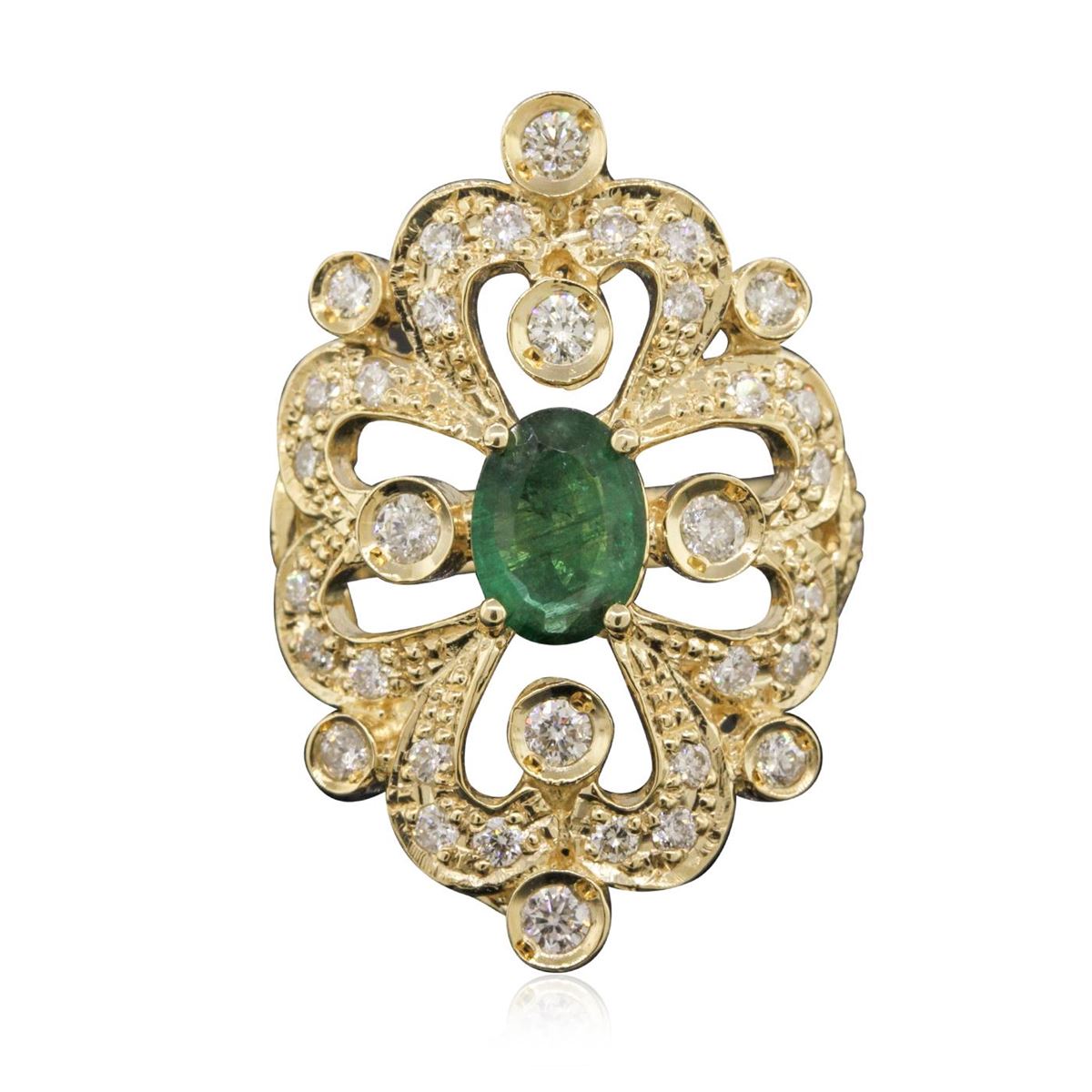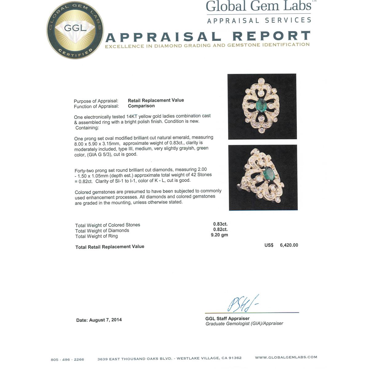 One electronically tested 14KT yellow gold ladies combination cast & assembled ring with a bright polish finish. Condition is new. Containing: One prong set oval modified brilliant cut natural emerald, measuring 8.00 x 5.90 x 3.15mm, approximate weight of 0.83ct., clarity is moderately included, type III, medium, very slightly grayish, green color, (GIA G 5/3), cut is good. Forty-Two prong set round brilliant cut diamonds, measuring 2.00 - 1.50 x 1.05mm (depth est.) approximate total weight of 42 Stones = 0.82ct. Clarity: SI-1 to I-1. Color: K - L, Cut is Good. Colored gemstones are presumed to have been subjected to commonly used enhancement processes. All diamonds and colored gemstones are graded in the mounting, unless otherwise stated. Total Weight of Colored Stones 0.83ct. Total Weight of Diamonds 0.82ct. Total Weight of Ring 9.20 grams. GGL Appraised at $6,420.00.