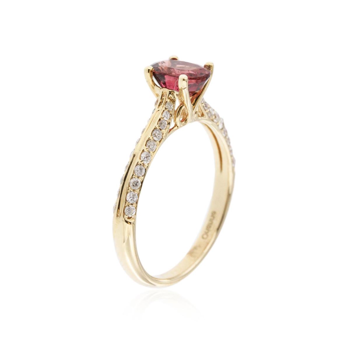 One electronically tested 14KT yellow gold ladies cast tourmaline and diamond ring with a bright polish finish. Condition is new, good workmanship. The featured tourmaline is cathedral set supported by diamond set shoulders, completed by a two millimeter wide band. Trademark is Orianne. Identified with markings of "14K". Containing: One prong set oval mixed cut natural rubellite, measuring 6.80 x 4.90 x 3.85mm, 6%. bulge factor, approximate weight of 0.85ct., clarity is slightly included, type III, medium dark, very slightly brownish, strongly purplish red color, (GIA stpR 6/3), cut is good. Transmitting light with a minimum of distortion, transparent. Naturally occurring internal & external characteristics are present. Graded in the setting. Forty pav‚ set round brilliant cut diamonds, measuring 1.30 - 1.00 x 0.69mm (depth est.) approximate. Total Weight of 40 Stones = 0.32ct. Graded in the setting. Clarity: SI-1 to I-1. Color: G - I. Total Weight of Colored Stones 0.85ct. Total Weight of Diamonds 0.32ct. Total Weight of Ring 2.40 grams. AIG Appraised at $2,110.00.