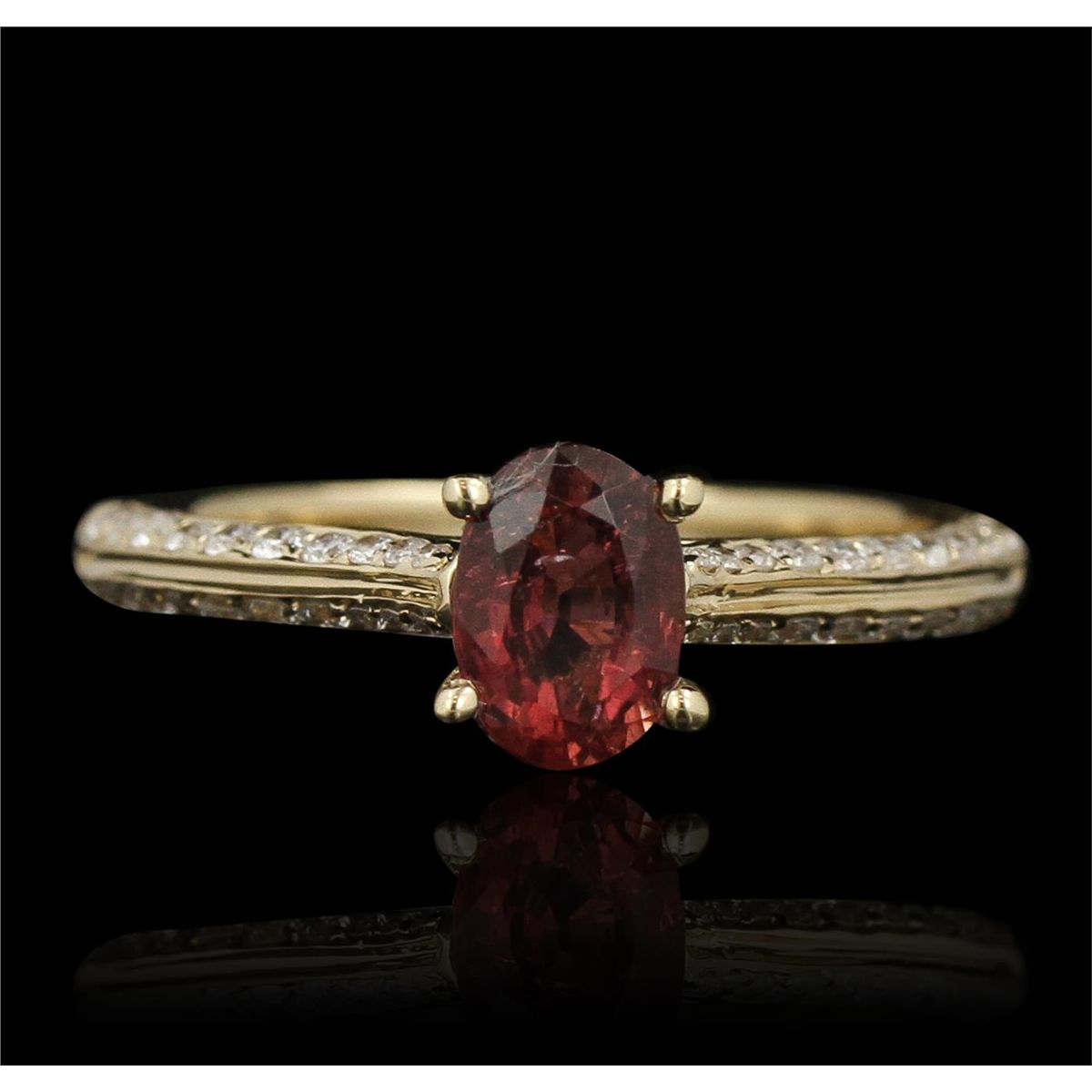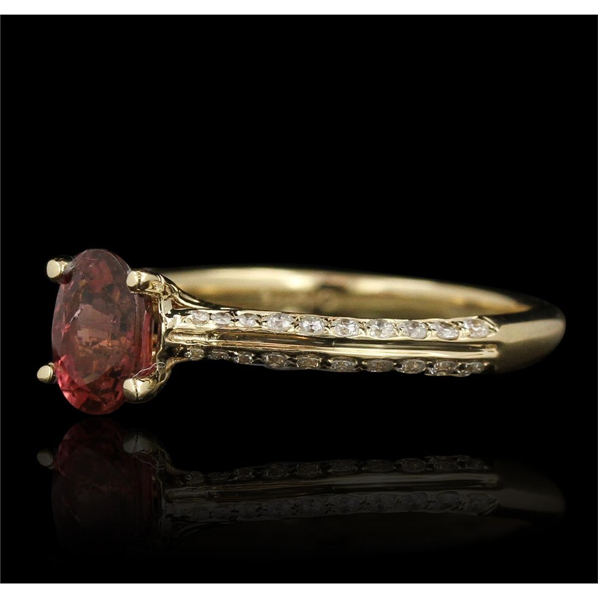 One electronically tested 14KT yellow gold ladies cast tourmaline and diamond ring with a bright polish finish. Condition is new, good workmanship. The featured tourmaline is cathedral set supported by diamond set shoulders, completed by a two millimeter wide band. Trademark is Orianne. Identified with markings of "14K". Containing: One prong set oval mixed cut natural rubellite, measuring 6.80 x 4.90 x 3.85mm, 6%. bulge factor, approximate weight of 0.85ct., clarity is slightly included, type III, medium dark, very slightly brownish, strongly purplish red color, (GIA stpR 6/3), cut is good. Transmitting light with a minimum of distortion, transparent. Naturally occurring internal & external characteristics are present. Graded in the setting. Forty pav‚ set round brilliant cut diamonds, measuring 1.30 - 1.00 x 0.69mm (depth est.) approximate. Total Weight of 40 Stones = 0.32ct. Graded in the setting. Clarity: SI-1 to I-1. Color: G - I. Total Weight of Colored Stones 0.85ct. Total Weight of Diamonds 0.32ct. Total Weight of Ring 2.40 grams. AIG Appraised at $2,110.00.