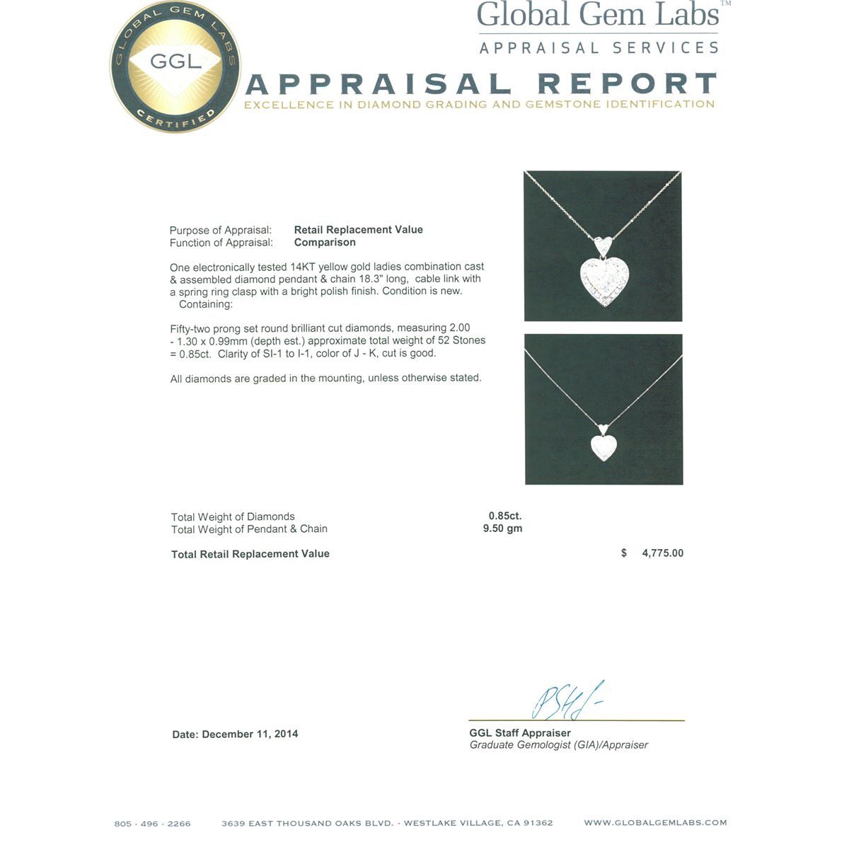 One electronically tested 14KT yellow gold ladies combination cast & assembled diamond pendant & chain 18.3" long, cable link with a spring ring clasp with a bright polish finish. Condition is new. Containing: Fifty-Two prong set round brilliant cut diamonds, measuring 2.00 - 1.30 x 0.99mm (depth est.) approximate total weight of 52 Stones = 0.85ct. Clarity: SI-1 to I-1. Color: J - K, Cut is Good. All diamonds are graded in the mounting, unless otherwise stated. Total Weight of Diamonds 0.85ct. Total Weight of Pendant & Chain 9.50 grams. GGL Appraised at $4,775.00.