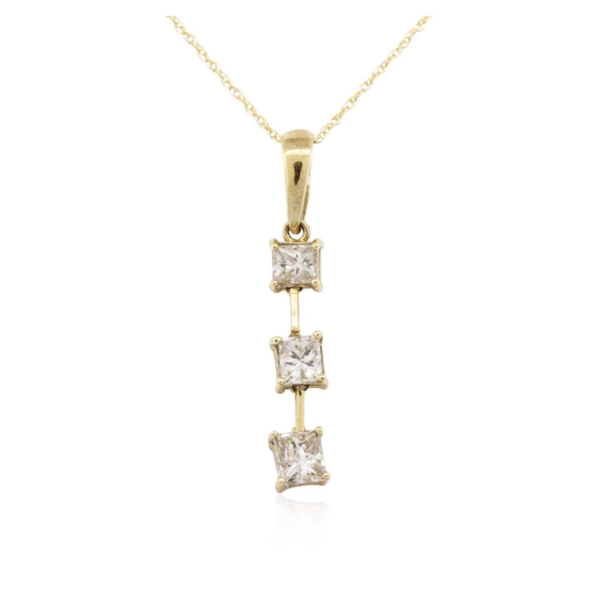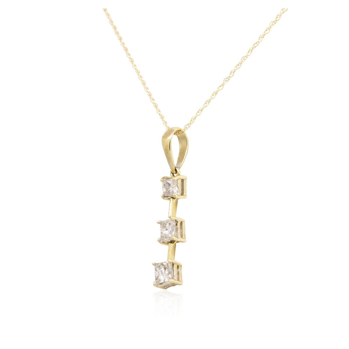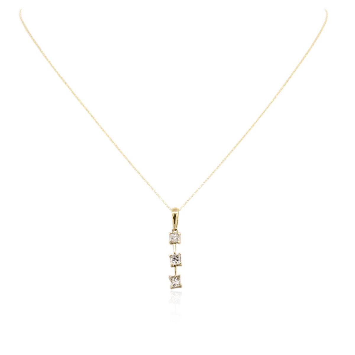 One dangling pendant with chain featuring: 14KT yellow gold weighing 1.70 grams containing princess cut diamonds with a total weight of 0.86cts.