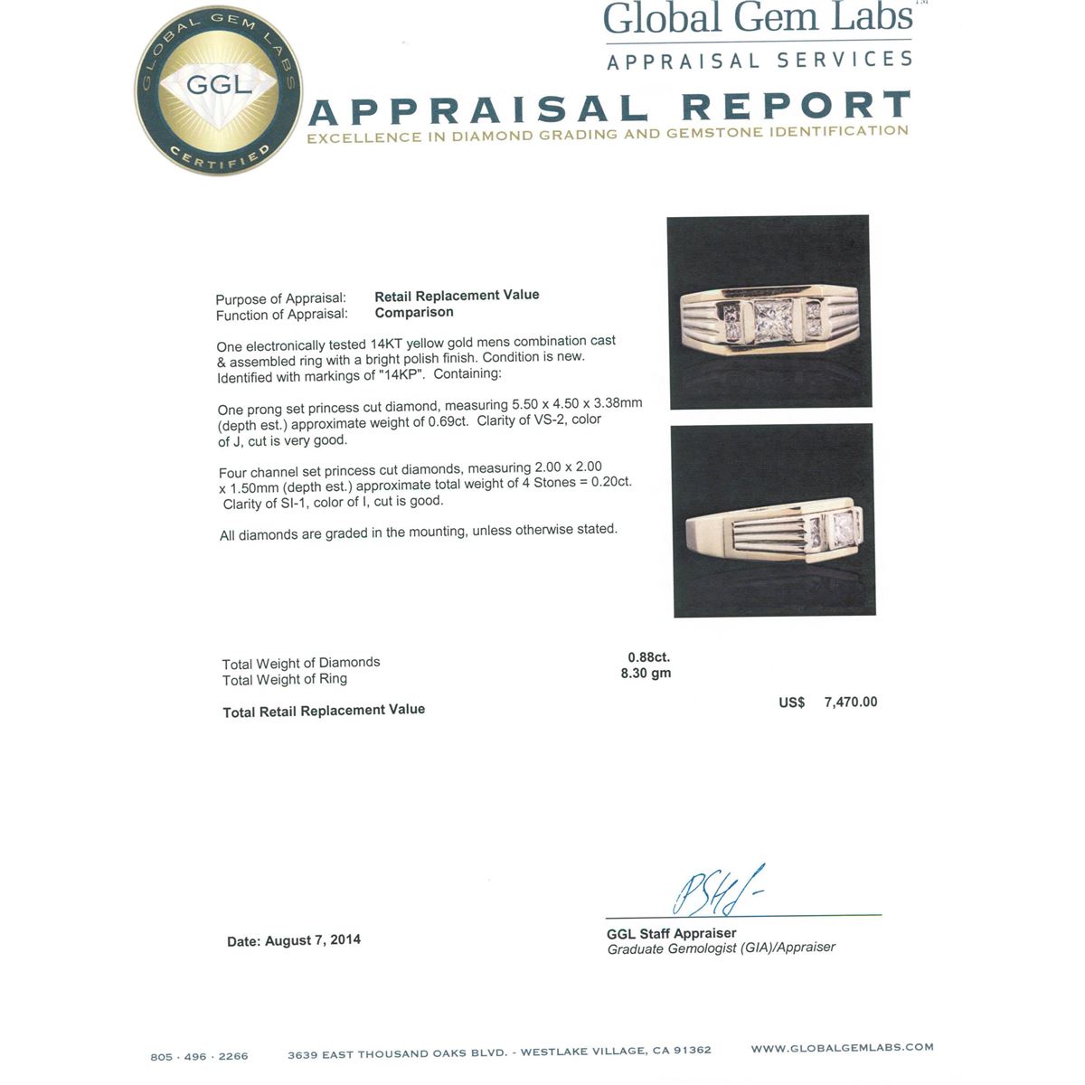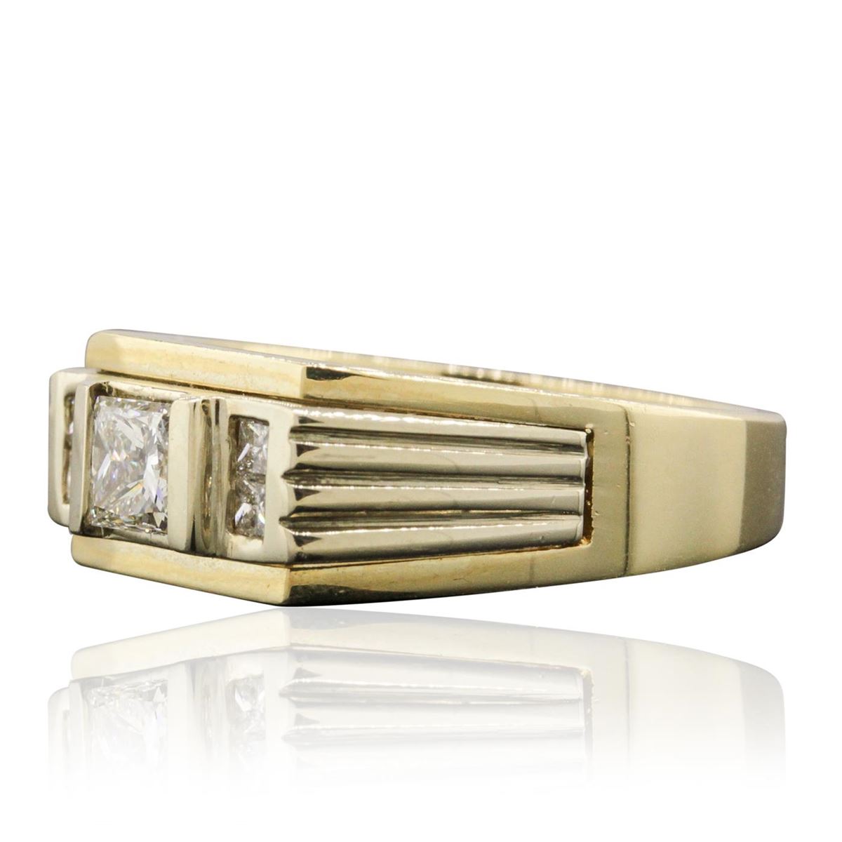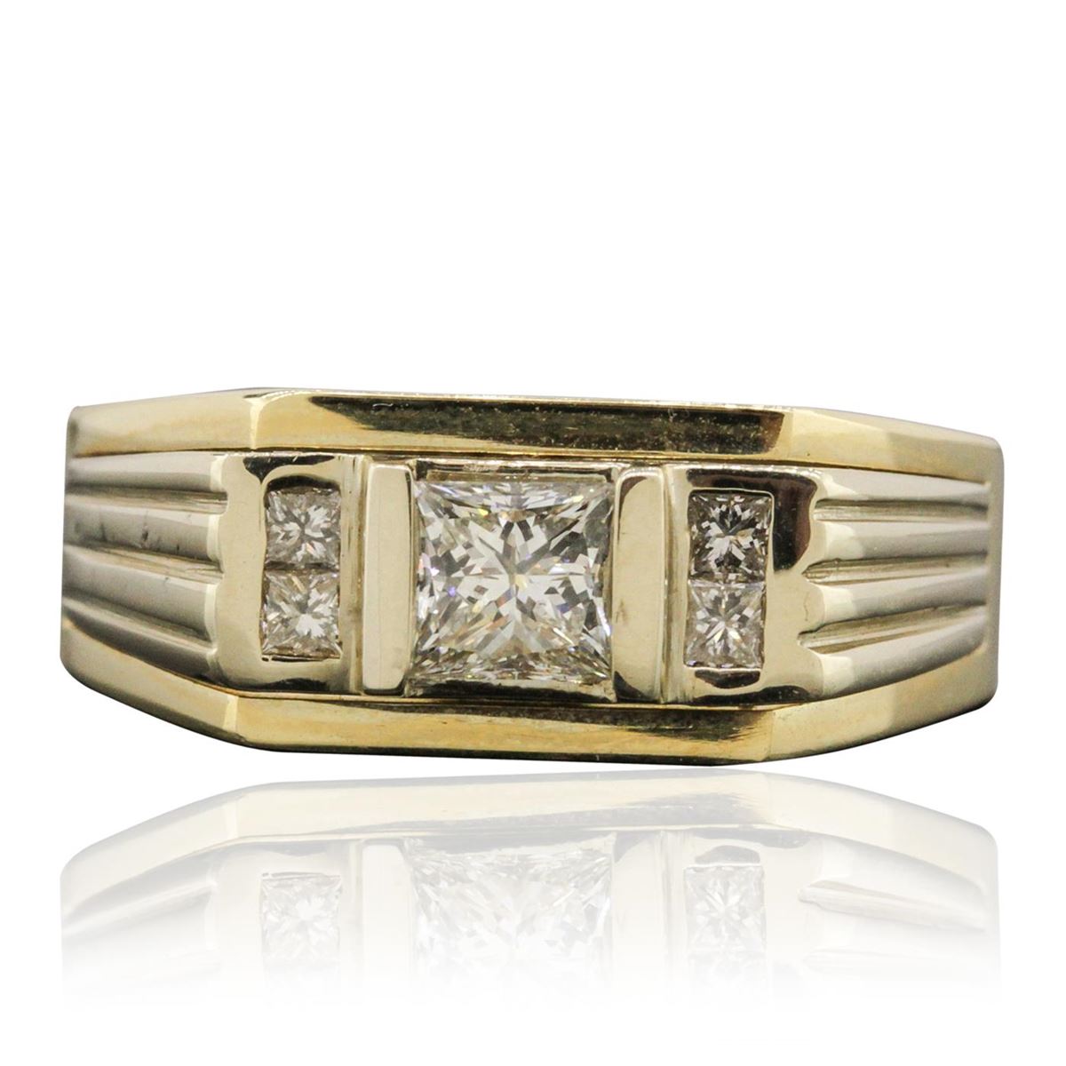 One electronically tested 14KT yellow gold mens combination cast & assembled ring with a bright polish finish. Identified with markings of "14KP". Condition is new. Containing: One prong set princess cut diamond, measuring 5.50 x 4.50 x 3.38mm (depth est.) approximate weight of 0.69ct. Clarity: VS-2. Color: J, Cut is Very Good. Four channel set princess cut diamonds, measuring 2.00 x 2.00 x 1.50mm (depth est.) approximate total weight of 4 Stones = 0.20ct. Clarity: SI-1. Color: I, Cut is Good. All diamonds are graded in the mounting, unless otherwise stated. Total Weight of Diamonds 0.88ct. Total Weight of Ring 8.30 grams. GGL Appraised at $7,470.00.