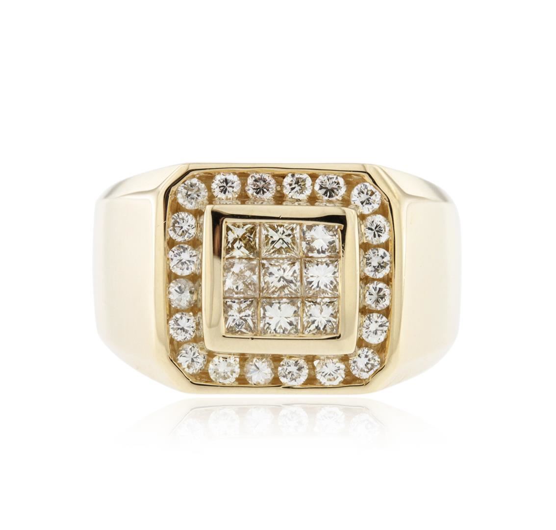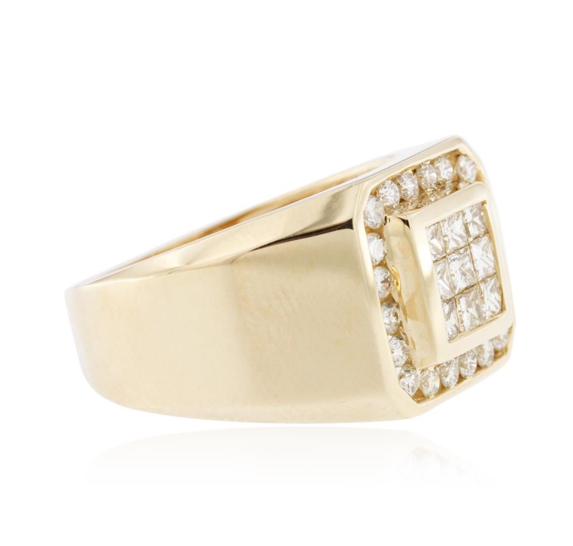 One electronically tested 14KT yellow gold mens cast diamond ring with a bright polish finish. Identified with markings of "14K". Condition is new. Containing: Nine invisible set princess cut diamonds, measuring 2.20 x 2.20 x 1.65mm (depth est.) approximate total weight of 9 Stones = 0.59ct. Clarity: VS-2. Color: K - L, Cut is Good. Twenty channel set round brilliant cut diamonds, measuring 1.60 - 1.60 x 0.96mm (depth est.) approximate total weight of 20 Stones = 0.30ct. Clarity: VS-2 to SI-1. Color: K, Cut is Good. All diamonds are graded in the mounting, unless otherwise stated. Total Weight of Diamonds 0.89ct. Total Weight of Ring 9.40 grams. GGL Appraised at $3,435.00.