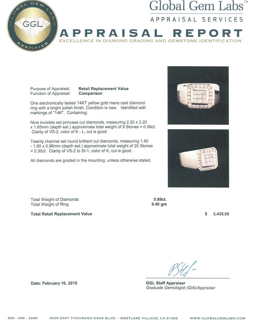 One electronically tested 14KT yellow gold mens cast diamond ring with a bright polish finish. Identified with markings of "14K". Condition is new. Containing: Nine invisible set princess cut diamonds, measuring 2.20 x 2.20 x 1.65mm (depth est.) approximate total weight of 9 Stones = 0.59ct. Clarity: VS-2. Color: K - L, Cut is Good. Twenty channel set round brilliant cut diamonds, measuring 1.60 - 1.60 x 0.96mm (depth est.) approximate total weight of 20 Stones = 0.30ct. Clarity: VS-2 to SI-1. Color: K, Cut is Good. All diamonds are graded in the mounting, unless otherwise stated. Total Weight of Diamonds 0.89ct. Total Weight of Ring 9.40 grams. GGL Appraised at $3,435.00.