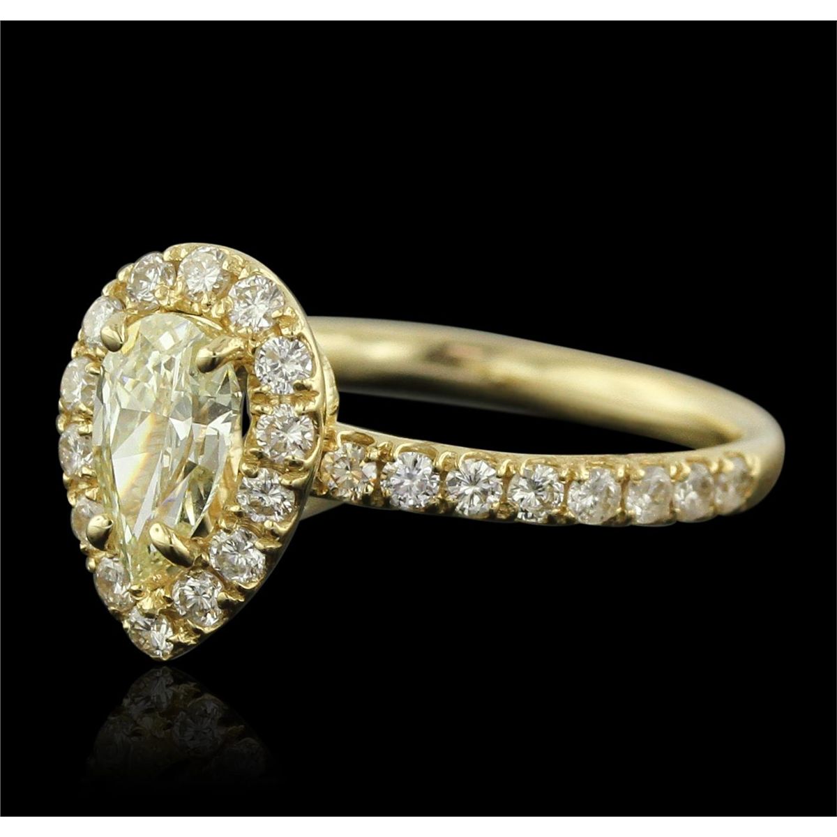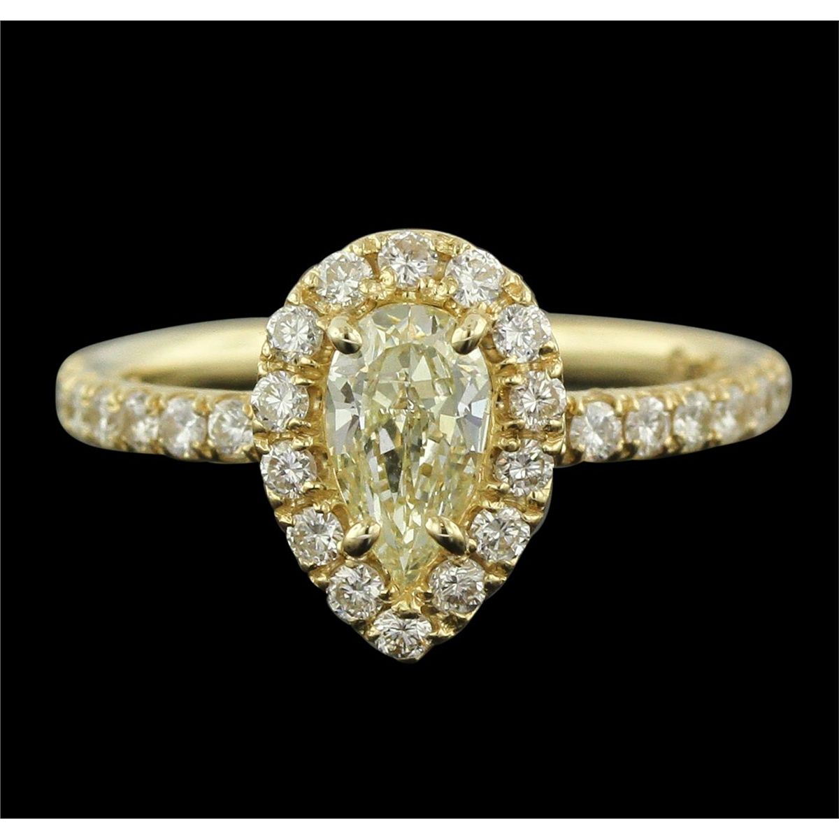 One electronically tested 14KT yellow gold ladies cast & assembled diamond unity ring with a bright polish finish. Condition is new, good workmanship. The ring features a yellow pear shaped diamond set within a ribbon of diamonds, completed by a diamond set two millimeter wide band. Identified with markings of "14K". Containing: One prong set round brilliant cut diamonds, measuring 7.60 - 4.00 x 2.52mm (depth est.) approximate weight of 0.44ct. Graded in the setting. Clarity: VVS-2. Color: Light Yellow. Thirty prong set round brilliant cut diamonds, measuring 1.70 - 1.50 x 0.96mm (Depth est.) approximate total weight of 30 Stones = 0.45ct. Graded in the setting. Clarity: VS-2 to SI-2 to SI-1. Total Weigh of Diamonds: 0.89ct. Total Weight of Ring: 2.68gm.