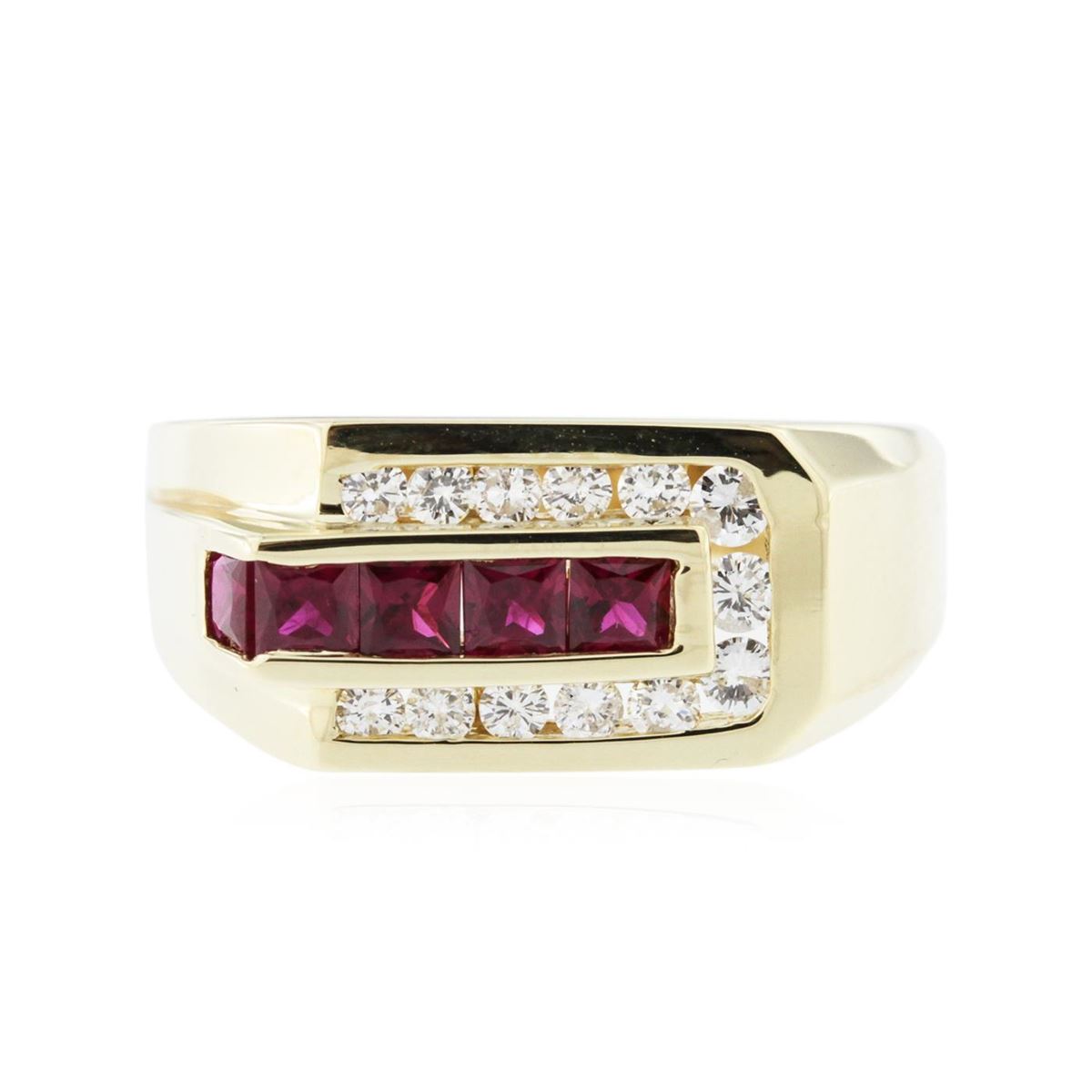 One electronically tested 14KT yellow gold mens cast ruby and diamond ring with a bright polish finish. Identified with markings of "14K". Condition is new. Containing: Five channel set princess standard brilliant cut natural rubies, measuring 3.00 x 3.00 x 1.95mm, approximate total weight of 0.90ct., clarity is slightly included, medium dark, moderately strong, red color, (GIA R 6/4), cut is good. Thirteen channel set round brilliant cut diamonds, measuring 1.80 - 1.80 x 1.08mm (depth est.) approximate total weight of 13 Stones = 0.28ct. Clarity: SI-1 to SI-2. Color: J, Cut is Good. Colored gemstones are presumed to have been subjected to commonly used enhancement processes, All diamonds and colored gemstones are graded in the mounting, unless otherwise stated. Total Weight of Colored Stones 0.90ct. Total Weight of Diamonds 0.28ct. Total Weight of Ring 9.60 grams. GGL Appraised at $2,830.00.