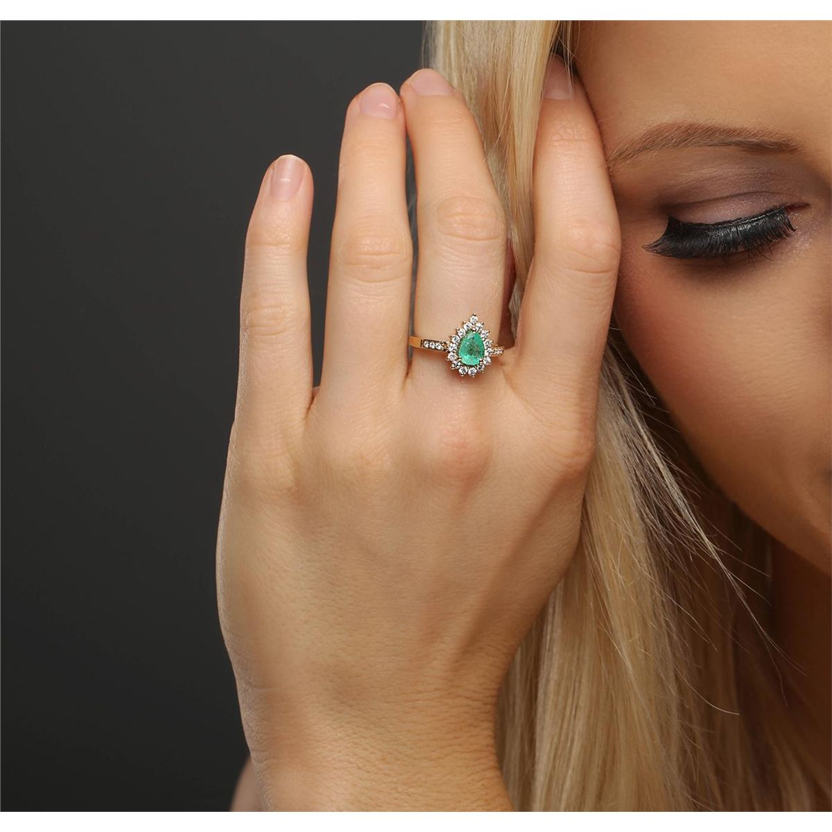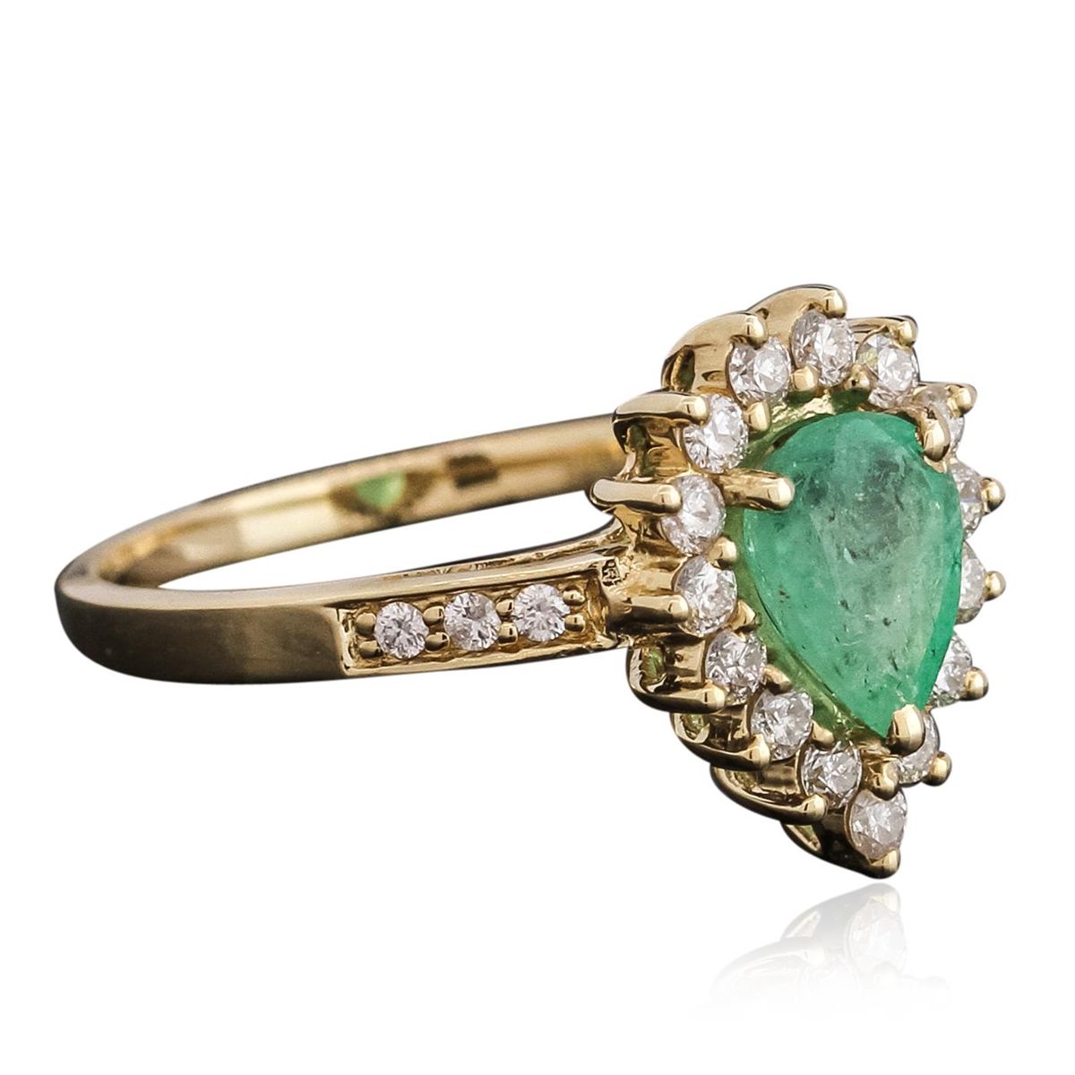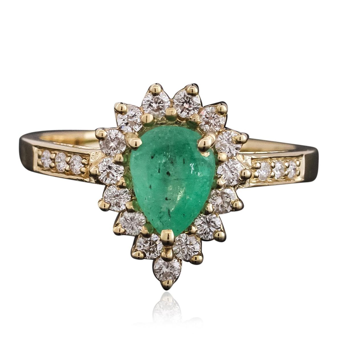 One electronically tested 14KT yellow gold ladies combination cast & assembled emerald and diamond ring with a flat shank with a bright polish finish. Identified with markings of "14K". Condition is new. Containing: One prong set pear modified brilliant cut natural emerald, measuring 6.76 x 5.36 x 4.55mm, approximate weight of 0.90ct., clarity is heavily included, type III, medium light, very slightly grayish, very slightly bluish green color, (GIA vslbG 4/3), cut is good. Fifteen prong set round brilliant cut diamonds, measuring 1.70 - 1.10 x 0.84mm (depth est.) approximate total weight of 15 Stones = 0.15ct. Clarity: I-1 to I-2. Color: J - K, Cut is Good. Colored gemstones are presumed to have been subjected to commonly used enhancement processes. All diamonds and colored gemstones are graded in the mounting, unless otherwise stated total weight of Colored Stones 0.90ct. Total Weight of Diamonds 0.15ct. Total Weight of Ring 3.00 grams. GGL Appraised at $3,960.00.