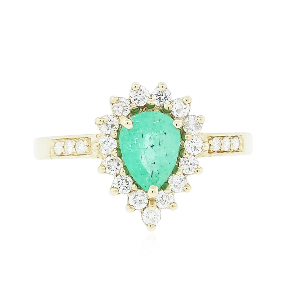 One electronically tested 14KT yellow gold ladies combination cast & assembled emerald and diamond ring with a flat shank with a bright polish finish. Identified with markings of "14K". Condition is new. Containing: One prong set pear modified brilliant cut natural emerald, measuring 6.76 x 5.36 x 4.55mm, approximate weight of 0.90ct., clarity is heavily included, type III, medium light, very slightly grayish, very slightly bluish green color, (GIA vslbG 4/3), cut is good. Fifteen prong set round brilliant cut diamonds, measuring 1.70 - 1.10 x 0.84mm (depth est.) approximate total weight of 15 Stones = 0.15ct. Clarity: I-1 to I-2. Color: J - K, Cut is Good. Colored gemstones are presumed to have been subjected to commonly used enhancement processes. All diamonds and colored gemstones are graded in the mounting, unless otherwise stated total weight of Colored Stones 0.90ct. Total Weight of Diamonds 0.15ct. Total Weight of Ring 3.00 grams. GGL Appraised at $3,960.00.