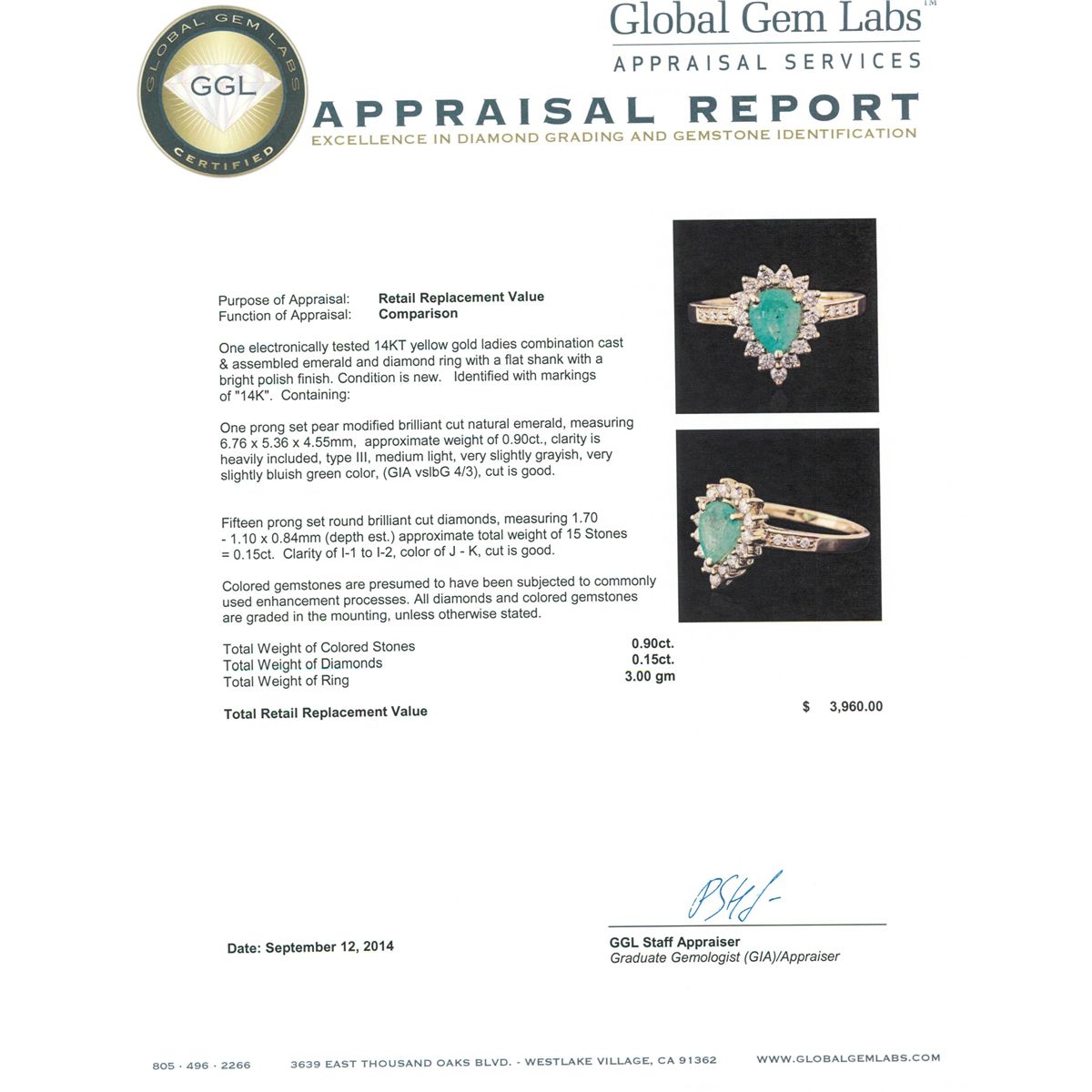 One electronically tested 14KT yellow gold ladies combination cast & assembled emerald and diamond ring with a flat shank with a bright polish finish. Identified with markings of "14K". Condition is new. Containing: One prong set pear modified brilliant cut natural emerald, measuring 6.76 x 5.36 x 4.55mm, approximate weight of 0.90ct., clarity is heavily included, type III, medium light, very slightly grayish, very slightly bluish green color, (GIA vslbG 4/3), cut is good. Fifteen prong set round brilliant cut diamonds, measuring 1.70 - 1.10 x 0.84mm (depth est.) approximate total weight of 15 Stones = 0.15ct. Clarity: I-1 to I-2. Color: J - K, Cut is Good. Colored gemstones are presumed to have been subjected to commonly used enhancement processes. All diamonds and colored gemstones are graded in the mounting, unless otherwise stated total weight of Colored Stones 0.90ct. Total Weight of Diamonds 0.15ct. Total Weight of Ring 3.00 grams. GGL Appraised at $3,960.00.
