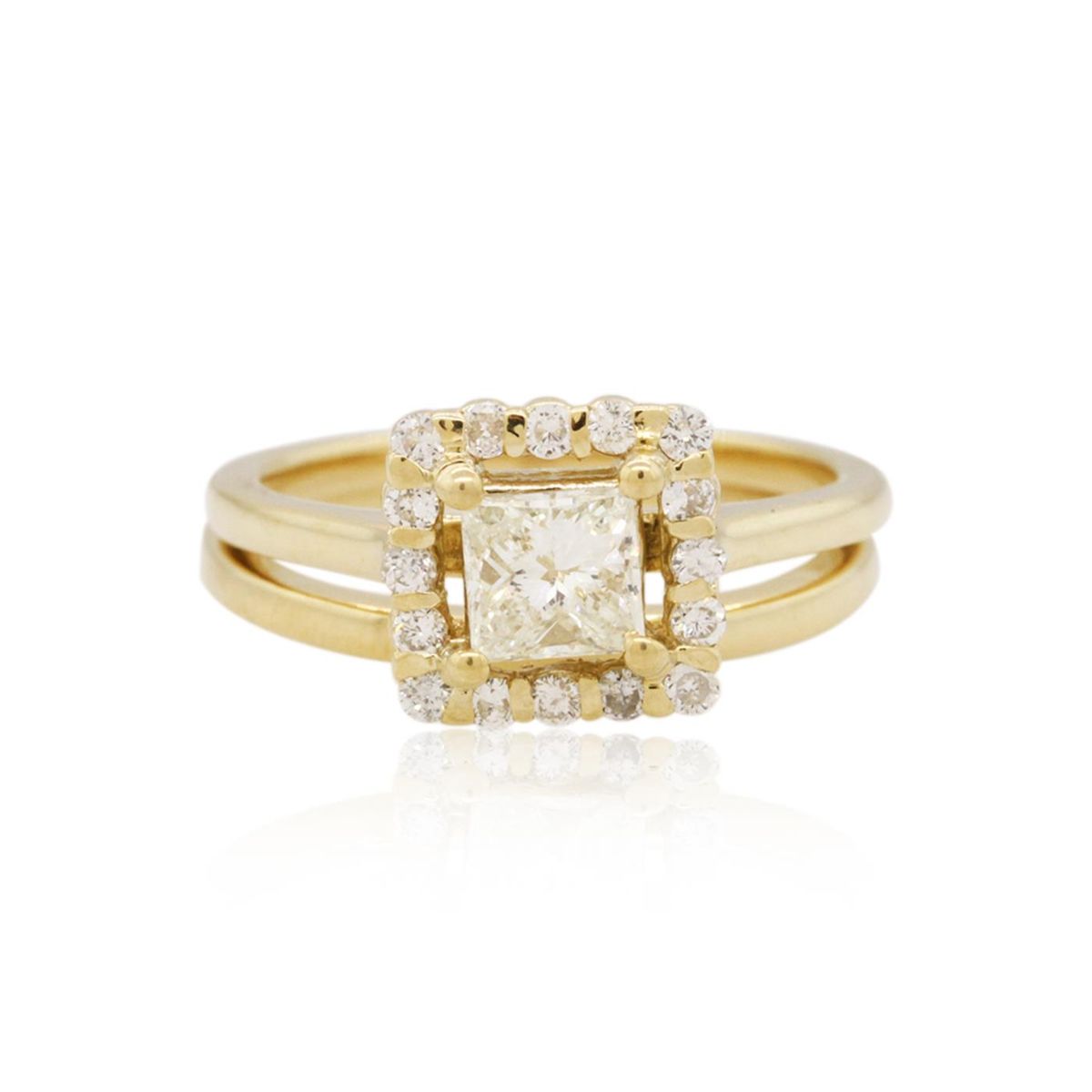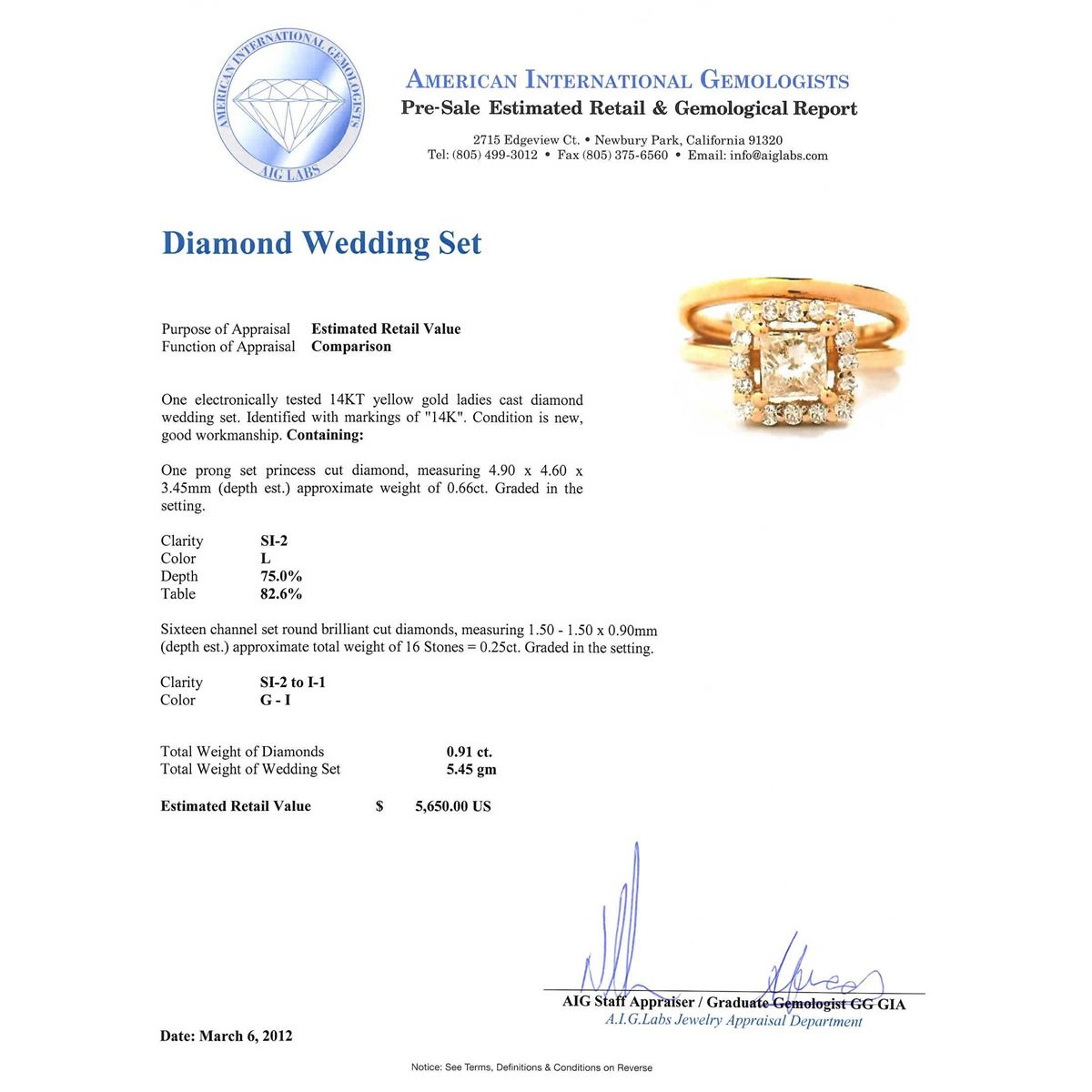 One electronically tested 14KT yellow gold ladies cast diamond wedding set. Identified with markings of "14K". Condition is new, good workmanship. Containing: One prong set princess cut diamond, measuring 4.90 x 4.60 x 3.45mm (depth est.) approximate weight of 0.66ct. Graded in the setting. Clarity SI-2 Color L Depth 75.0% Table 82.6% Sixteen channel set round brilliant cut diamonds, measuring 1.50 x 0.90mm (depth est.) approximate total weight of 16 Stones = 0.25ct. Graded in the setting. Clarity SI-2 to I-1 Color: G-I Total Weight of Diamonds: 0.91 ct. Total Weight of Wedding Set: 5.45 grams. AIG Appraised at $5,650.00.