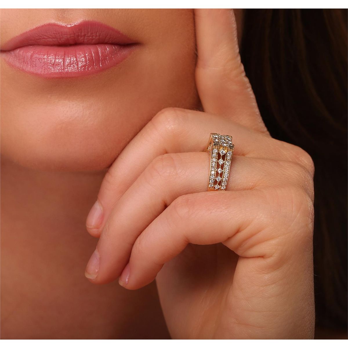 One electronically tested 14KT yellow gold ladies combination cast & assembled engagement ring with a bright polish finish. Identified with markings of "14K". Condition is new. Containing: Five prong set princess cut diamonds, measuring 1.90 x 1.90 x 1.43mm (depth est.) approximate total weight of 5 Stones = 0.21ct. Clarity: SI-1. Color: J - K, Cut is Good. Fifty prong set round brilliant cut diamonds, measuring 2.00 - 1.30 x 0.99mm (depth est.) approximate total weight of 50 Stones = 0.70ct. Clarity: SI-2 to I-1. Color: J - K, Cut is Good. All diamonds are graded in the mounting, unless otherwise stated. Total Weight of Diamonds 0.91ct. Total Weight of Ring 4.80 grams. GGL Appraised at $3,675.00.