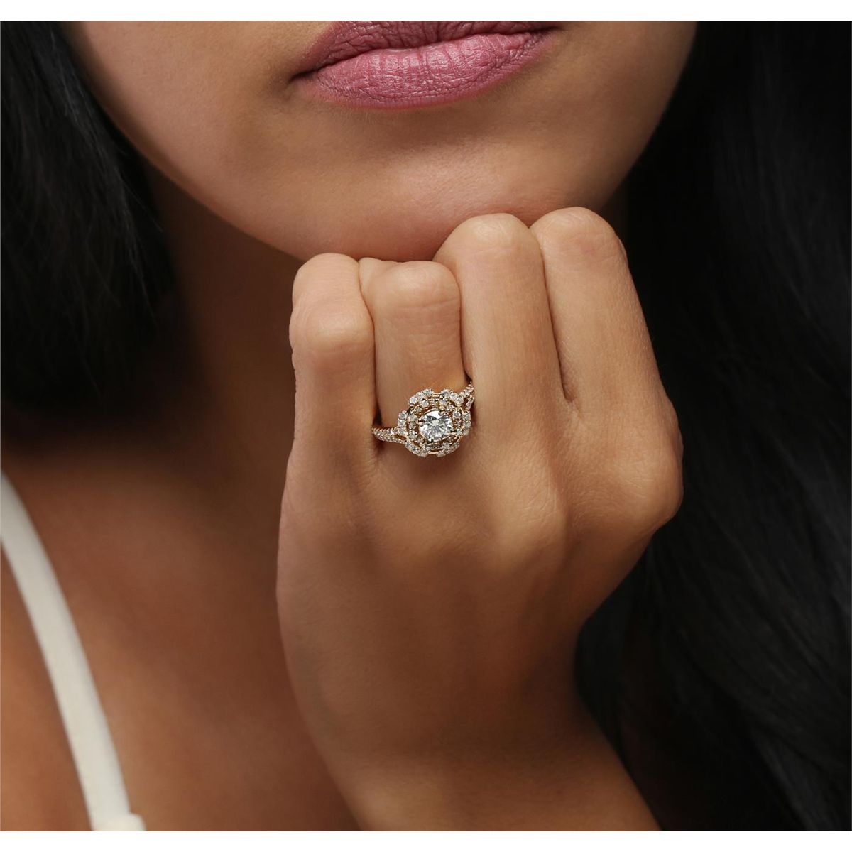 One electronically tested 14KT yellow gold ladies combination cast & assembled engagement ring with a split shank with a bright polish finish. Identified with markings of "14K". Condition is new. Containing: One prong set round brilliant cut diamond, measuring 5.40 - 5.40 x 3.24mm (depth est.) approximate weight of 0.58ct. Clarity: SI-1. Color: K, Cut is Very Good. Seventy prong set round brilliant cut diamonds, measuring 1.10 - 1.10 x 0.66mm (depth est.) approximate total weight of 70 Stones = 0.34ct. Clarity: I-1 to I-2. Color: J - K, Cut is Good. All diamonds are graded in the mounting, unless otherwise stated. Total Weight of Diamonds 0.91ct. Total Weight of Ring 4.40 grams. GGL Appraised at $6,285.00.
