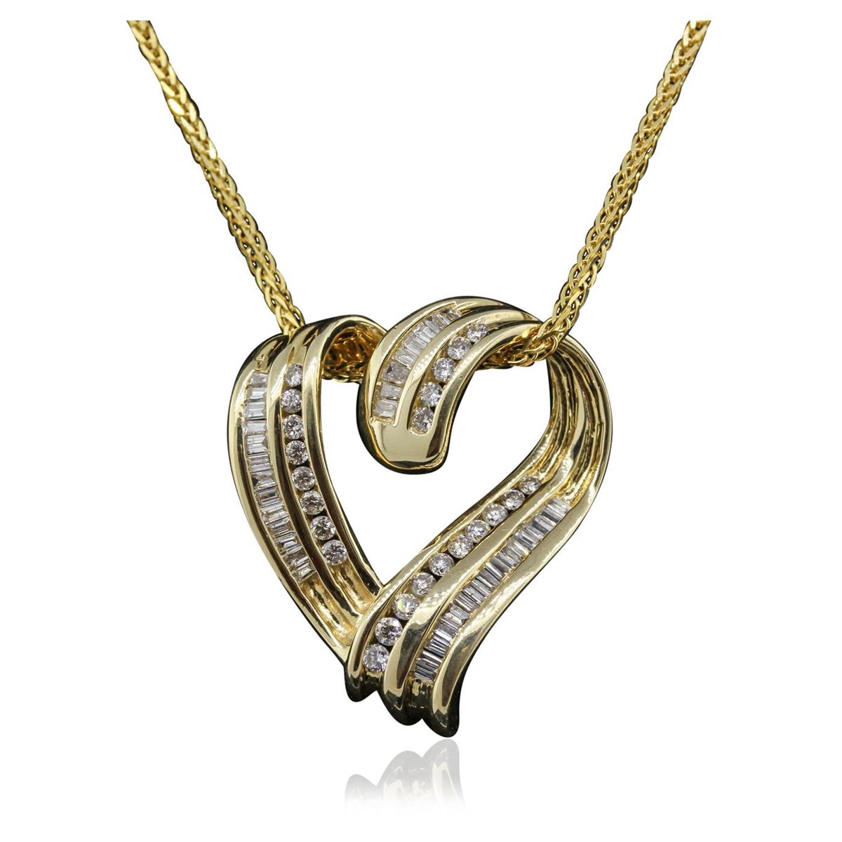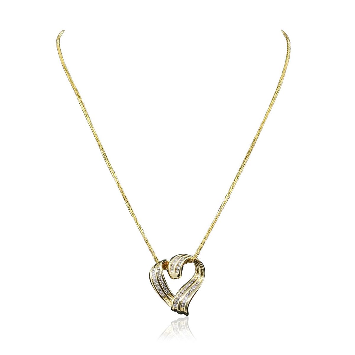 One electronically tested 14KT yellow gold ladies cast and assembled diamond pendant with chain. Condition is new, good workmanship. The pendant features a diamond set heart. The pendant is supported by an eighteen inch length 14KT yellow gold designer style chain, terminating in a lobster claw clasp. Bright polish finish. Identified with markings of "K14". Containing: Twenty-three channel set round brilliant cut diamonds, measuring 1.60 - 1.50 x 0.93mm (depth est) approximate total weight of 23 Stones = 0.41ct. Graded in the setting. Clarity SI-2 to I-1 Color G-I. Thirty-six channel set baguette cut diamonds, measuring from 1.70 x 0.90 x 0.63mm (depth est) to 1.80 x 1.20 x 0.84mm (depth est) 0.90% GTCF approximate total weight of 36 Stones = 0.51ct. Graded in the setting. Clarity VS-1 to SI-1 Color G-I. Total weight of diamonds 0.92ct. Total weight of pendant with chain 9.60 grams. AIG Appraised at $4,920.00.