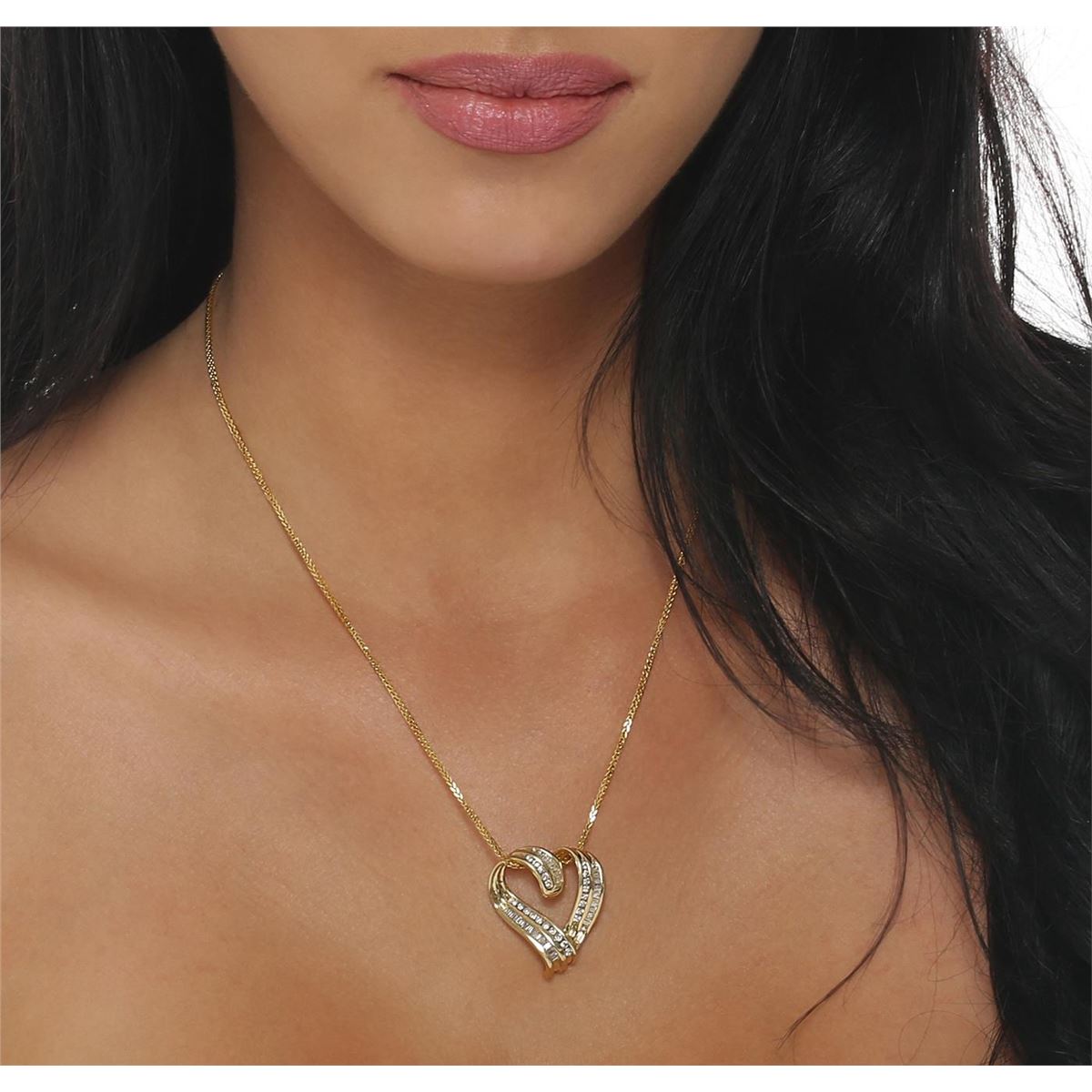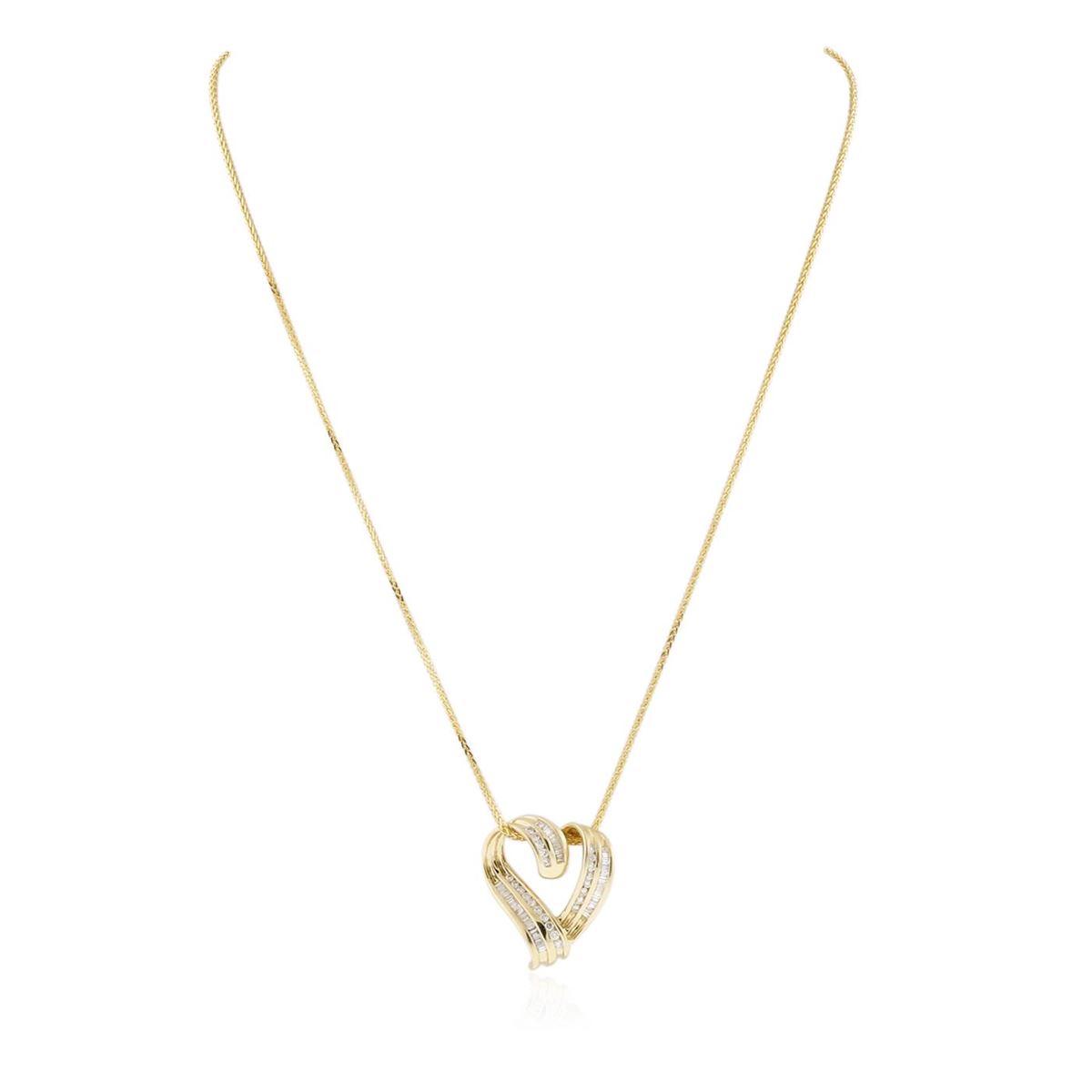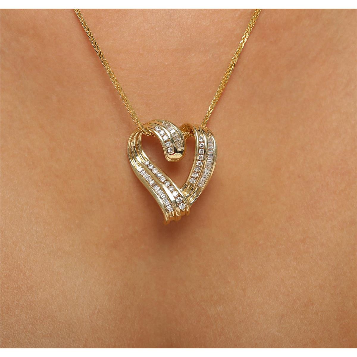 One electronically tested 14KT yellow gold ladies cast and assembled diamond pendant with chain. Condition is new, good workmanship. The pendant features a diamond set heart. The pendant is supported by an eighteen inch length 14KT yellow gold designer style chain, terminating in a lobster claw clasp. Bright polish finish. Identified with markings of "K14". Containing: Twenty-three channel set round brilliant cut diamonds, measuring 1.60 - 1.50 x 0.93mm (depth est) approximate total weight of 23 Stones = 0.41ct. Graded in the setting. Clarity SI-2 to I-1 Color G-I. Thirty-six channel set baguette cut diamonds, measuring from 1.70 x 0.90 x 0.63mm (depth est) to 1.80 x 1.20 x 0.84mm (depth est) 0.90% GTCF approximate total weight of 36 Stones = 0.51ct. Graded in the setting. Clarity VS-1 to SI-1 Color G-I. Total weight of diamonds 0.92ct. Total weight of pendant with chain 9.60 grams. AIG Appraised at $4,920.00.
