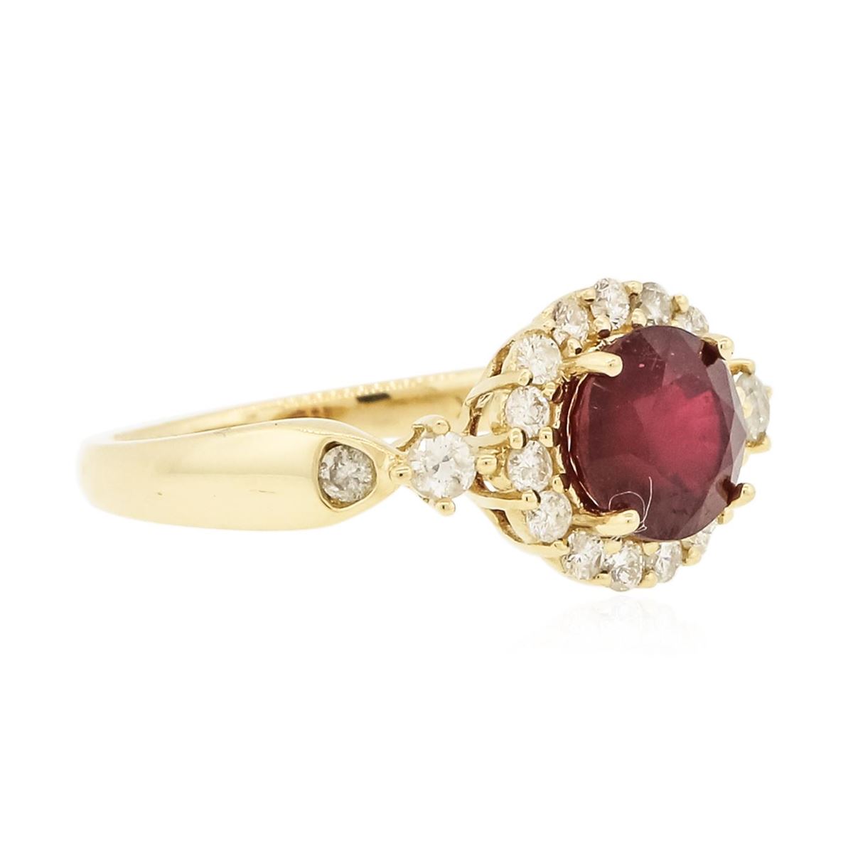 One electronically tested 14KT yellow gold ladies cast ruby and diamond ring with a bright polish finish. The featured ruby is set within a diamond bezel supported by diamond set shoulders, completed by a one and one-half millimeter wide band. Trademark is Orianne. Identified with markings of "14K". Condition is new, good workmanship. Containing: One prong set round brilliant cut natural ruby, measuring 6.65 - 6.60 x 2.45 mm, 8% bulge factor, approximate weight of 0.94ct., clarity is heavily included, type II, dark, very slightly brownish, slightly purplish red color, (GIA slpR 7/3), cut is good. Transmitting light somewhat diffusely, transparent to translucent. Naturally occurring internal & external characteristics are present. Indications of laboratory high temperature heat treatment, with glass & flux additives. Graded in the setting. Ruby has a low tolerance to rhodium plating, repolishing the surface, & ultrasonic cleaning.Nineteen prong set round brilliant cut diamonds, measuring 2.20 - 1.80 x 1.20mm (depth est.) approximate total weight of 19 Stones = 0.65ct. Graded in the setting. Clarity: SI-2 to I-1. Color: G - I. Total Weight of Colored Stones 0.94ct. Total Weight of Diamonds 0.65ct. Total Weight of Ring 3.38 grams. AIG Appraised at $2,590.00.