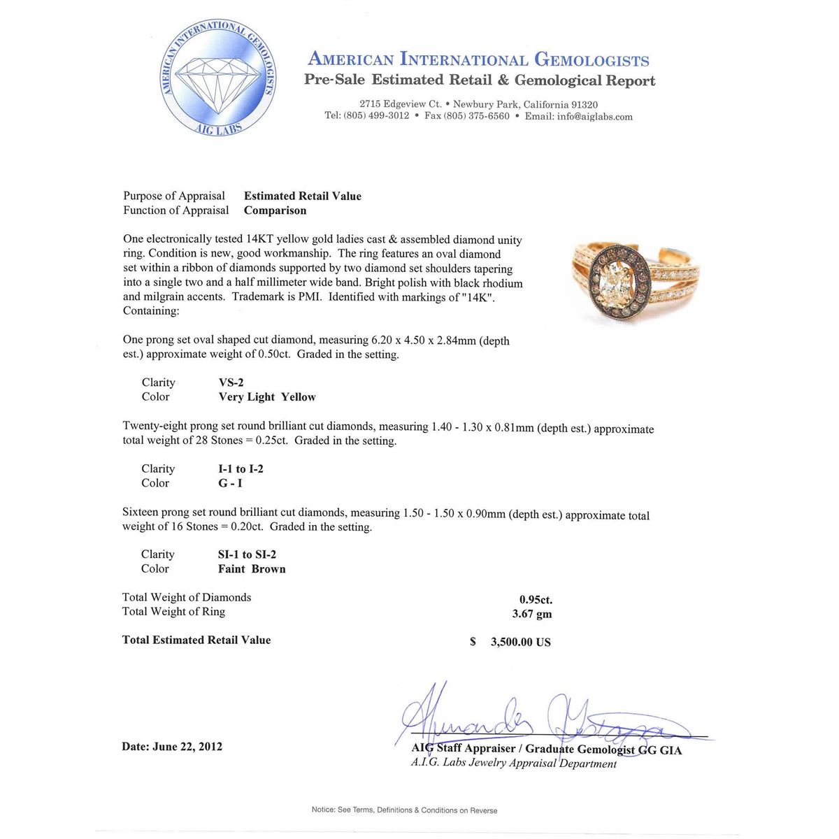 One electronically tested 14KT yellow gold ladies cast & assembled diamond unity ring. Condition is new, good workmanship. The ring features an oval diamond set within a ribbon of diamonds supported by two diamond supported by two diamond set shoulders tapering into a single two and a half millimeter wide band. Bright polish with black rhodium and migraine accents. Trademark is PMI. Identified with markings of "14K". Containing: One prong set oval shaped cut diamond, measuring 6.20 x 4.50 x 2.84mm (depth est.) approximate weight of 0.50ct. Graded in the setting. Clarity: VS-2. Color: Very Light Yellow. Twenty-eight prong set round brilliant cut diamonds, measuring 1.40 - 1.30 x 0.81mm (depth est.) approximate total weight of 28 Stones = 0.25ct. Graded in the setting. Clarity: I-1 to I-2. Color: G-I. Sixteen prong set round brilliant cut diamonds, measuring 1.50 - 1.50 x 0.90mm (depth est.) approximate total weight of 16 Stones = 0.20ct. Graded in the setting. Clarity: SI-1 to SI-2. Color: Faint Brown. Total Weight of Diamonds: 0.95ct. Total Weight of Ring: 3.67gm. AIG Appraised at $3,500.00.