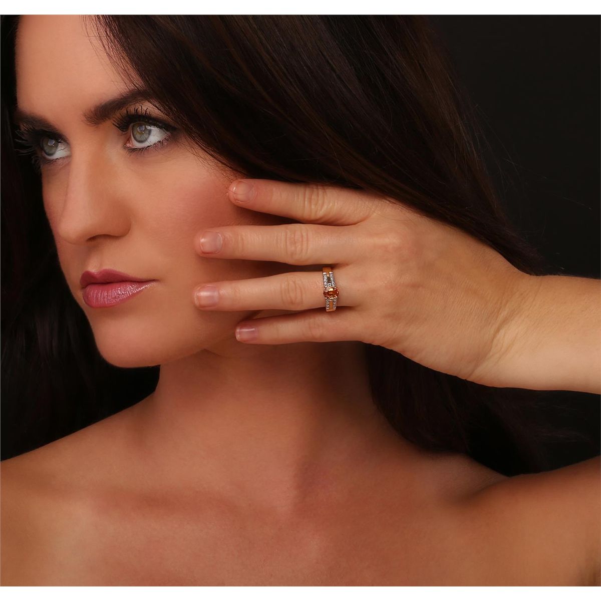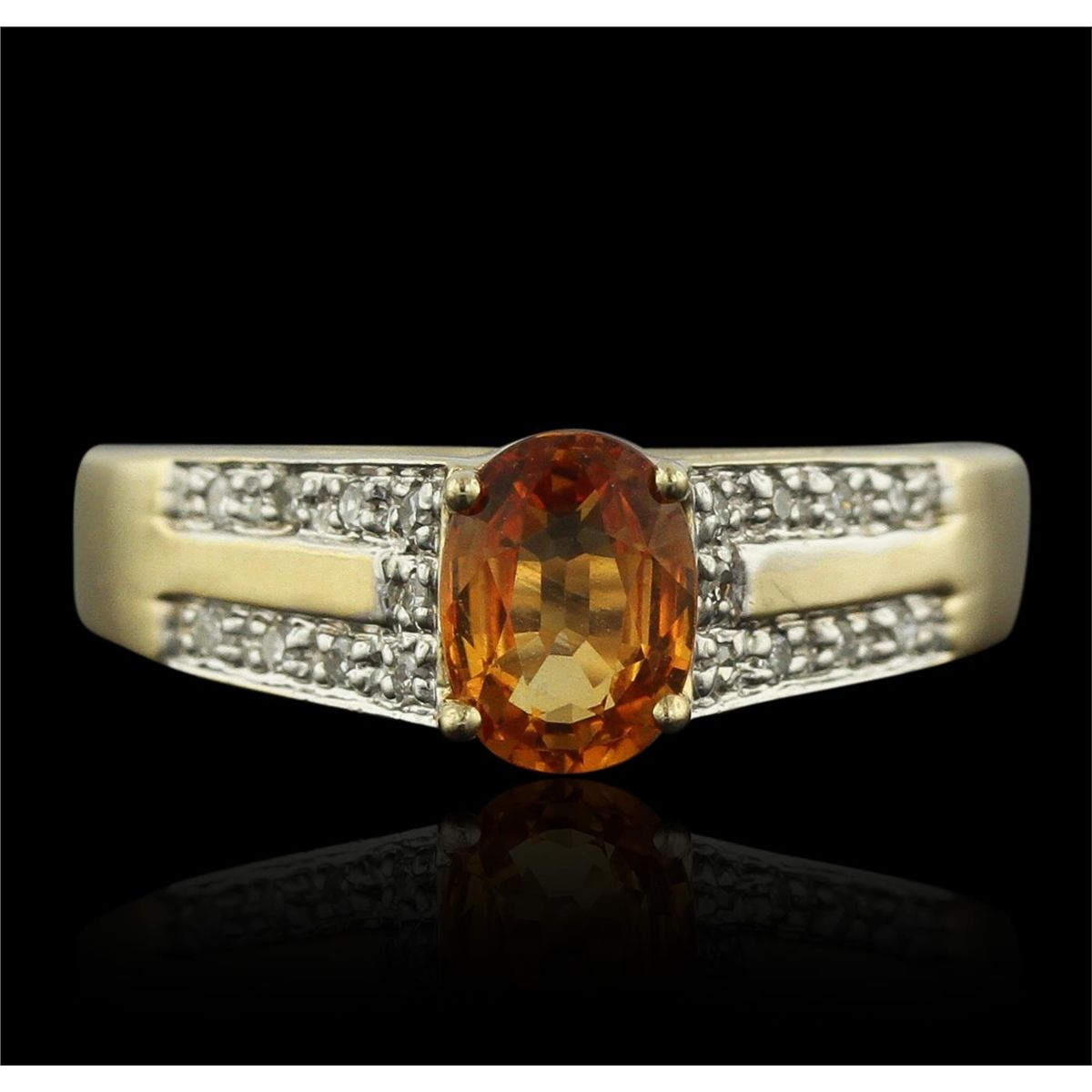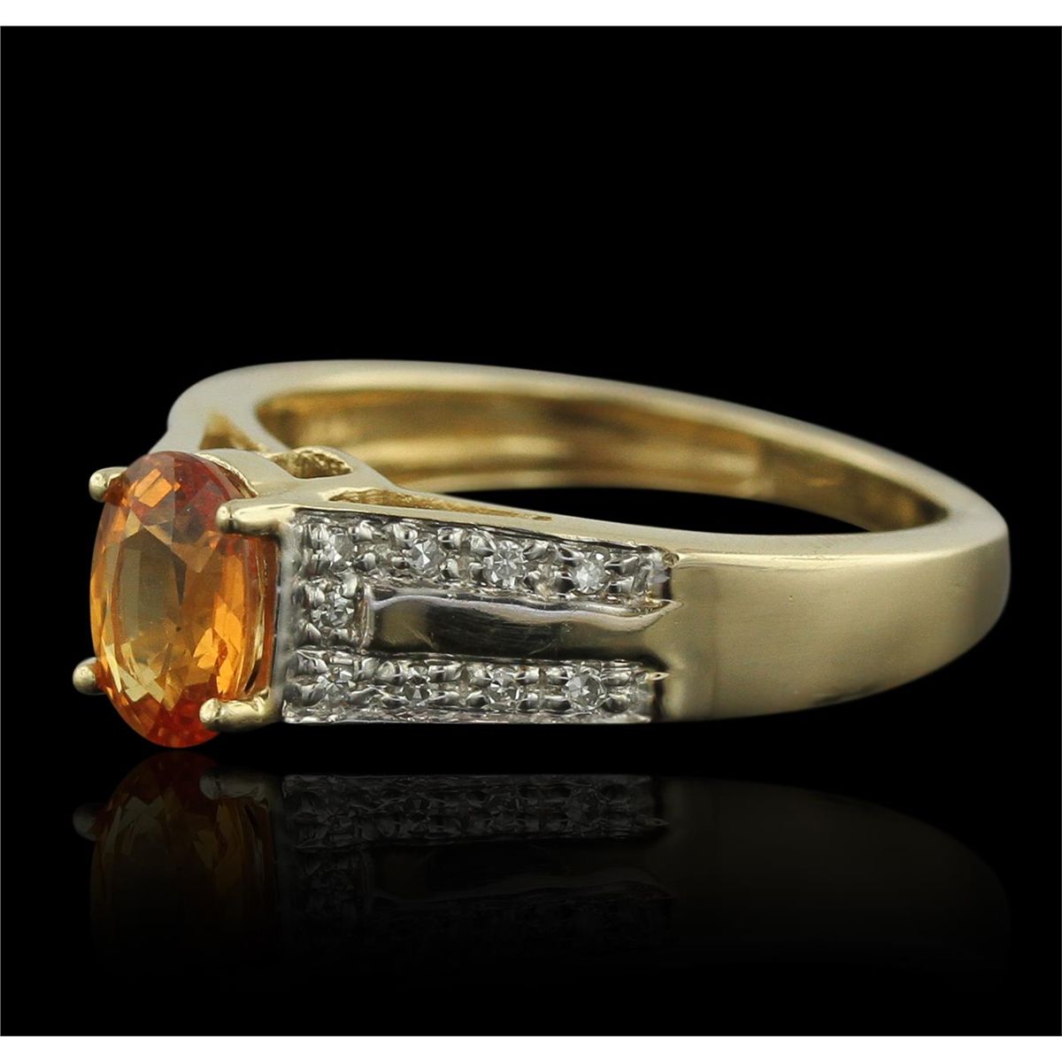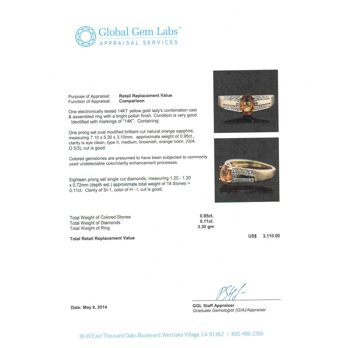 One electronically tested 14KT yellow gold Ladies combination cast & assembled ring with a bright polish finish. Condition is very good. Identified with markings of "14K". Containing: One prong set oval modified brilliant cut natural orange sapphire, measuring 7.10 x 5.30 x 3.10mm, approximate weight of 0.95ct., clarity is eye clean, type II, medium, brownish, orange color, (GIA O 5/3), cut is good. Colored gemstones are presumed to have been subjected to commonly used undetectable color/clarity enhancement processes. Eighteen prong set single cut diamonds, measuring 1.20 - 1.20 x 0.72mm (depth est.) approximate. Total Weight of 18 Stones = 0.11ct. Clarity: SI-1. Color: H - I, Cut is Good. Total Weight of Colored Stones 0.95ct. Total Weight of Diamonds 0.11ct. Total Weight of Ring 3.30 grams. GGL Appraised at $3,110.00.