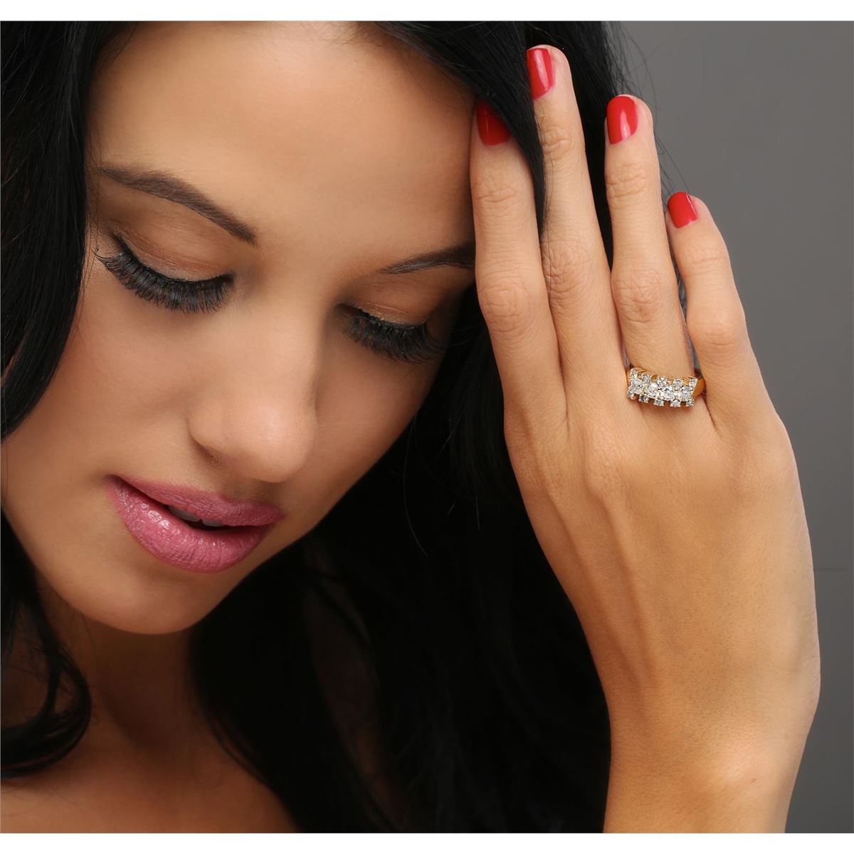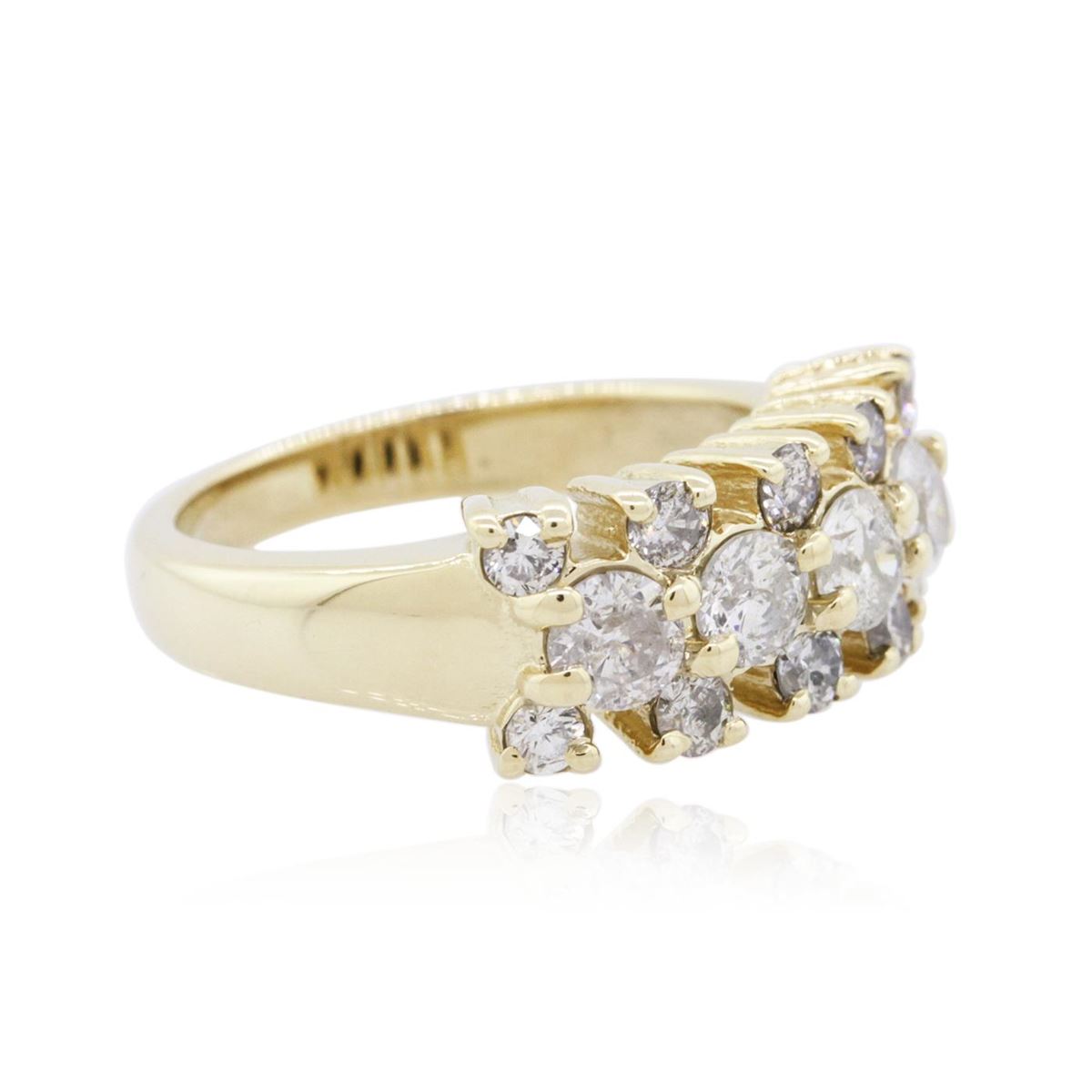 One electronically tested 14KT yellow gold ladies combination cast & assembled diamond ring with a bright polish finish. Identified with markings of "14K". Condition is new. Containing: Four prong set round brilliant cut diamonds, measuring 3.50 - 3.50 x 2.10mm (depth est.) approximate total weight of 4 Stones = 0.63ct. Clarity: I-2. Color: K, Cut is Good. Ten prong set round brilliant cut diamonds, measuring 2.10 - 2.10 x 1.26mm (depth est.) approximate total weight of 10 Stones = 0.34ct. Clarity: I-1 to I-2. Color: K - L, Cut is Good. All diamonds are graded in the mounting, unless otherwise stated. Total Weight of Diamonds 0.97ct. Total Weight of Ring 6.50 grams. GGL Appraised at $4,415.00.