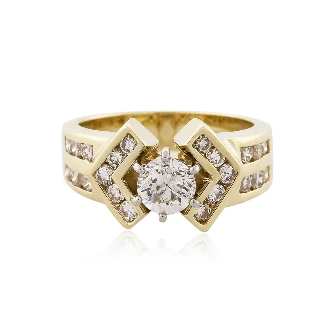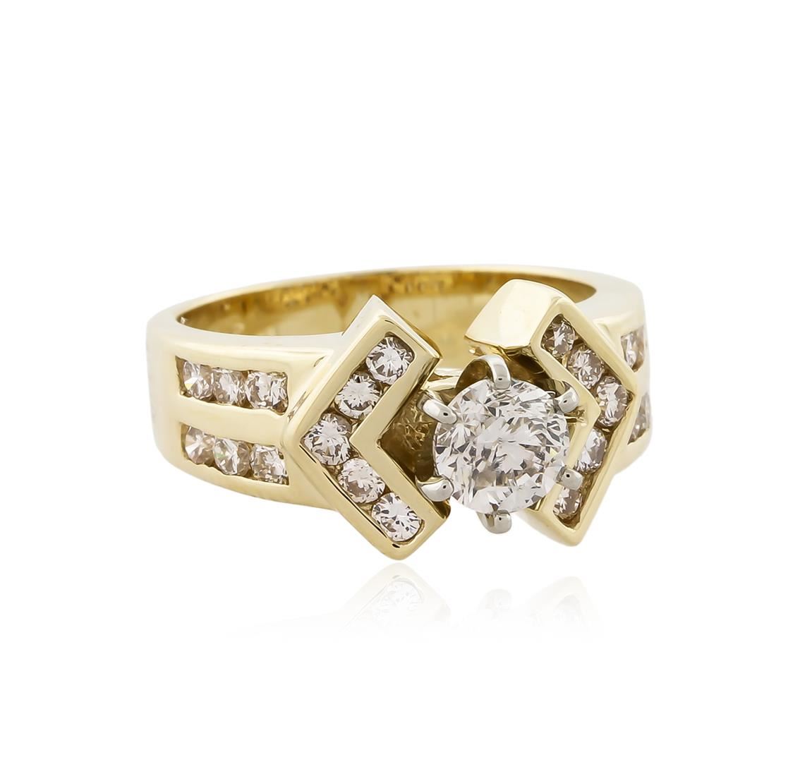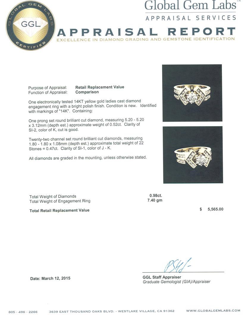 One electronically tested 14KT yellow gold ladies cast diamond engagement ring with a bright polish finish. Identified with markings of "14K". Condition is new. Containing: One prong set round brilliant cut diamond, measuring 5.20 - 5.20 x 3.12mm (depth est.) approximate weight of 0.52ct. Clarity: SI-2. Color: K, Cut is Good. Twenty-Two channel set round brilliant cut diamonds, measuring 1.80 - 1.80 x 1.08mm (depth est.) approximate total weight of 22 Stones = 0.47ct. Clarity: SI-1. Color: J - K. All diamonds are graded in the mounting, unless otherwise stated. Total Weight of Diamonds 0.98ct. Total Weight of Engagement Ring 7.40 grams. GGL Appraised at $5,565.00.