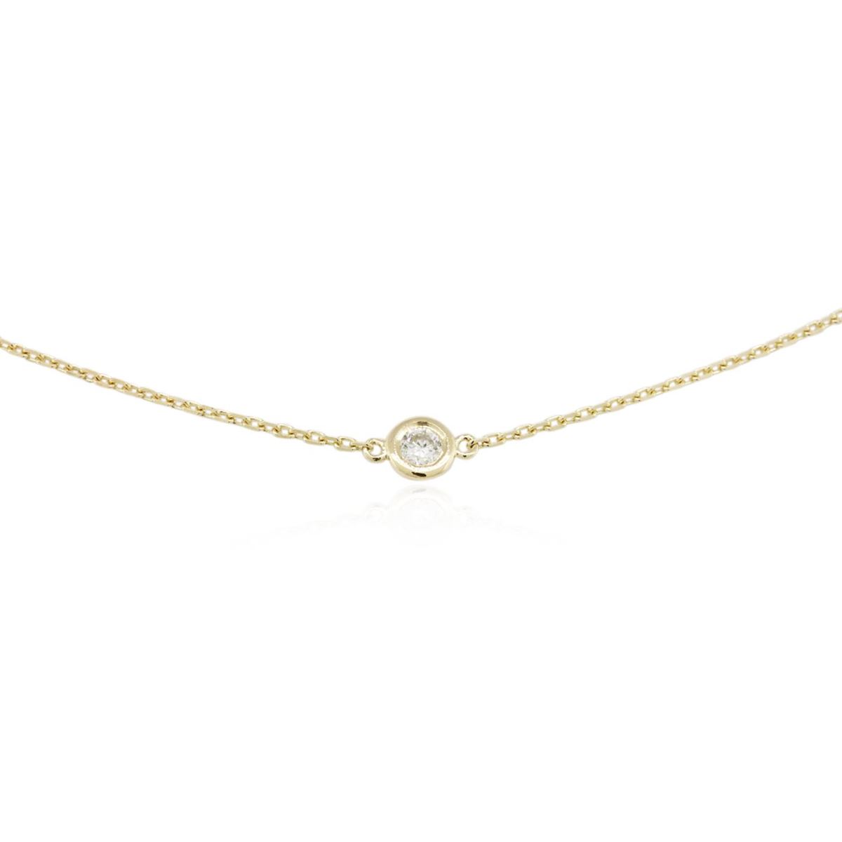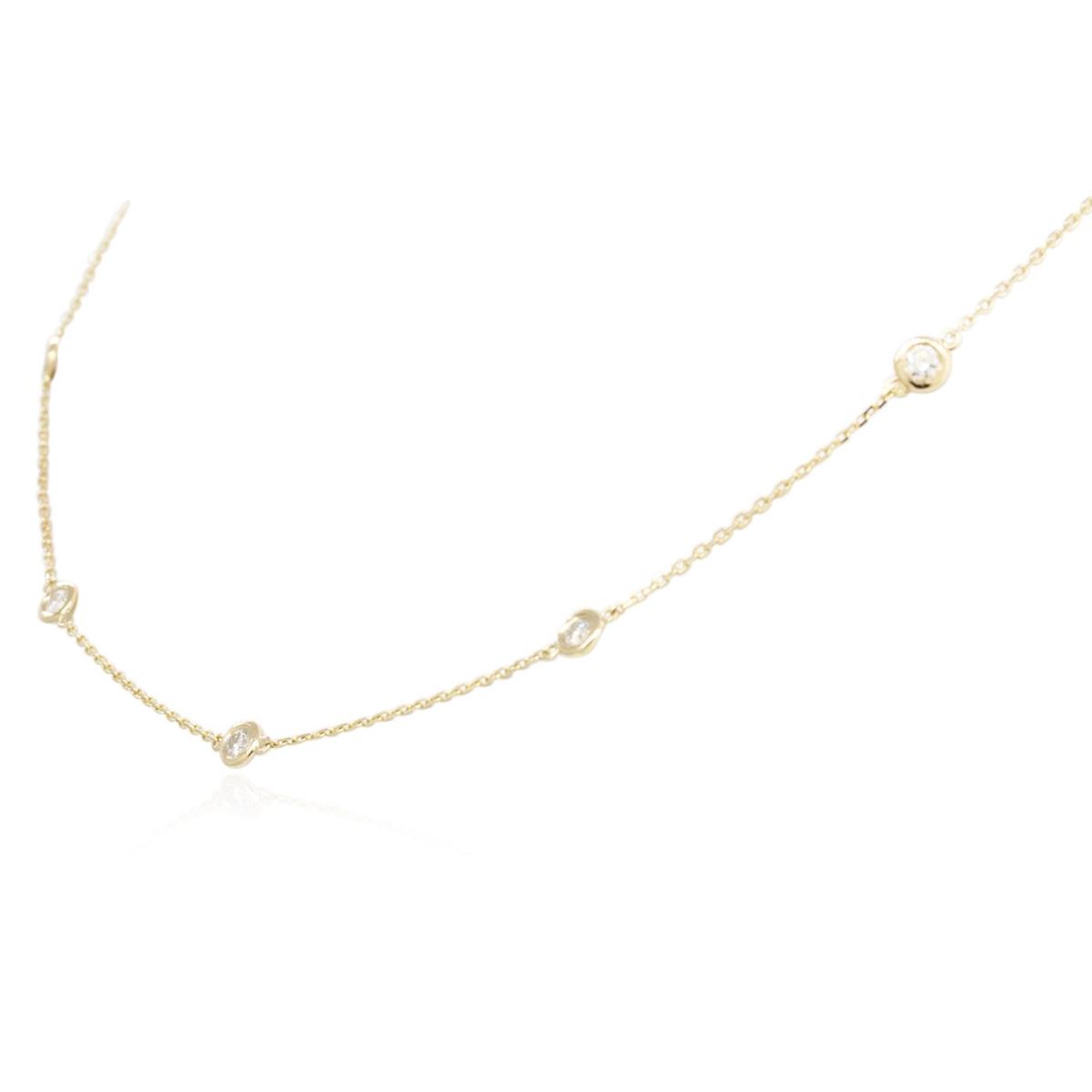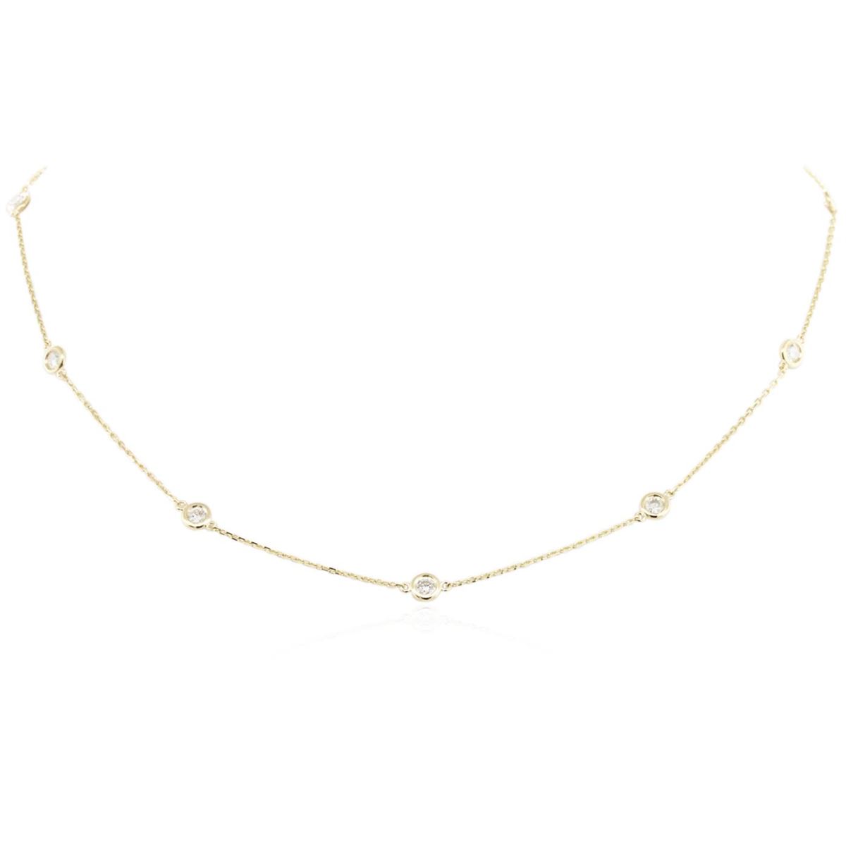 One electronically tested 14KT yellow gold ladies cast diamond necklace with a lobster claw clasp with a bright polish finish. Measurements: 18" in length Identified with markings of "K14". Condition is new. Containing: Ten bezel set round brilliant cut diamonds, measuring 3.00 - 3.00 x 1.80mm (depth est.) approximate total weight of 10 Stones = 0.99ct. Clarity: SI-1 to I-1. Color: K, Cut is Good. All diamonds are graded in the mounting, unless otherwise stated. Total Weight of Diamonds 0.99ct. Total Weight of Necklace 4.20 grams. GGL Appraised at $3,035.00.