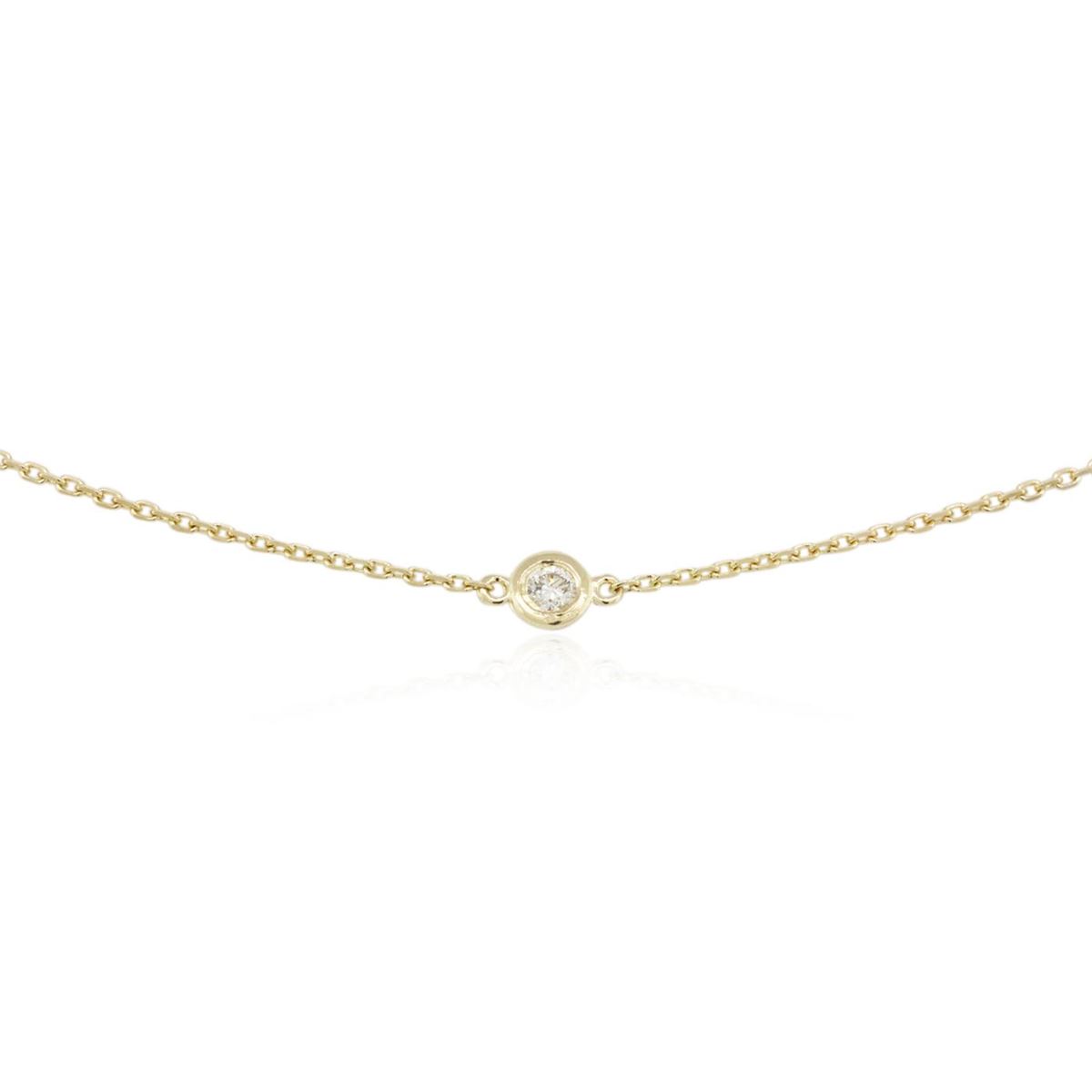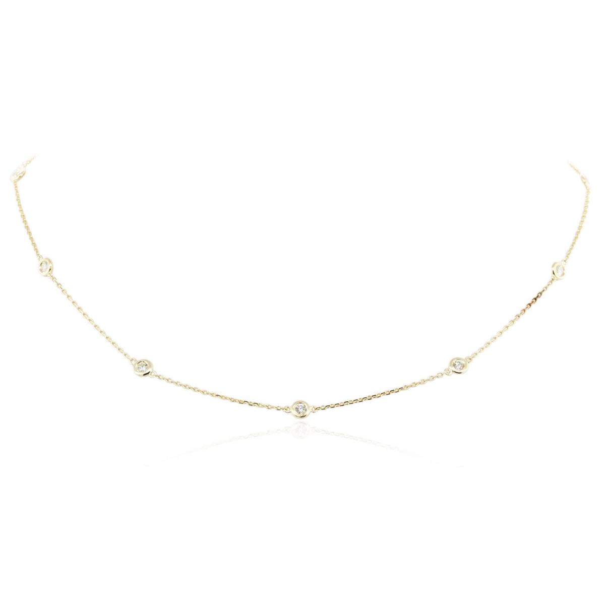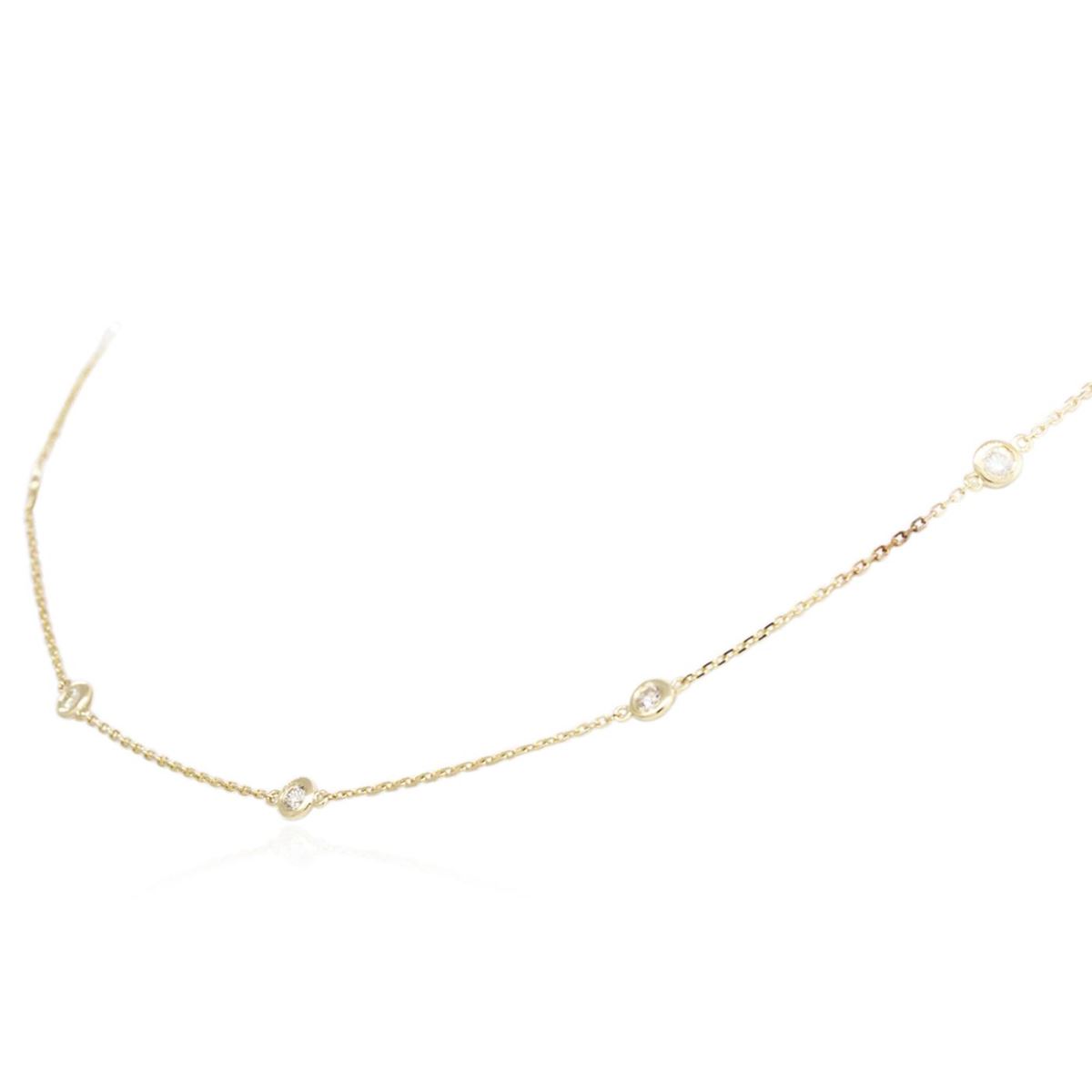 One electronically tested 14KT yellow gold ladies cast diamond necklace with a lobster claw clasp with a bright polish finish. Measurements: 18" in length Identified with markings of "K14". Condition is new. Containing: Ten bezel set round brilliant cut diamonds, measuring 3.00 - 3.00 x 1.80mm (depth est.) approximate total weight of 10 Stones = 0.99ct. Clarity: SI-1 to SI-2. Color: K, Cut is Good. All diamonds are graded in the mounting, unless otherwise stated. Total Weight of Diamonds 0.99ct. Total Weight of Necklace 3.90 grams. GGL Appraised at $2,935.00.