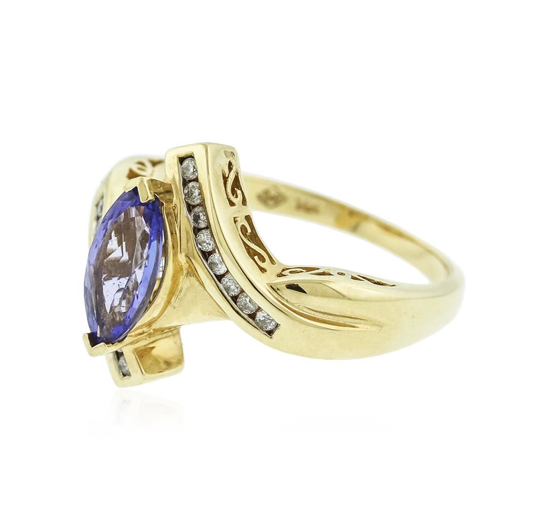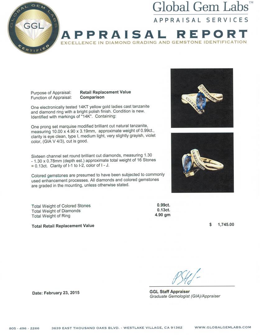 One electronically tested 14KT yellow gold ladies cast tanzanite and diamond ring with a bright polish finish. Identified with markings of "14K". Condition is new. Containing: One prong set marquise modified brilliant cut natural tanzanite, measuring 10.00 x 4.90 x 3.19mm, approximate weight of 0.99ct., clarity is eye clean, type I, medium light, very slightly grayish, violet color, (GIA V 4/3), cut is good. Sixteen channel set round brilliant cut diamonds, measuring 1.30 - 1.30 x 0.78mm (depth est.) approximate total weight of 16 Stones = 0.13ct. Clarity: I-1 to I-2. Color: I - J. Colored gemstones are presumed to have been subjected to commonly used enhancement processes. All diamonds and colored gemstones are graded in the mounting, unless otherwise stated. Total Weight of Colored Stones 0.99ct. Total Weight of Diamonds 0.13ct. Total Weight of Ring 4.90 grams. GGL Appraised at $1,745.00.
