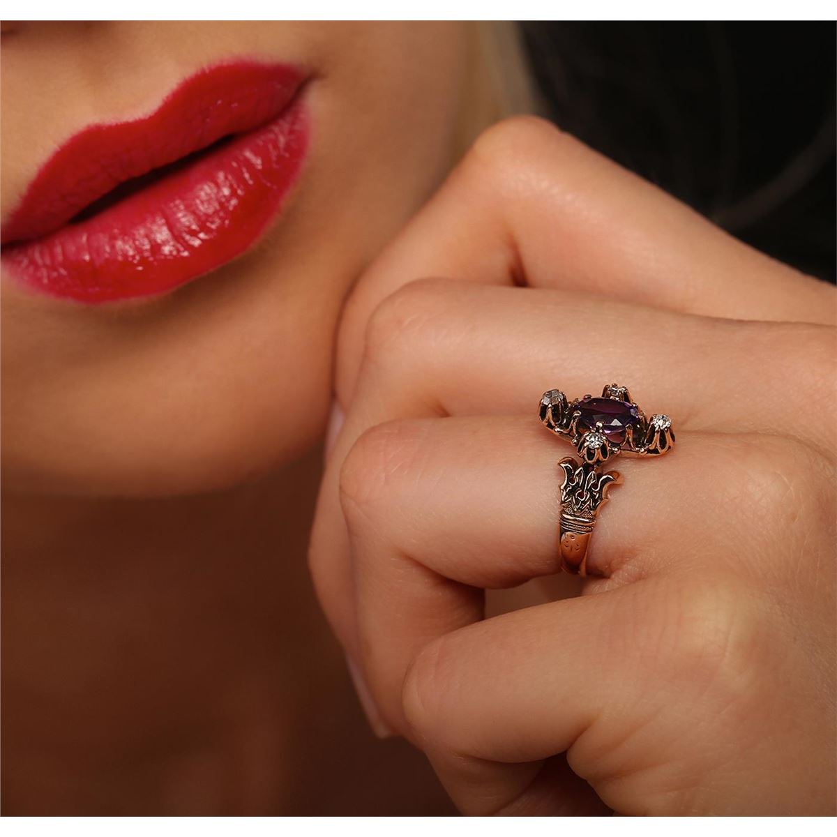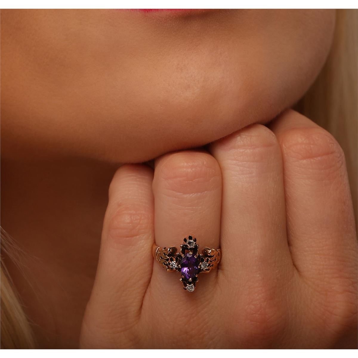 One electronically tested 14KT yellow gold ladies cast & assembled amethyst and diamond ring with a bright polish finish. Condition is good. The featured amethyst is is accented by four diamonds supported by carved shoulders, completed by a two and one-half millimeter wide band. Identified with markings of "14K". Containing: One prong set oval mixed cut natural amethyst, measuring 7.20 x 5.10 x 3.65mm, 15%. bulge factor, approximate weight of 1.00ct., clarity is slightly included, type II, medium dark, moderately strong, purple color, (GIA P 6/4), cut is good. Transmitting light with a minimum of distortion, transparent. Naturally occurring internal & external characteristics are present. Graded in the setting. Two prong set single cut diamonds, measuring 2.00. - 1.90 x 1.17mm (depth est.) approximate total weight of 2 Stones = 0.05ct. The clarity & color grade reflect the overall average for the pair. Graded in the setting. Clarity: SI-2. Color: H Two prong set rose cut diamonds, measuring 2.50 - 2.40 x 1.50mm (depth est.) approximate total weight of 2 Stones = 0.07ct. The clarity & color grade reflect the overall average for the pair. Graded in the setting. Clarity: SI-2. Color: H. Total Weight of Colored Stones 1.00ct. Total Weight of Diamonds 0.12ct. Total Weight of Ring 3.38 grams. AIG Appraised at $975.00.