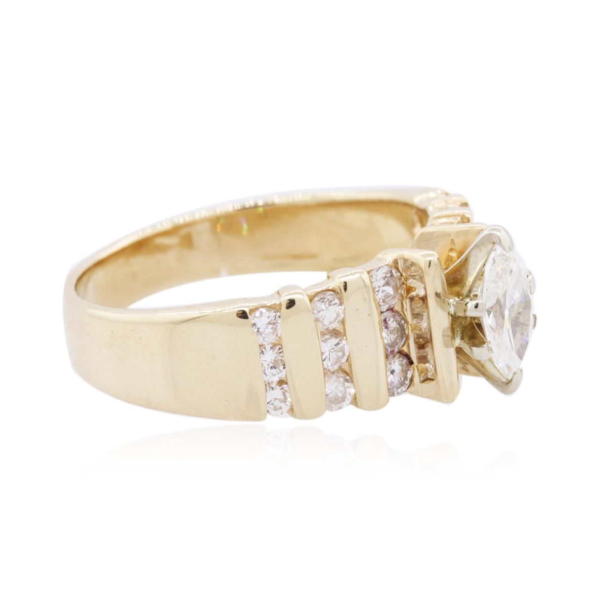 One ring featuring: 14KT yellow gold weighing 5.60 grams containing one marquise cut diamond center stone with a total weight of 0.34ct and round cut diamond side stones with a total weight of 0.66cts.