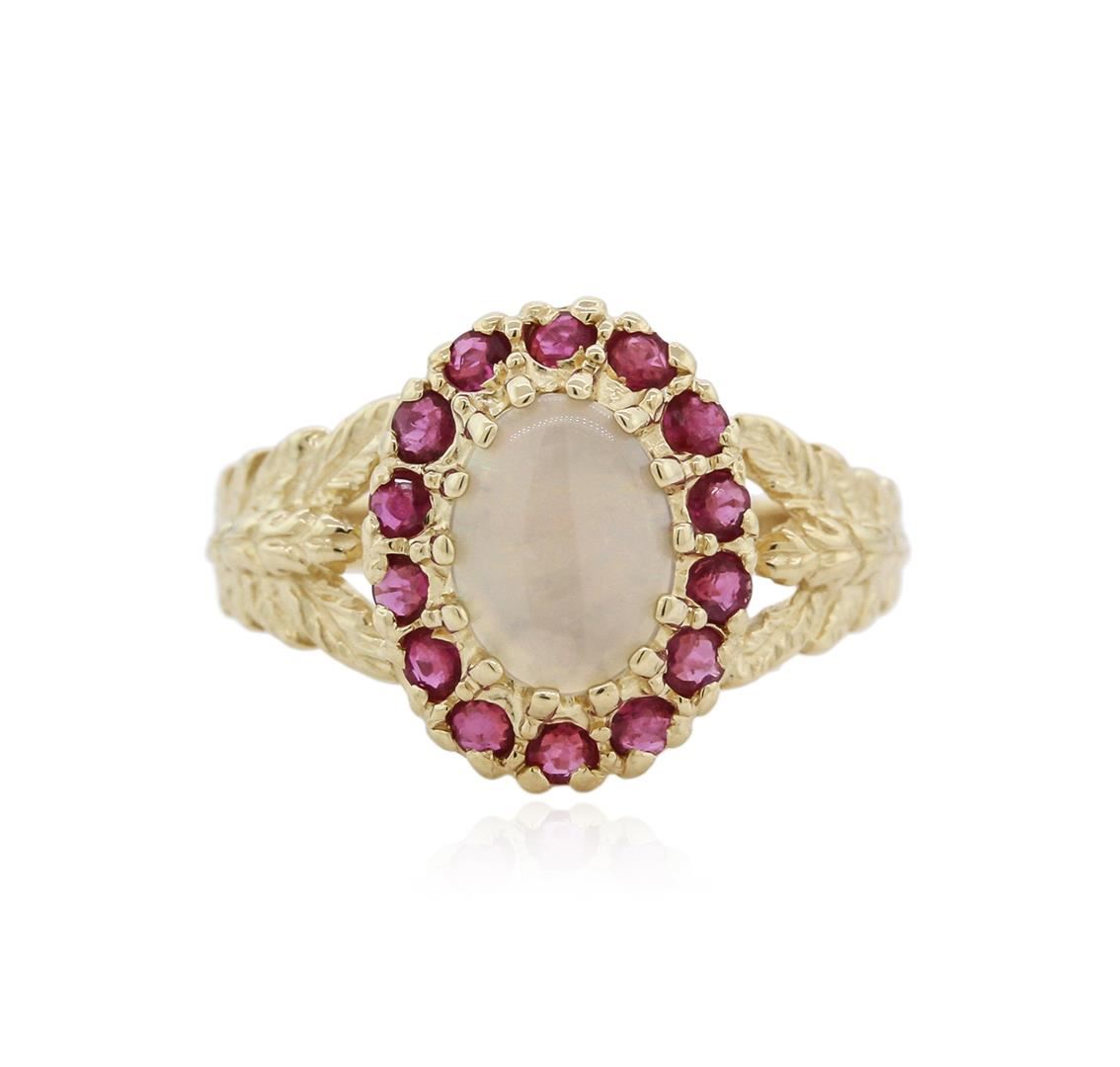 One ring featuring: 14KT yellow gold weighing 3.16 grams containing one opal center stone with a total weight of 1.00ct and ruby side stones with a total weight of 0.30ct.