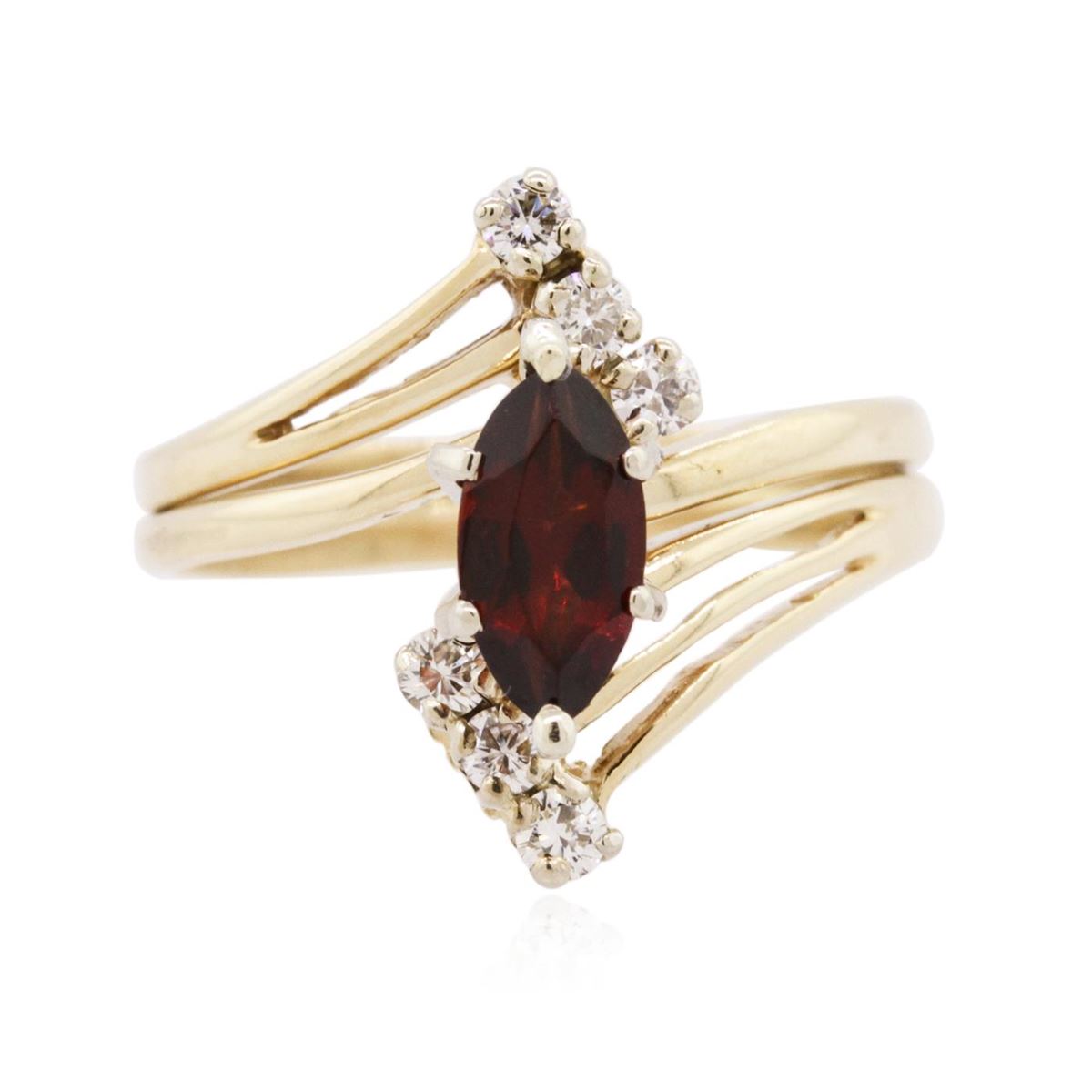 One ring featuring: 14KT yellow gold weighing 3.70 grams containing one garnet center stone with a total weight of 1.00ct and round diamonds with a total weight of 0.18cts.