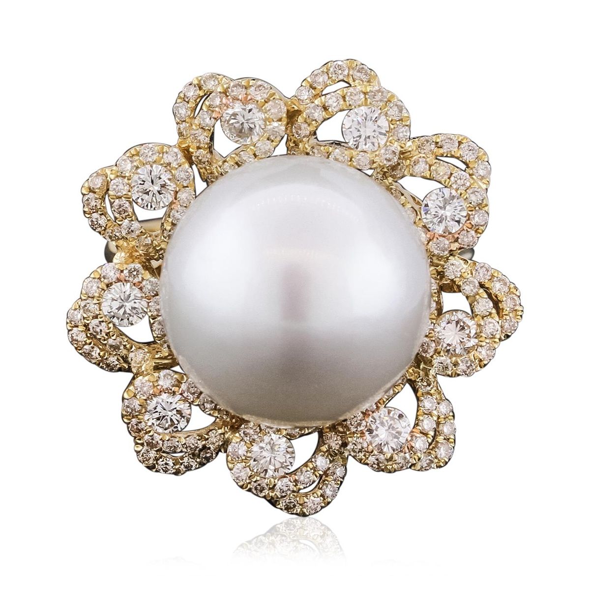One electronically tested 14KT yellow gold ladies combination cast & assembled ring with a cathedral shank with a bright polish finish. Identified with markings of "14K". Condition is new. Containing: Nine prong set round brilliant cut diamonds, measuring 2.50 - 2.50 x 1.50mm (depth est.) approximate total weight of 9 Stones = 0.51ct. Clarity: VS-2. Color: J - K, Cut is Very Good. One Hundred Thirty-Five prong set round brilliant cut diamonds, measuring 1.00 - 1.00 x 0.60mm (depth est.) approximate total weight of 135 Stones = 0.49ct. Clarity: SI-1 to SI-2. Color: J, Cut is Good. One south sea cultured pearl, 14.8mm in size to 15.0mm in size. The pearl is white in color with a very good luster, round, lightly blemished Colored gemstones are presumed to have been subjected to commonly used enhancement processes. All diamonds and colored gemstones are graded in the mounting, unless otherwise stated. Total Weight of Diamonds 1.00ct. Total Weight of Ring 12.20 grams. GGL Appraised at $8,670.00.