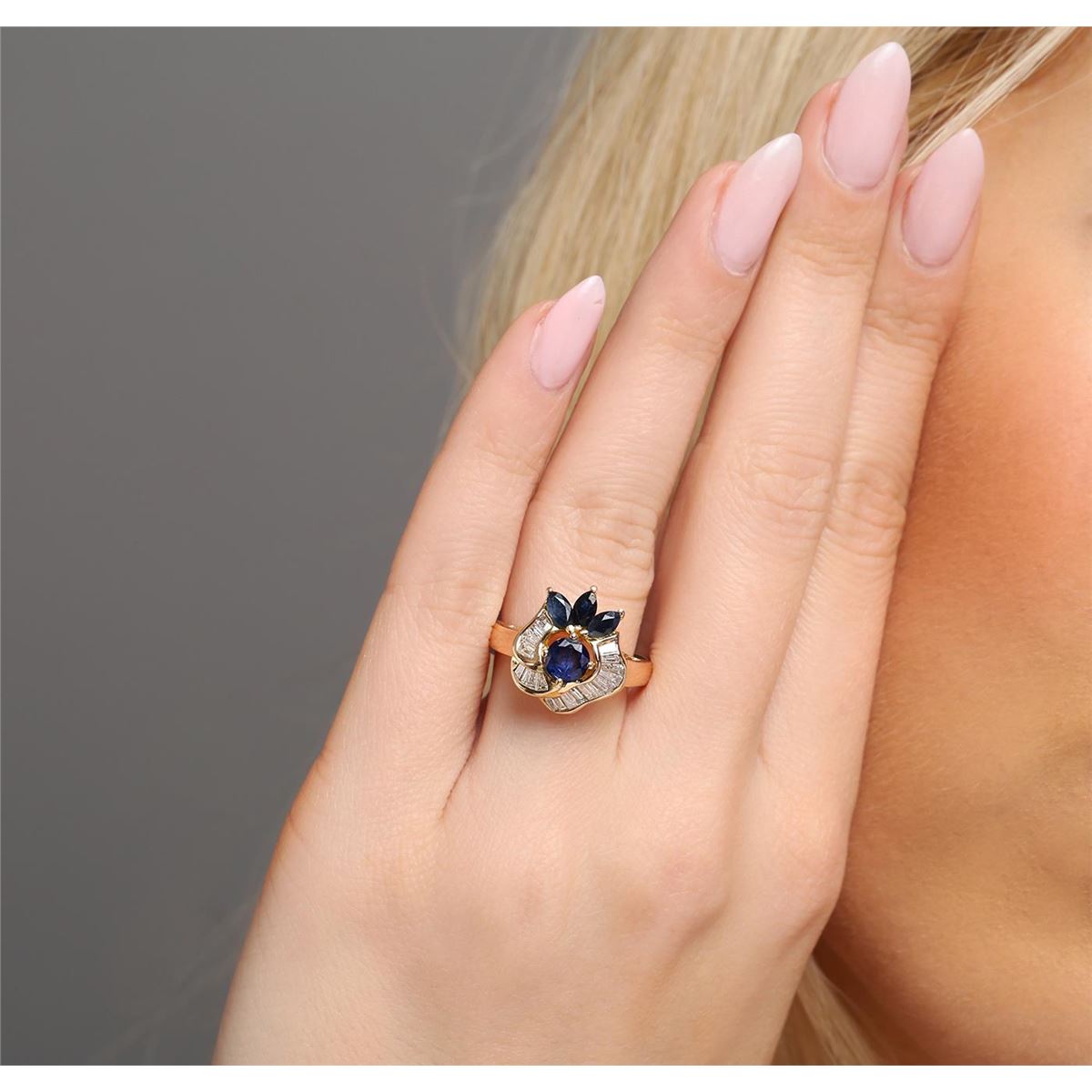 One ring featuring: 14KT yellow gold weighing 6.30 grams containing one sapphire center stone with a total weight of 0.66ct, three sapphire side stones with a total weight of 0.34cts, and baguette cut diamonds with a total weight of 0.50cts.