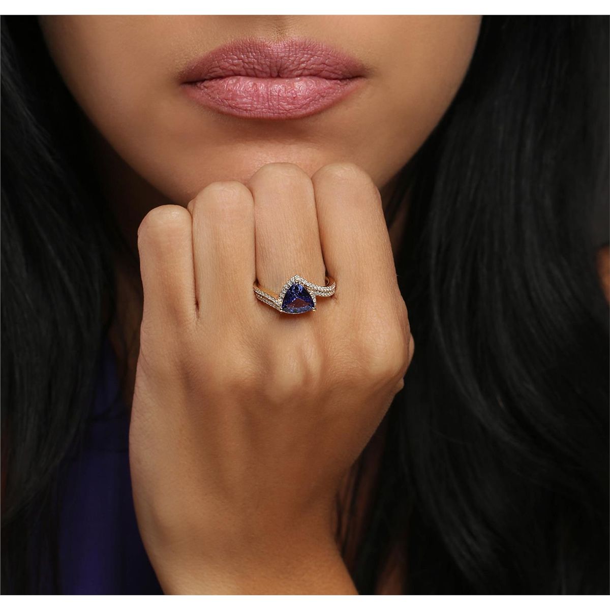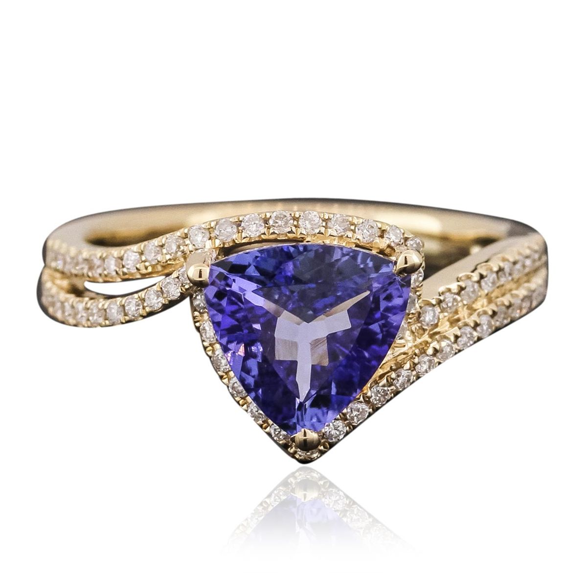 One electronically tested 14KT yellow gold ladies cast tanzanite and diamond ring with a bright polish finish. The featured tanzanite is set within a stylized diamond set bypass design, completed by a two and one-half millimeter wide band. Identified with markings of "14K". Condition is new, good workmanship. Containing: One prong set triangle mixed cut natural tanzanite, measuring 6.20 x 6.20 x 4.10mm, 8% bulge factor, approximate weight of 1.03ct., clarity is eye clean, type I, dark, very slightly grayish, violetish blue color, (GIA vB 7/3), cut is good. Transmitting light with no distortion, transparent. Graded in the setting. Tanzanite is a very rare gemstone that is only found in the country of Tanzania. Originally discovered in 1967. Tiffany & Company, named the stone Tanzanite. It is found in the Usumburu Mountains that border the Umba Valley of northern Tanzania. Tanzanite occurs in gray, brown, violet, blue, reddish-purple, & green. The gem is interesting because of its exceptional pleochroism. Rotated in different directions a tanzanite will exhibit multiple changes of color. Tanzanite has a low tolerance to ultrasonic cleaning, and should not be cleaned using this method. Sixty prong set round brilliant cut diamonds, measuring 1.10 - 1.00 x 0.63mm (depth est.) approximate total weight of 60 Stones = 0.35ct. Graded in the setting. Clarity: SI-2 to I-2. Color: G - I. Total Weight of Colored Stones 1.03ct. Total Weight of Diamonds 0.35ct. Total Weight of Ring 4.01 grams. AIG Appraised at $3,960.00.