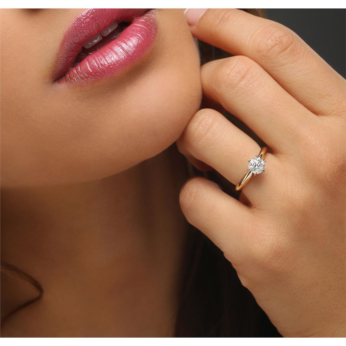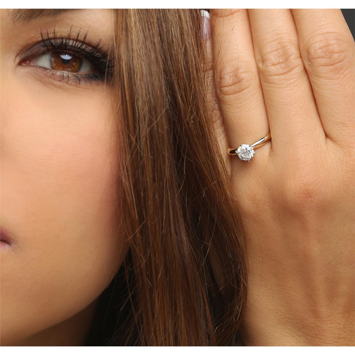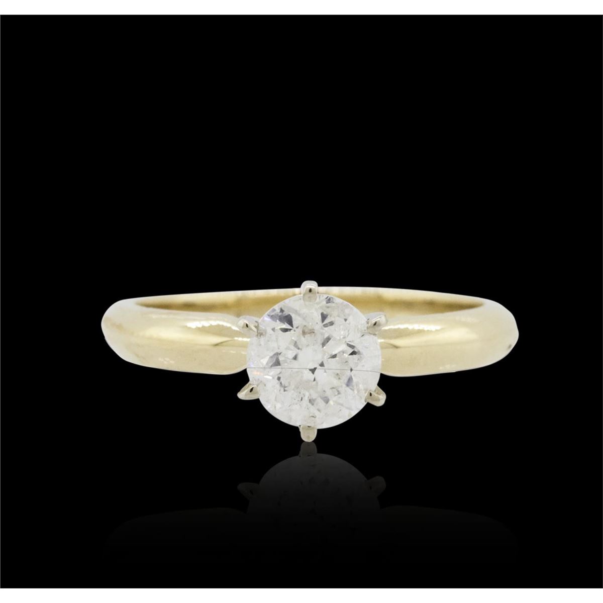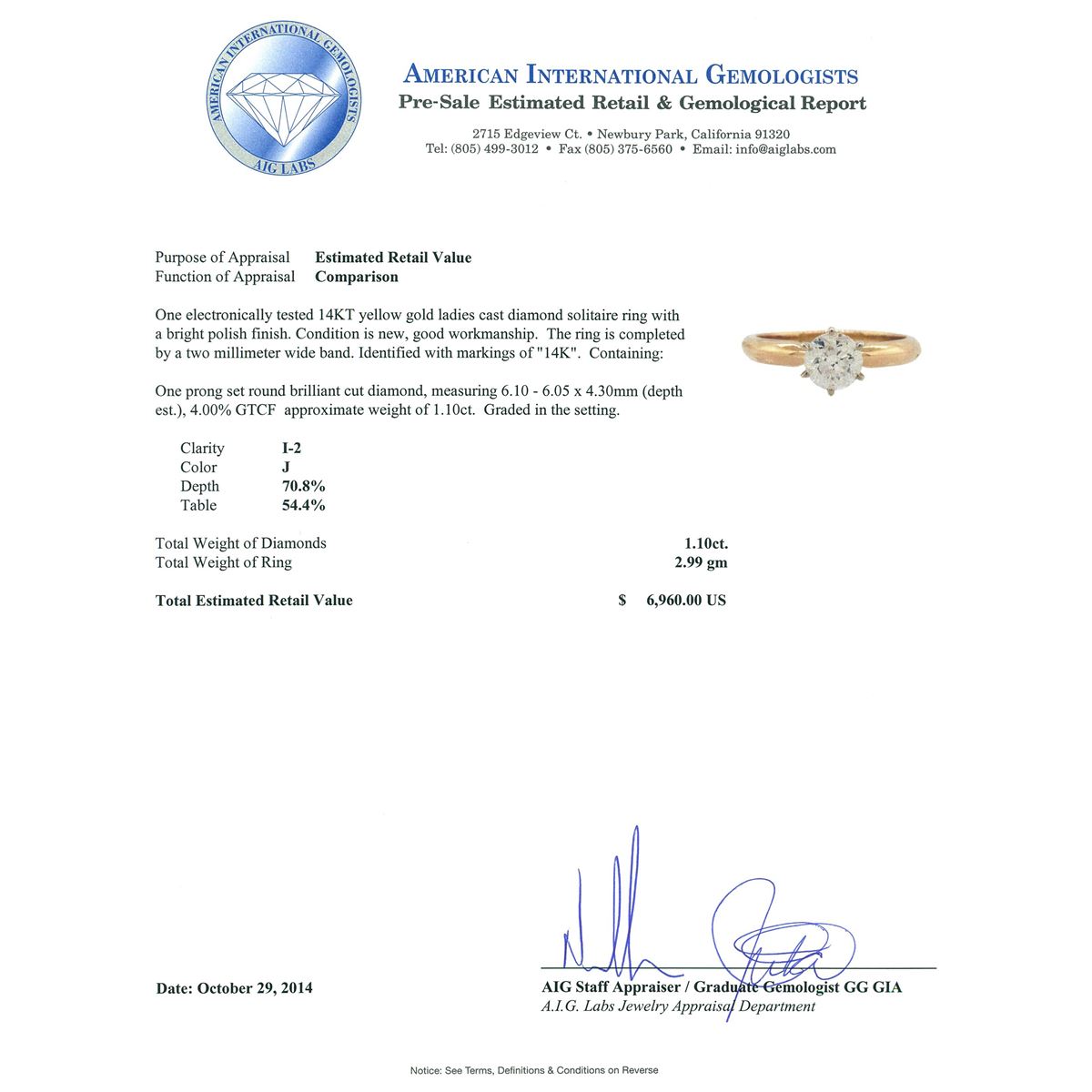 One electronically tested 14KT yellow gold ladies cast diamond solitaire ring with a bright polish finish. The ring is completed by a two millimeter wide band. Identified with markings of "14K". Condition is new, good workmanship. Containing: One prong set round brilliant cut diamond, measuring 6.10 - 6.05 x 4.30mm (depth est.), 4.00.%. GTCF approximate weight of 1.10ct. Graded in the setting. Clarity: I-2. Color: 70.8%. Table 54.4%. Total Weight of Diamonds 1.10ct. Total Weight of Ring 2.99 grams. AIG Appraised at $6,960.00.