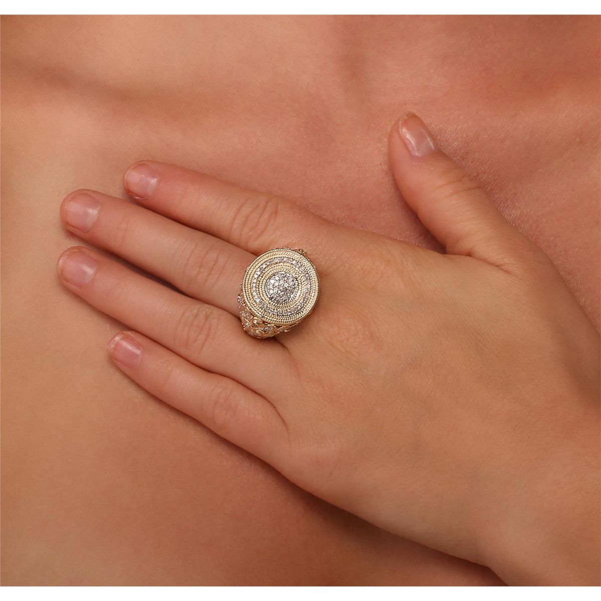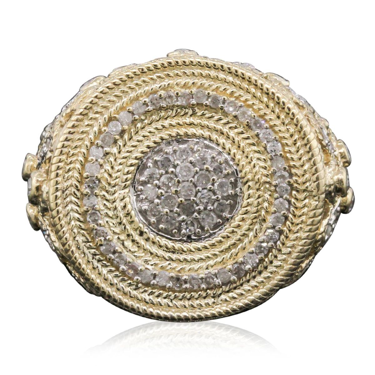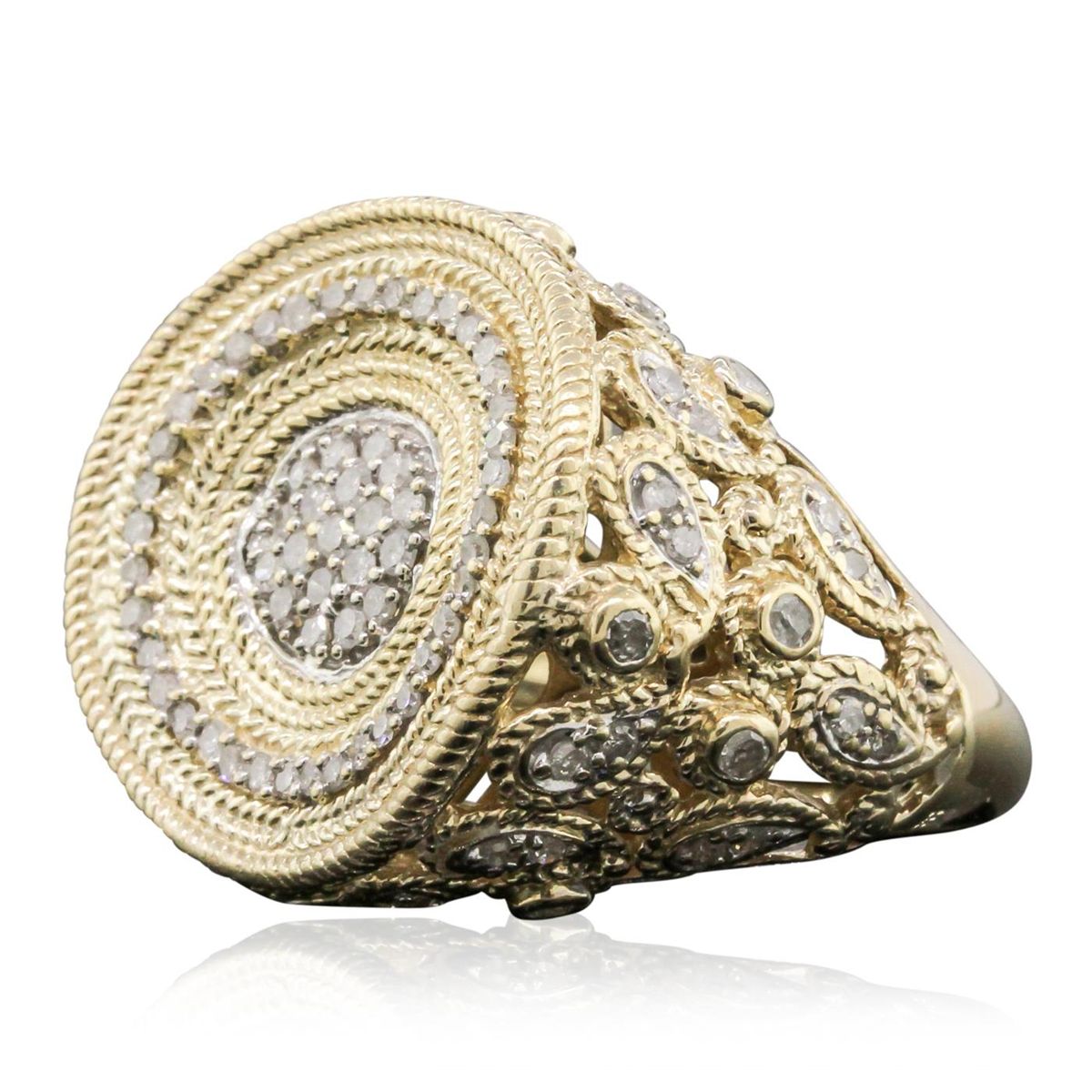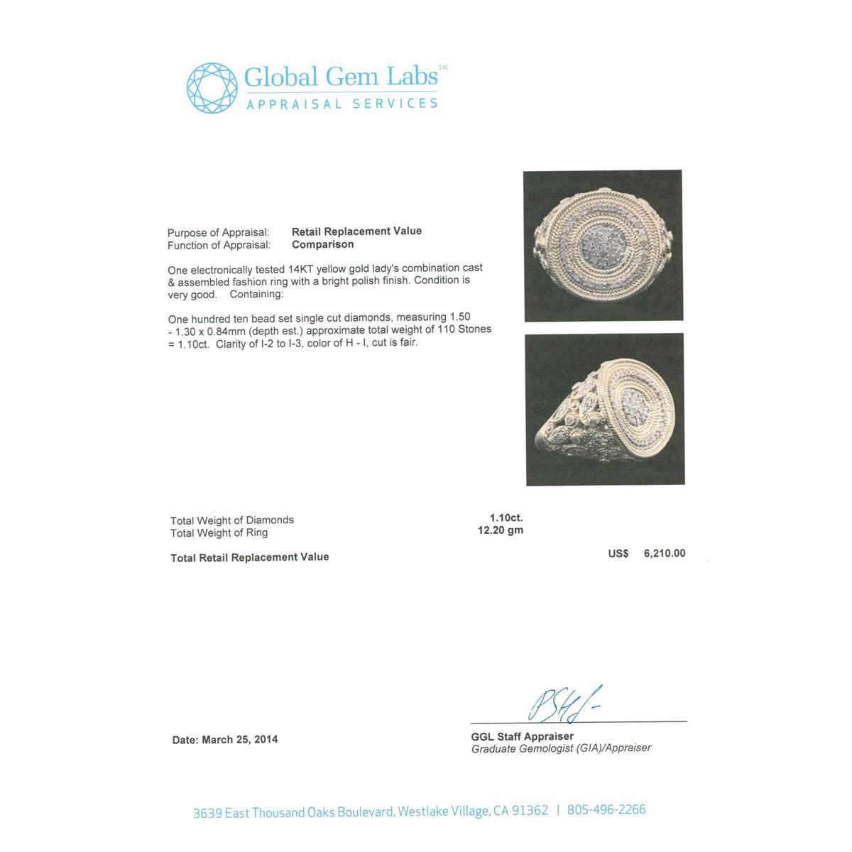 One electronically tested 14KT yellow gold Ladies combination cast & assembled fashion ring with a bright polish finish. Condition is very good. Containing: One Hundred Ten bead set single cut diamonds, measuring 1.50 - 1.30 x 0.84mm (depth est.) approximate. Total Weight of 110 Stones = 1.10ct. Clarity: I-2 to I-3. Color: H - I, Cut is Fair. Total Weight of Diamonds 1.10ct. Total Weight of Ring 12.20gm. GGL Appraised at $6,210.00.