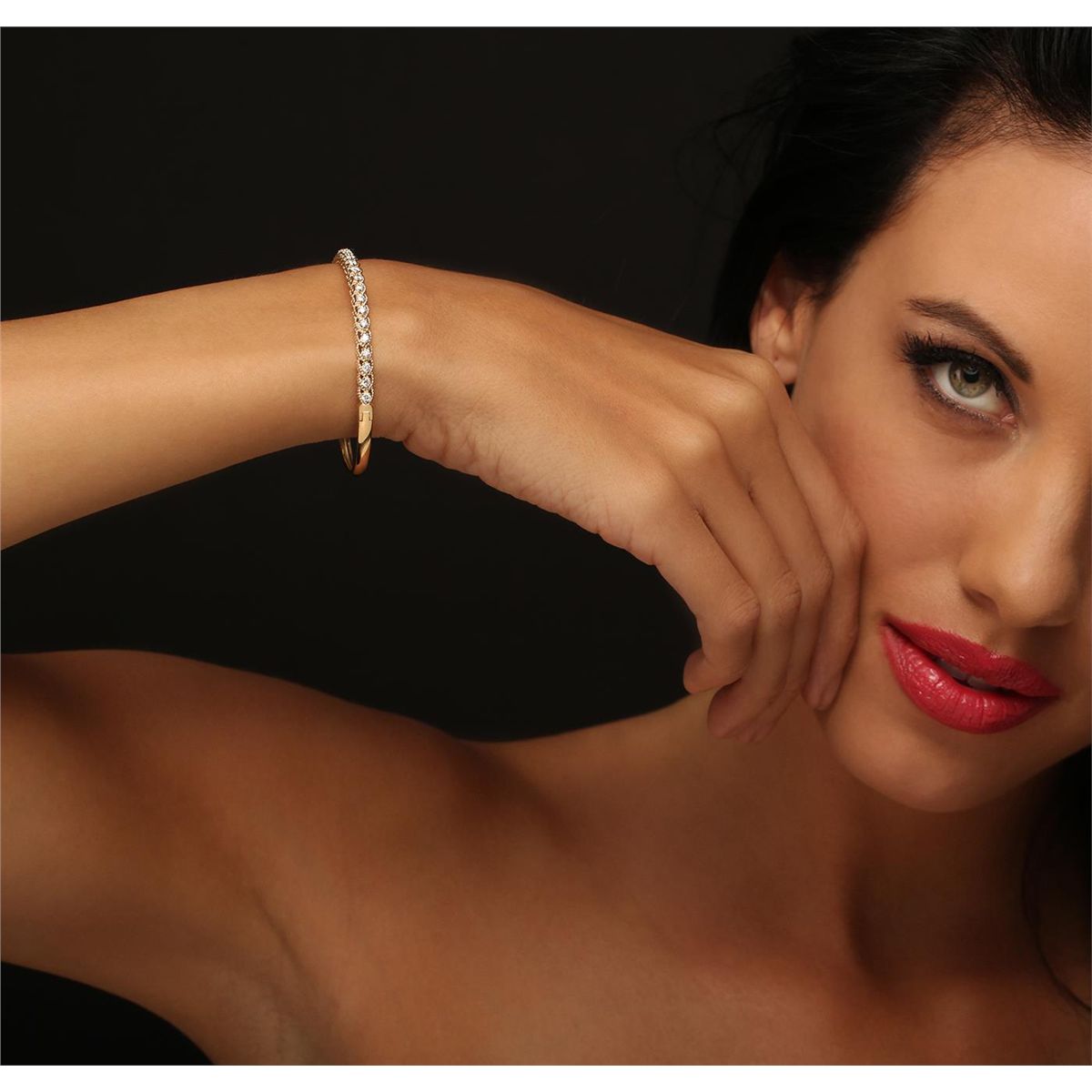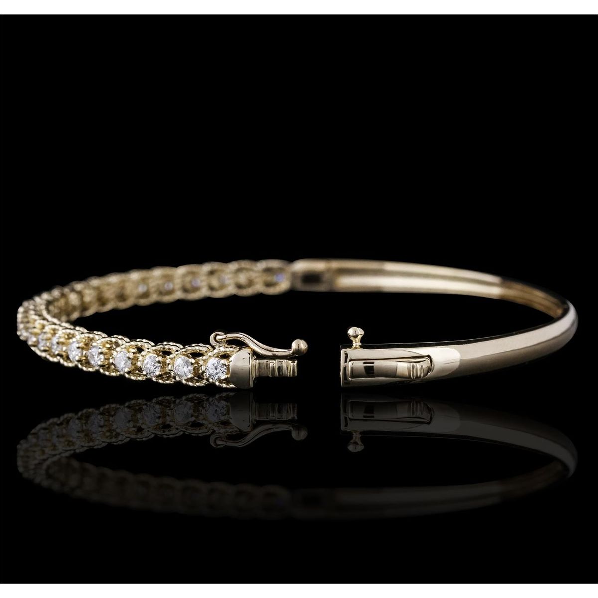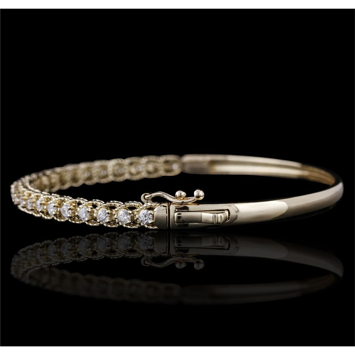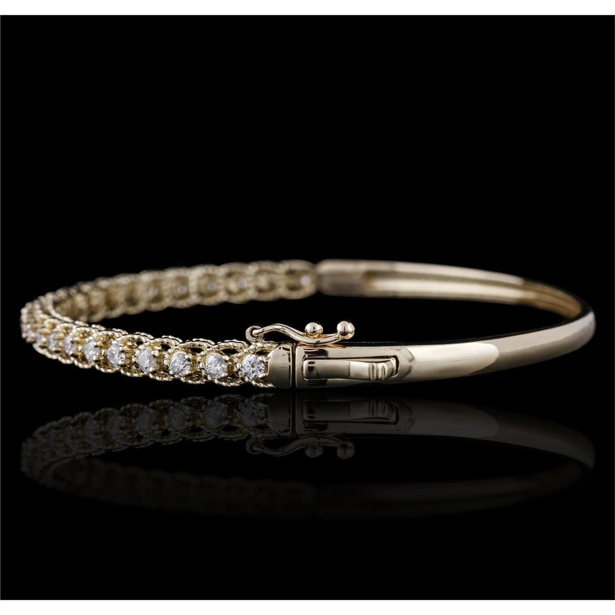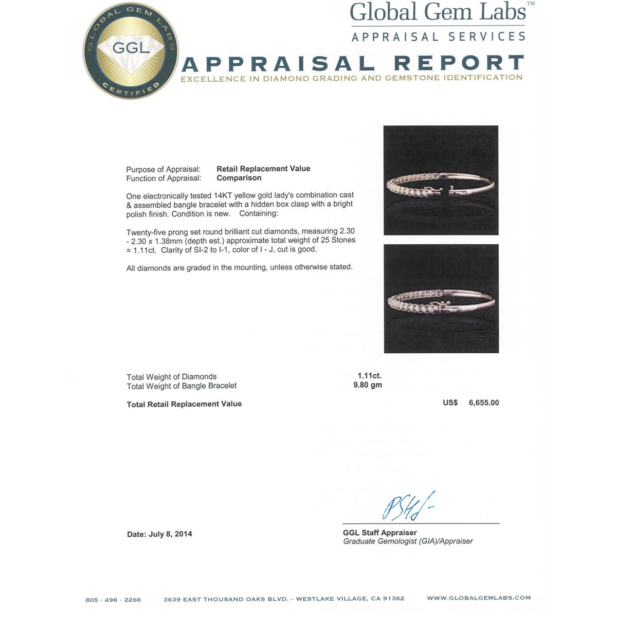 One electronically tested 14KT yellow gold Ladies combination cast & assembled bangle bracelet with a hidden box clasp with a bright polish finish. Condition is new. Containing: Twenty-Five prong set round brilliant cut diamonds, measuring 2.30 - 2.30 x 1.38mm (depth est.) approximate. Total Weight of 25 Stones = 1.11ct. Clarity: SI-2 to I-1. Color: I - J, Cut is Good. All diamonds are graded in the mounting, unless otherwise stated. Total Weight of Diamonds 1.11ct. Total Weight of Bangle Bracelet 9.80 grams. GGL Appraised at $6,655.00.