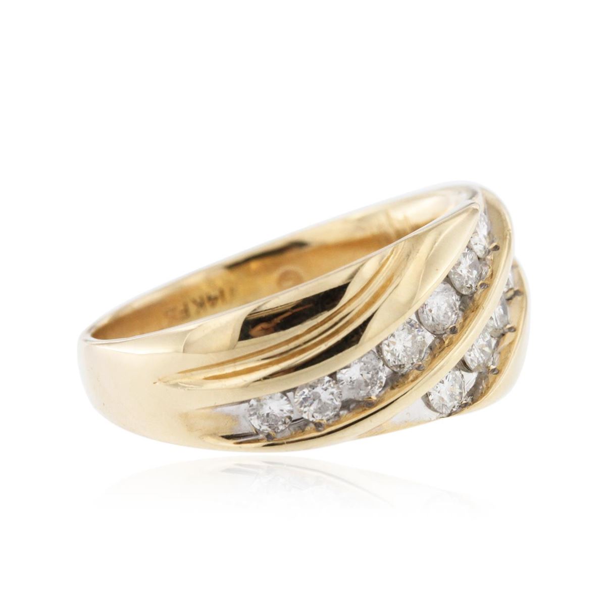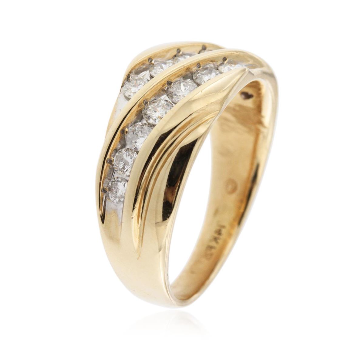 One electronically tested 14KT yellow gold man's combination cast & assembled ring with a bright polish finish. Identified with markings of "14K". Condition is excellent. Containing: Fourteen channel set round brilliant cut diamonds, measuring 2.60 - 2.60 x 1.56mm (depth est.) approximate total weight of 14 Stones = 1.12ct. Clarity of I-1 to I-2, Color of K - L, Cut is Good. Total Weight of Diamonds 1.12ct. Total Weight of Ring 9.30gm. GGL Appraised at $4,430.00.