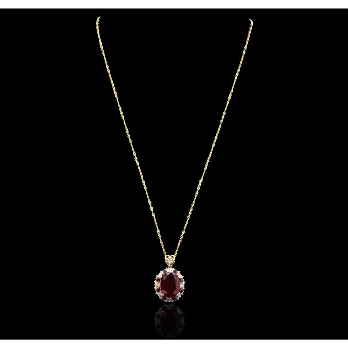 One electronically tested 14KT yellow gold ladies combination cast & assembled ruby and diamond pendant & chain 18.0" long, fancy link with a lobster claw clasp with a bright polish finish. Identified with markings of "14K". Condition is new. Containing: Eight prong set round modified brilliant cut natural rubies, measuring 3.00 - 3.00 x 1.95 mm, approximate total weight of 1.12ct., clarity is heavily included, type II, medium dark, moderately strong, strongly purplish red color, (GIA stpR 6/4), cut is good. Twenty-Five prong set round brilliant cut diamonds, measuring 3.00 - 1.50 x 1.35mm (depth est.) approximate total weight of 25 Stones = 1.50ct. Clarity: SI-2 to I-1. Color: J - K, Cut is Good. Colored gemstones are presumed to have been subjected to commonly used enhancement processes. All diamonds and colored gemstones are graded in the mounting, unless otherwise stated. Total Weight of Colored Stones 1.12ct. Total Weight of Diamonds 1.50ct. Total Weight of Pendant & Chain 9.90 grams. GGL Appraised at $6,280.00.