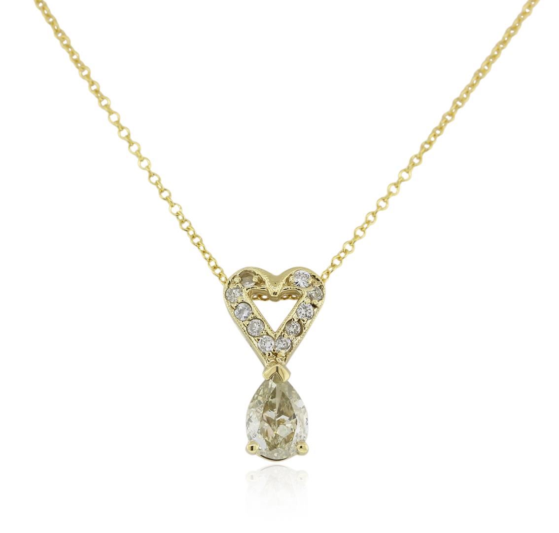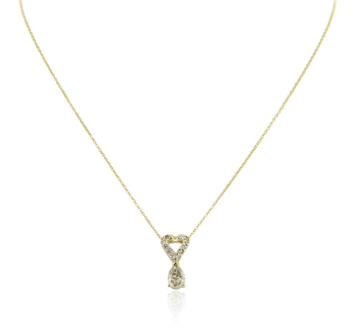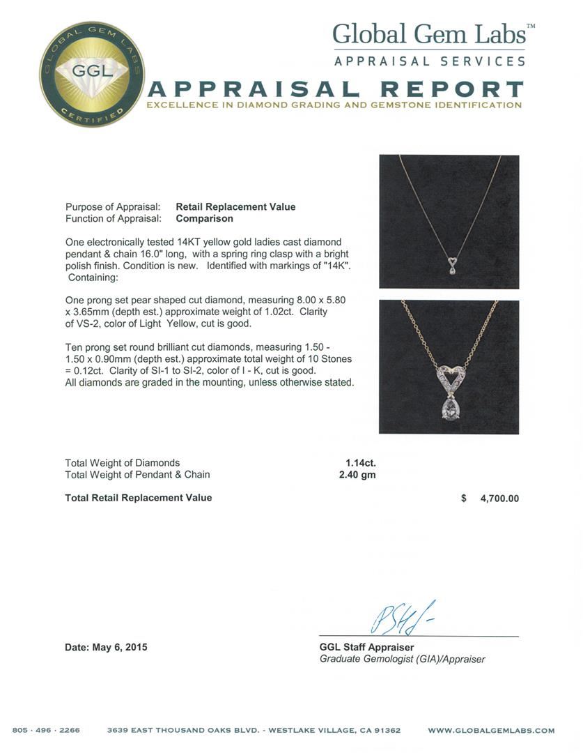 One electronically tested 14KT yellow gold ladies cast diamond pendant & chain 16.0" long, with a spring ring clasp with a bright polish finish. Identified with markings of "14K". Condition is new. Containing: One prong set pear shaped cut diamond, measuring 8.00 x 5.80 x 3.65mm (depth est.) approximate weight of 1.02ct. Clarity: VS-2, Cut is Good. Ten prong set round brilliant cut diamonds, measuring 1.50 - 1.50 x 0.90mm (depth est.) approximate total weight of 10 Stones = 0.12ct. Clarity: SI-1 to SI-2. Color: I - K, Cut is Good. All diamonds are graded in the mounting, unless otherwise stated. Total Weight of Diamonds 1.14ct. Total Weight of Pendant & Chain 2.40 grams. GGL Appraised at $4,700.00.