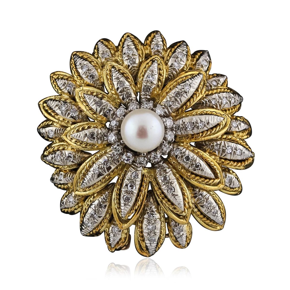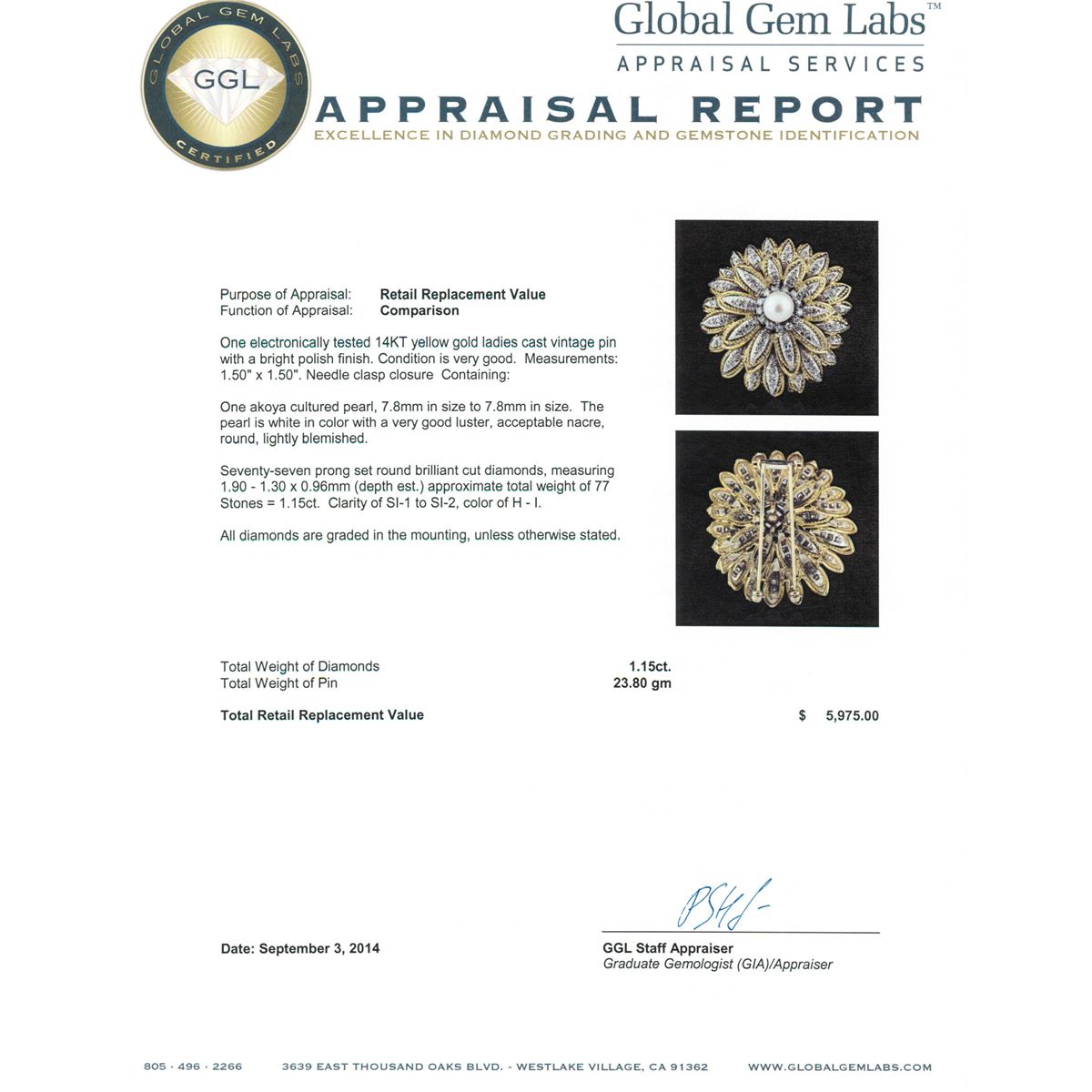 One electronically tested 14KT yellow gold ladies cast vintage pin with a bright polish finish. Measurements: 1.50" x 1.50". Needle clasp closure Condition is very good. Containing: One akoya cultured pearl, 7.8mm in size to 7.8mm in size. The pearl is white in color with a very good luster, acceptable nacre, round, lightly blemished. Seventy-Seven prong set round brilliant cut diamonds, measuring 1.90 - 1.30 x 0.96mm (depth est.) approximate total weight of 77 Stones = 1.15ct. Clarity: SI-1 to SI-2. Color: H - I. All diamonds are graded in the mounting, unless otherwise stated. Total Weight of Diamonds 1.15ct. Total Weight of Pin 23.80 grams. GGL Appraised at $5,975.00.