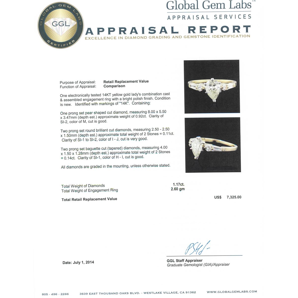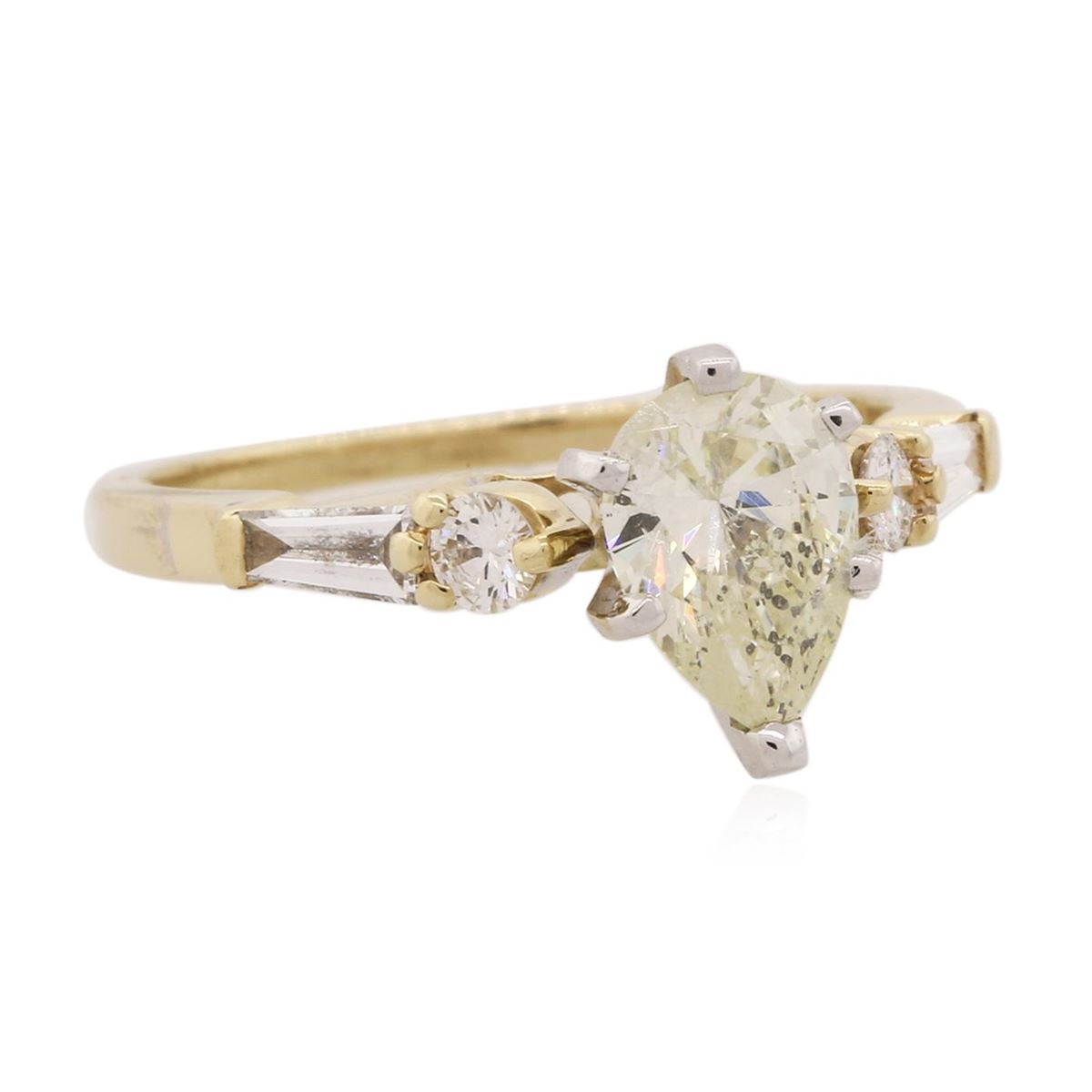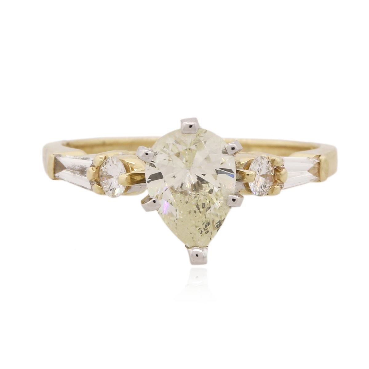 One electronically tested 14KT yellow gold Ladies combination cast & assembled engagement ring with a bright polish finish. Condition is new. Identified with markings of "14K". Containing: One prong set pear shaped cut diamond, measuring 8.00 x 5.50 x 3.47mm (depth est.) approximate weight of 0.92ct. Clarity: SI-2. Color: M, Cut is Good. Two prong set round brilliant cut diamonds, measuring 2.50 - 2.50 x 1.50mm (depth est.) approximate total weight of 2 Stones = 0.11ct. Clarity: SI-1 to SI-2. Color: I - J, Cut is Very Good. Two prong set baguette cut (tapered) diamonds, measuring 4.00 x 1.50 x 1.28mm (depth est.) approximate total weight of 2 Stones = 0.14ct. Clarity: SI-1. Color: H - I, Cut is Good. All diamonds are graded in the mounting, unless otherwise stated. Total Weight of Diamonds 1.17ct. Total Weight of Engagement Ring 2.60 grams. GGL Appraised at $7,325.00.