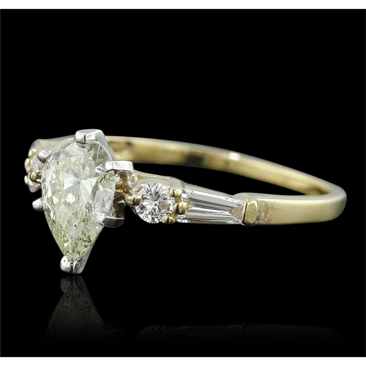 One electronically tested 14KT yellow gold Ladies combination cast & assembled engagement ring with a bright polish finish. Condition is new. Identified with markings of "14K". Containing: One prong set pear shaped cut diamond, measuring 8.00 x 5.50 x 3.47mm (depth est.) approximate weight of 0.92ct. Clarity: SI-2. Color: M, Cut is Good. Two prong set round brilliant cut diamonds, measuring 2.50 - 2.50 x 1.50mm (depth est.) approximate total weight of 2 Stones = 0.11ct. Clarity: SI-1 to SI-2. Color: I - J, Cut is Very Good. Two prong set baguette cut (tapered) diamonds, measuring 4.00 x 1.50 x 1.28mm (depth est.) approximate total weight of 2 Stones = 0.14ct. Clarity: SI-1. Color: H - I, Cut is Good. All diamonds are graded in the mounting, unless otherwise stated. Total Weight of Diamonds 1.17ct. Total Weight of Engagement Ring 2.60 grams. GGL Appraised at $7,325.00.