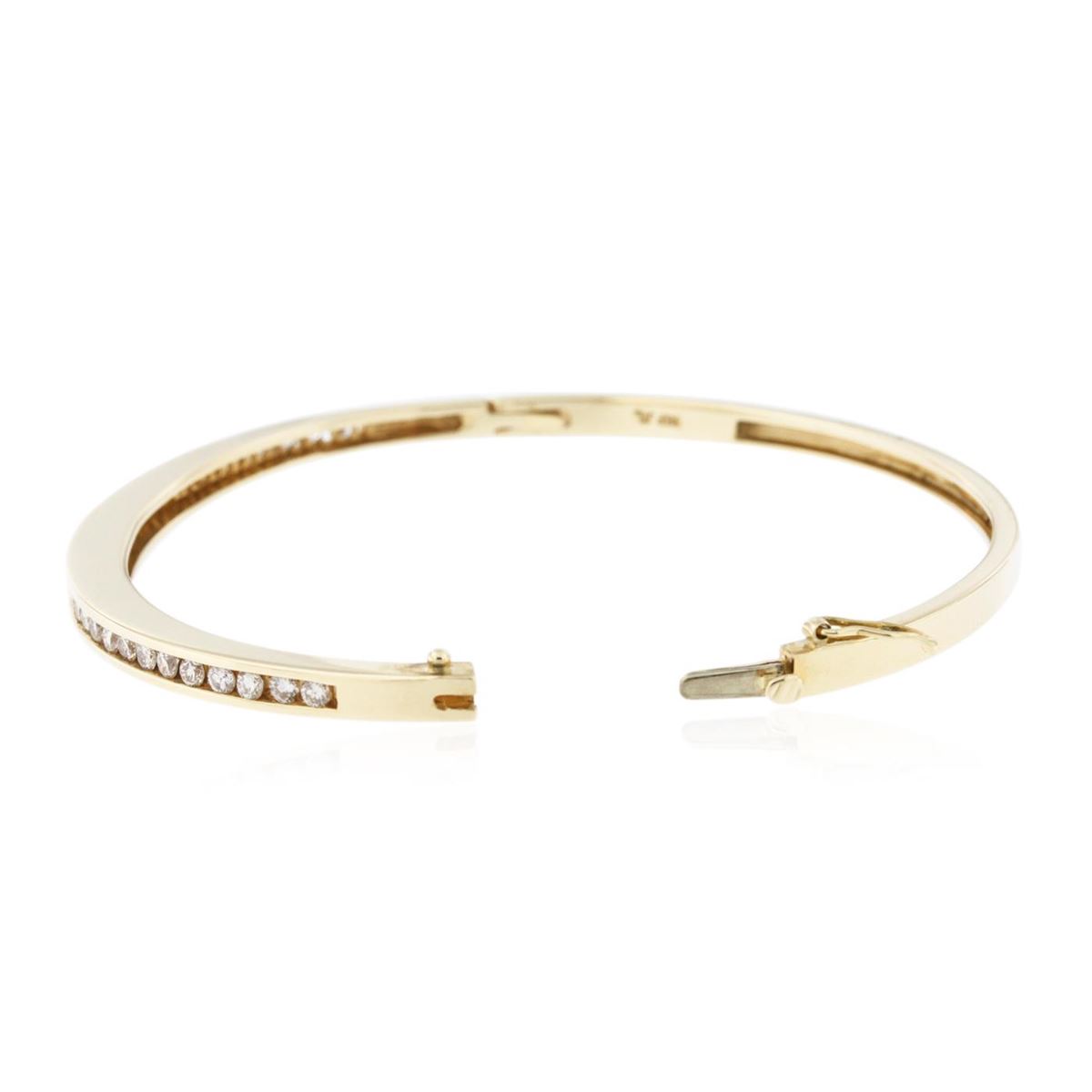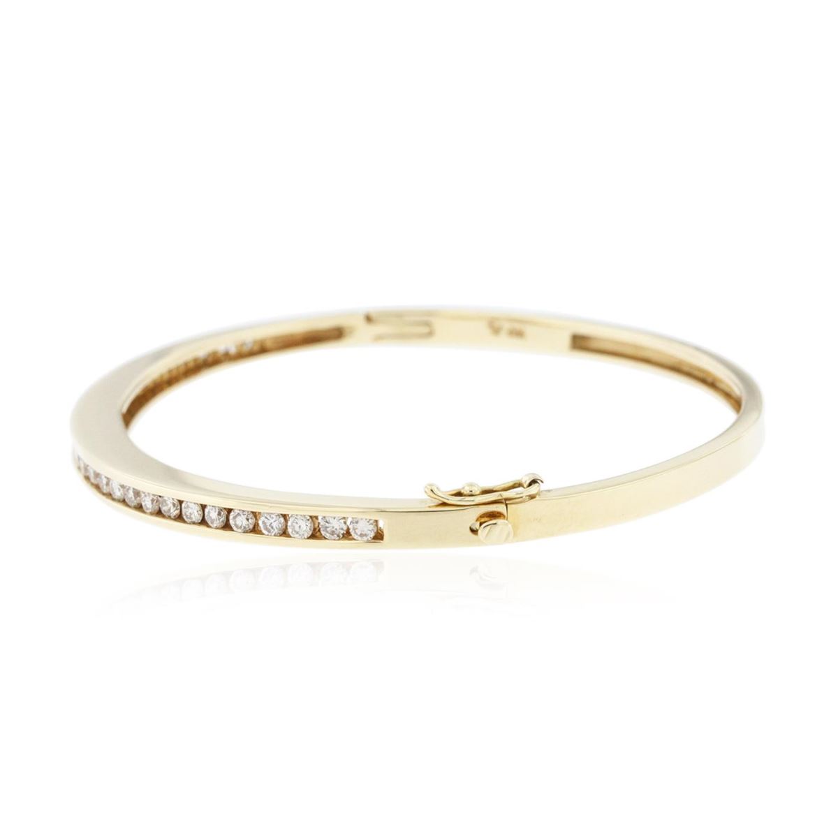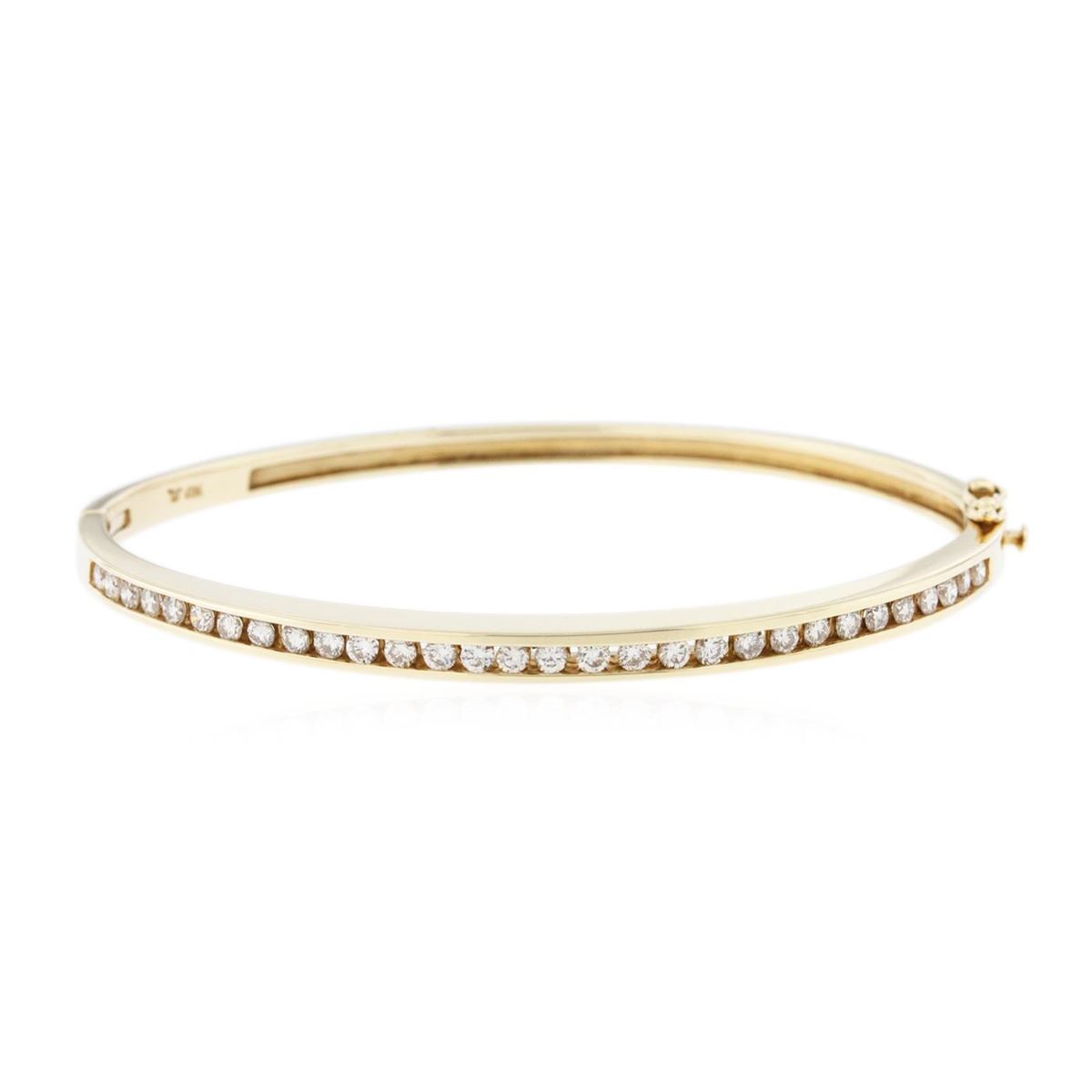 One electronically tested 14KT yellow gold ladies cast & assembled diamond bangle bracelet with a bright polish finish. Condition is good. Six and one-quarter inch length hinged diamond bangle bracelet terminating in a concealed clasp with safety. Identified with markings of "14KP". Containing: Thirty channel set round brilliant cut diamonds, measuring 2.20 - 2.10 x 1.29mm (depth est.) approximate. Total Weight of 30 Stones = 1.18ct. Faint brown secondary color throughout. Graded in the setting. Clarity: VS-2 to SI-2. Color: J - L. Total Weight of Diamonds 1.18ct. Total Weight of Bangle Bracelet 12.60 grams. AIG Appraised at $5,400.00.
