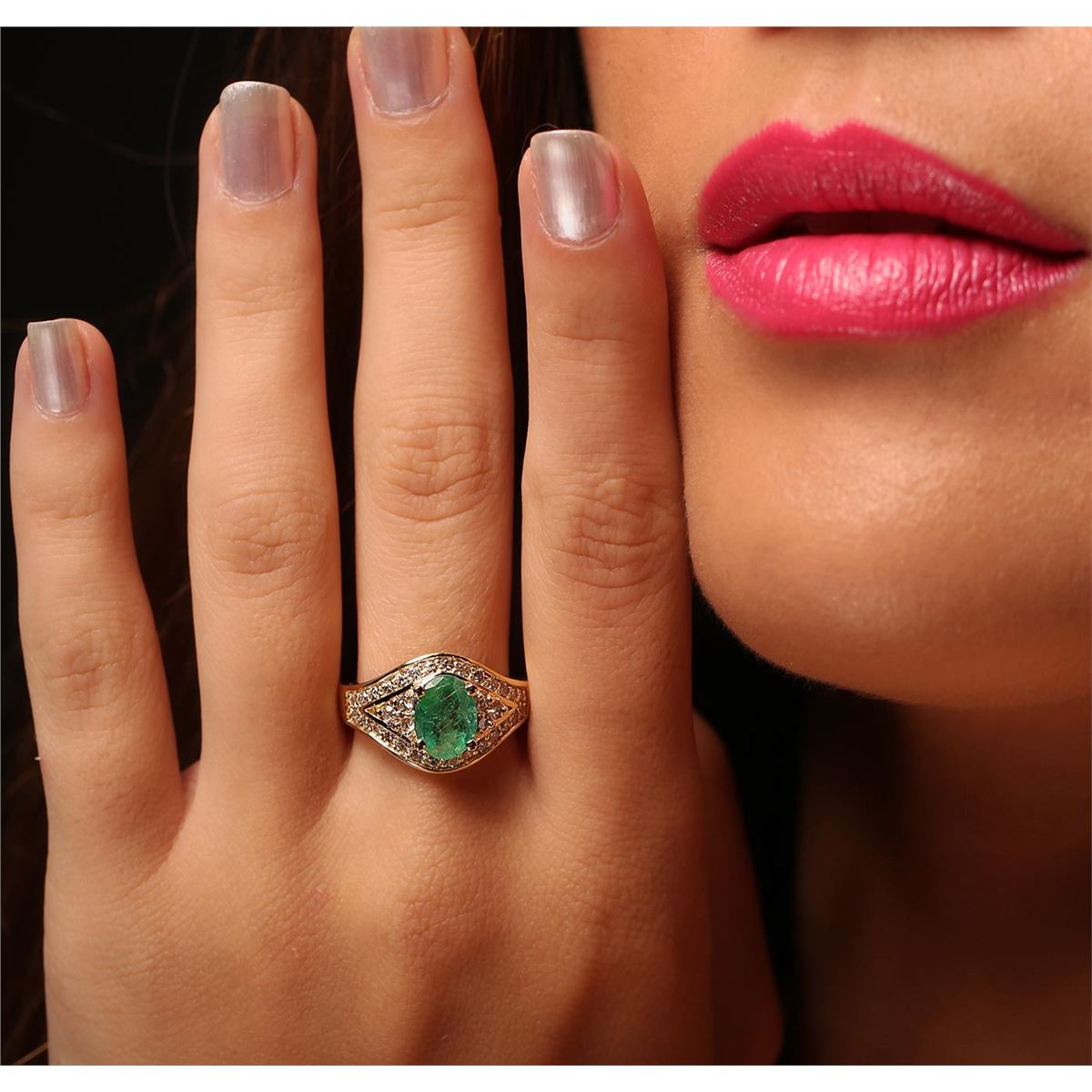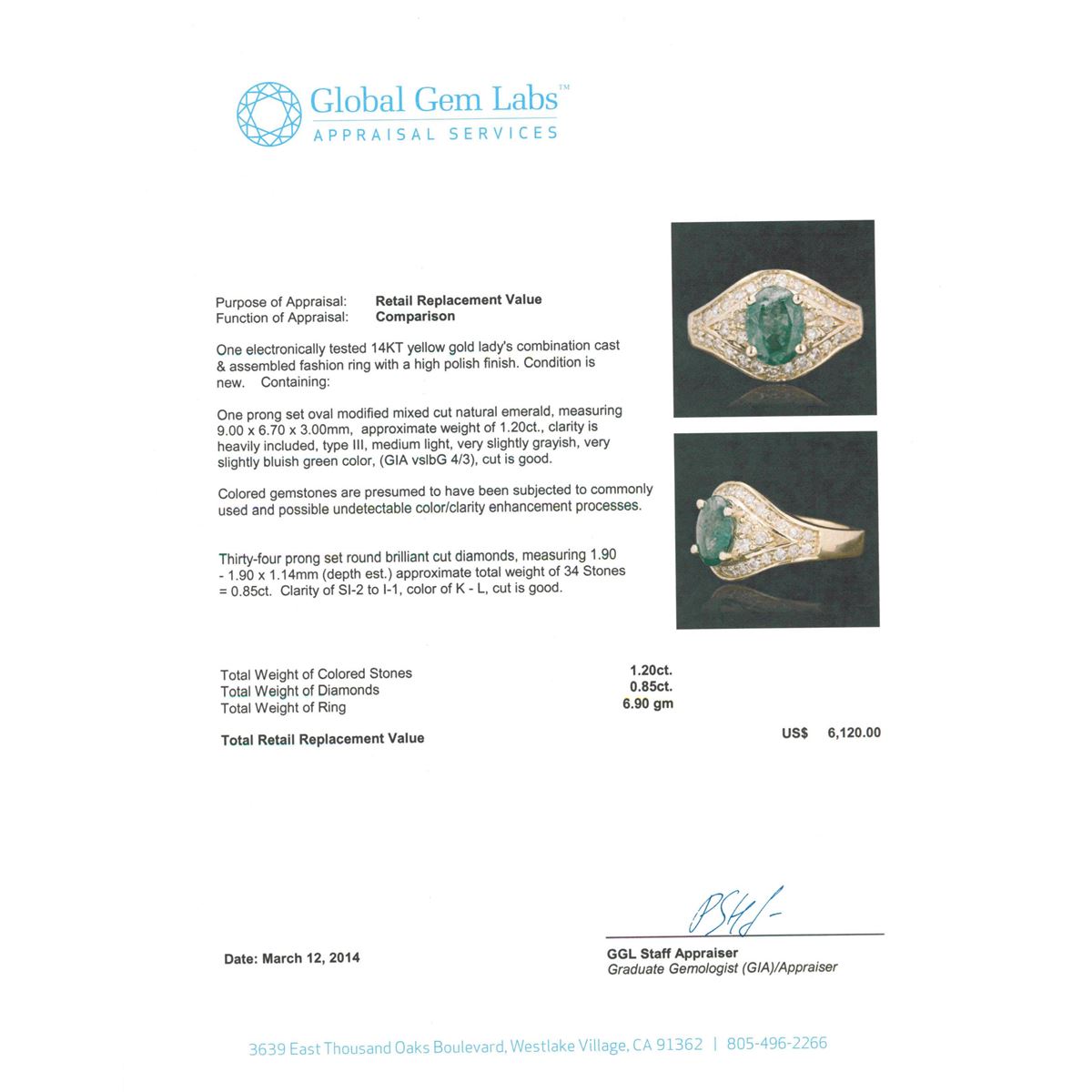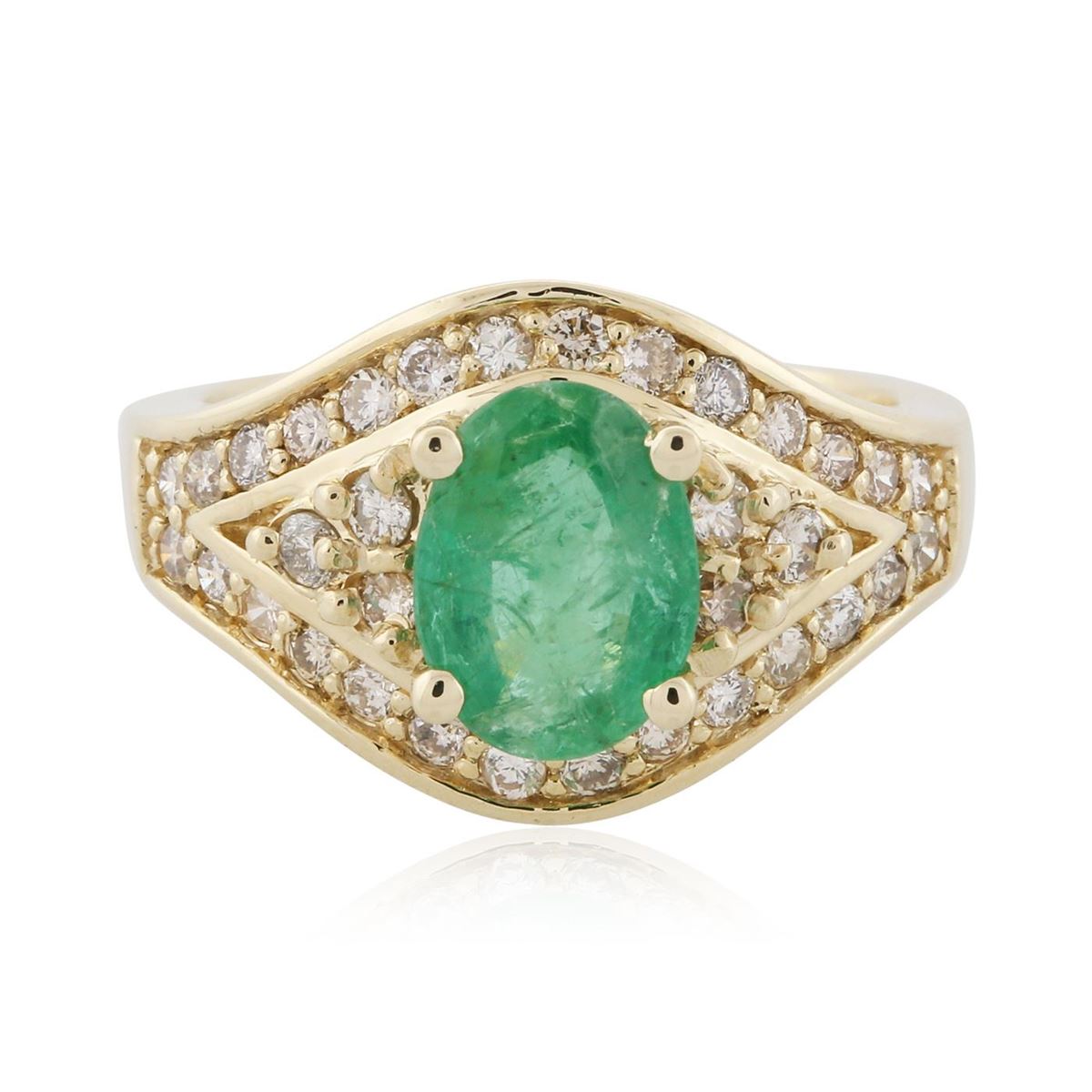 One electronically tested 14KT yellow gold Ladies combination cast & assembled fashion ring with a high polish finish. Condition is new. Containing: One prong set oval modified mixed cut natural emerald, measuring 9.00 x 6.70 x 3.00mm, approximate weight of 1.20ct., clarity is heavily included, type III, medium light, very slightly grayish, very slightly bluish green color, (GIA vslbG 4/3), cut is good. Colored gemstones are presumed to have been subjected to commonly used and possible undetectable color/clarity enhancement processes. Thirty-Four prong set round brilliant cut diamonds, measuring 1.90 - 1.90 x 1.14mm (depth est.) approximate total weight of 34 Stones = 0.85ct. Clarity of SI-2 to I-1, Color of K - L, Cut is Good. Total Weight of Colored Stones 1.20ct. Total Weight of Diamonds 0.85ct. Total Weight of Ring 6.90 grams. GGL Appraised at $6,120.00.