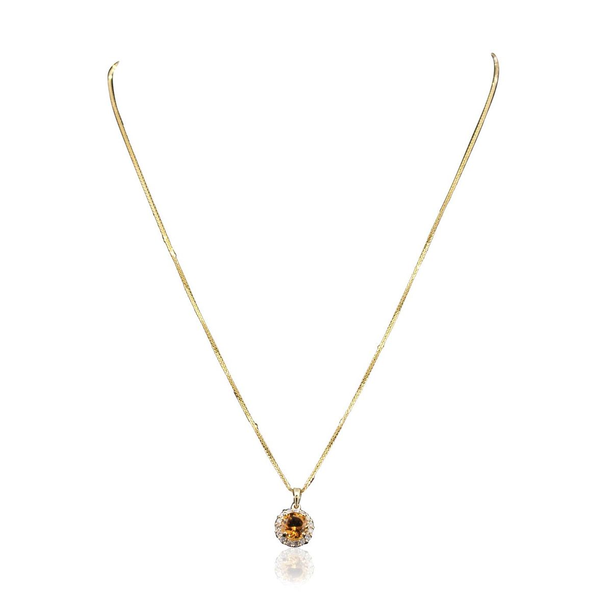One electronically tested 14KT yellow gold ladies cast & assembled citrine and diamond pendant with chain. Condition is new, good workmanship. The pendant features a citrine set within a diamond bezel, completed by a yellow gold bail. The pendant is supported by an eighteen inch length 14KT yellow gold designer style chain, terminating in a lobster claw clasp. Bright polish finish. Identified with markings of "14K". Containing: One prong set round brilliant cut natural citrine quartz, measuring 6.95 - 6.90 x 4.40 mm, 8%. bulge factor, approximate weight of 1.22ct., clarity is eye clean, type I, medium dark, brownish, yellowish orange color, (GIA yO 6/3), cut is good. Transmitting light with no distortion, transparent. Refractive index testing results of 1.54 to 1.55. This is a conclusive result for quartz (citrine). Graded in the setting. Fifteen prong set round brilliant cut diamonds, measuring 1.70 - 1.60 x 0.99mm (depth est.) approximate. Total Weight of 15 Stones = 0.34ct. Graded in the setting. Clarity: SI-1 to I-1. Color: G - I. Total Weight of Colored Stones 1.22ct. Total Weight of Diamonds 0.34ct. Total Weight of Pendant With Chain 3.07 grams. AIG Appraised at $1,620.00.