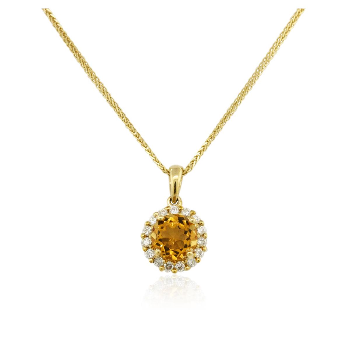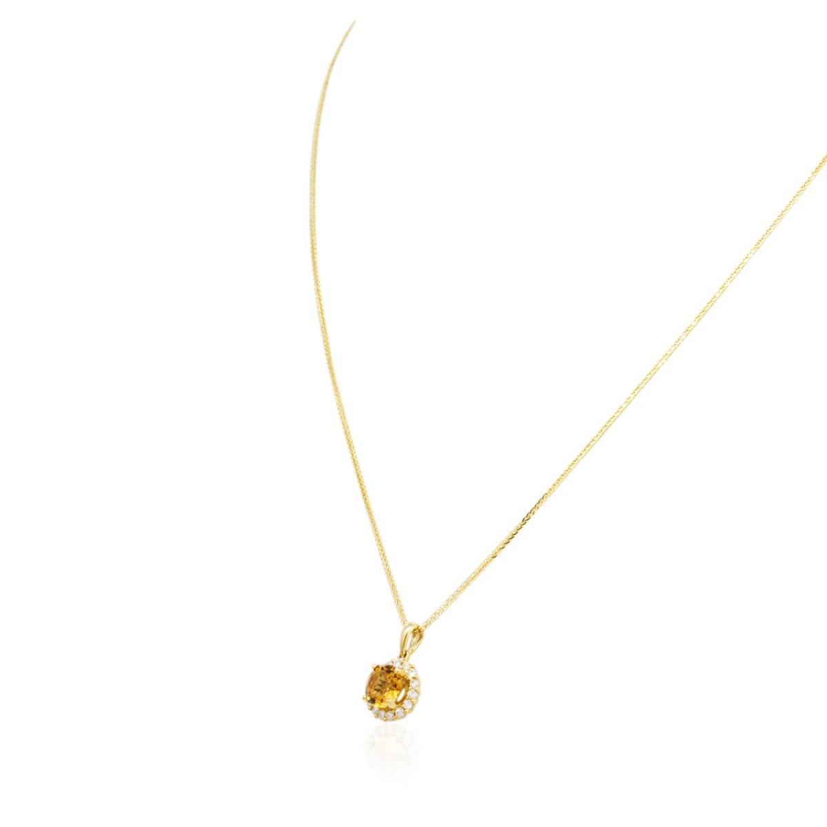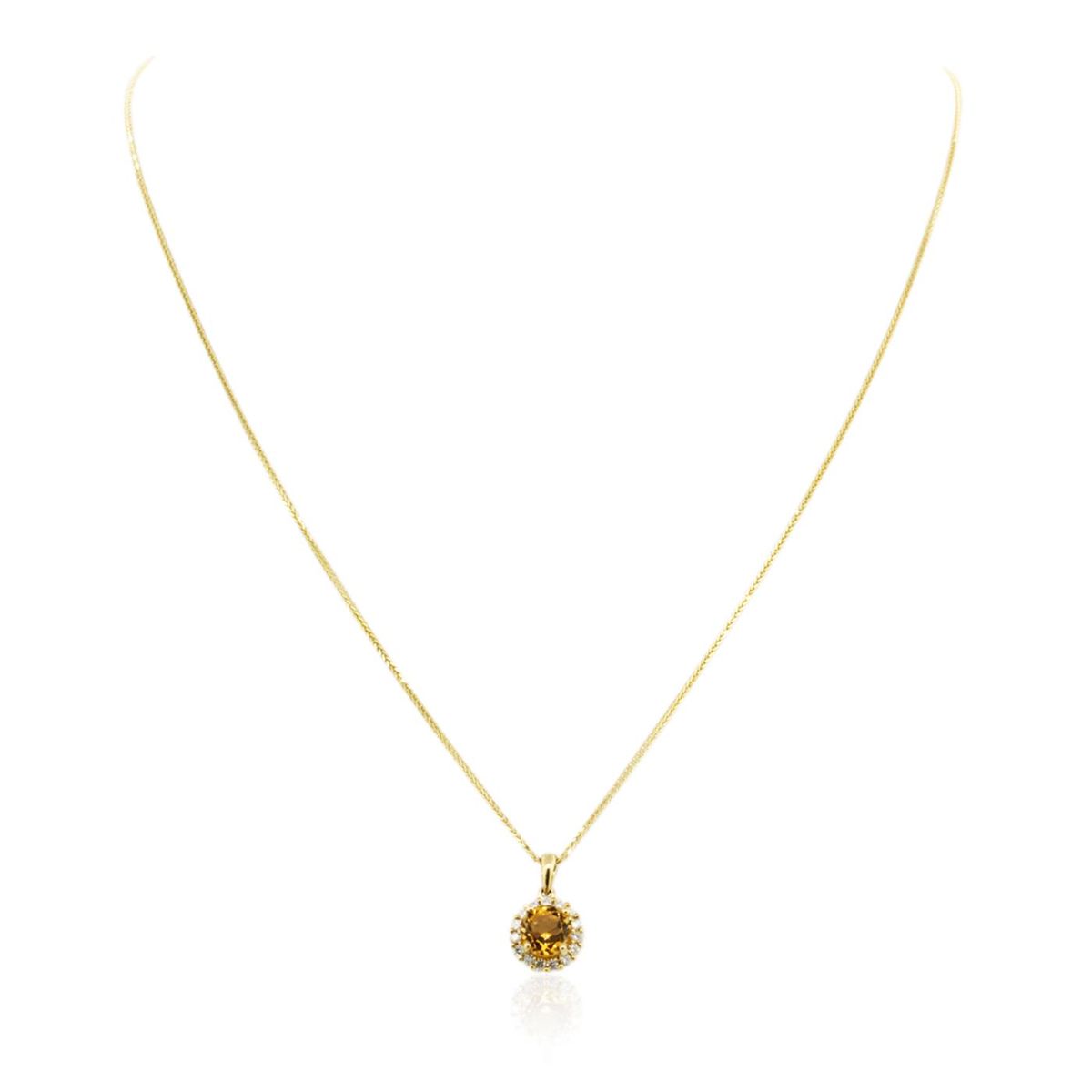 One electronically tested 14KT yellow gold ladies cast & assembled citrine and diamond pendant with chain. Condition is new, good workmanship. The pendant features a citrine set within a diamond bezel, completed by a yellow gold bail. The pendant is supported by an eighteen inch length 14KT yellow gold designer style chain, terminating in a lobster claw clasp. Bright polish finish. Identified with markings of "14K". Containing: One prong set round brilliant cut natural citrine quartz, measuring 6.95 - 6.90 x 4.40 mm, 8%. bulge factor, approximate weight of 1.22ct., clarity is eye clean, type I, medium dark, brownish, yellowish orange color, (GIA yO 6/3), cut is good. Transmitting light with no distortion, transparent. Refractive index testing results of 1.54 to 1.55. This is a conclusive result for quartz (citrine). Graded in the setting. Fifteen prong set round brilliant cut diamonds, measuring 1.70 - 1.60 x 0.99mm (depth est.) approximate. Total Weight of 15 Stones = 0.34ct. Graded in the setting. Clarity: SI-1 to I-1. Color: G - I. Total Weight of Colored Stones 1.22ct. Total Weight of Diamonds 0.34ct. Total Weight of Pendant With Chain 3.07 grams. AIG Appraised at $1,620.00.