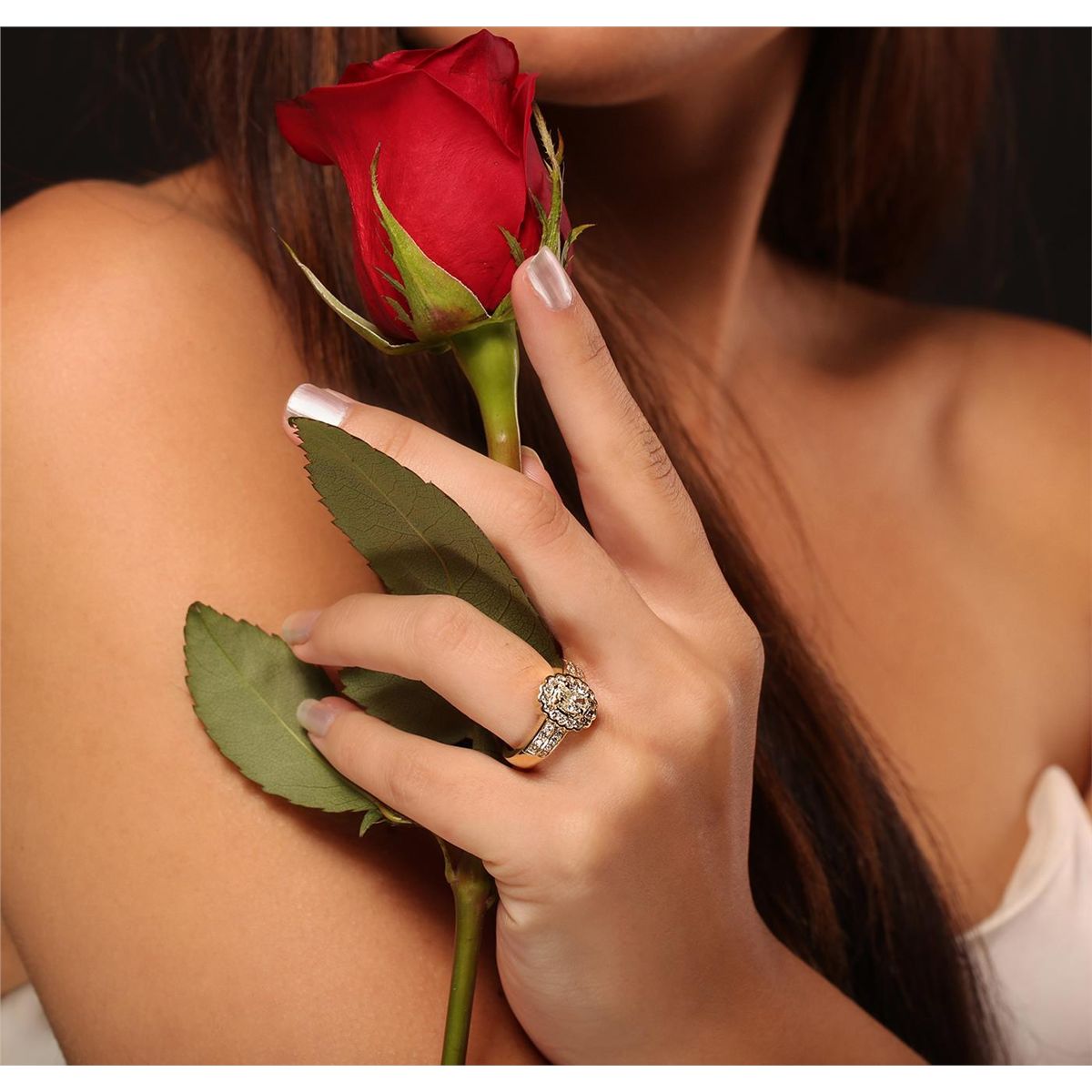 One electronically tested 14KT yellow gold ladies cast diamond unity ring with a bright polish finish. Condition is new, good workmanship. The featured diamond is set within a stylized diamond bezel supported by diamond set shoulders, completed by a three and one-half millimeter wide band. Identified with markings of "K14". Containing: One prong set oval shaped cut diamond, measuring 6.15 x 4.65 x 2.85mm (depth est.) approximate weight of 0.61ct with a faint blue fluorescence. Graded in the setting. Clarity: I-2. Depth: 61.3%. Table 55.9%. Thirty-Two prong set round brilliant cut diamonds, measuring 1.70 - 1.60 x 0.99mm (depth est.) approximate. Total Weight of 32 Stones = 0.62ct. Graded in the setting. Clarity: SI-1 to I-1. Color: H - J. Total Weight of Diamonds 1.23ct. Total Weight of Ring 7.61 grams. AIG Appraised at $4,770.00.
