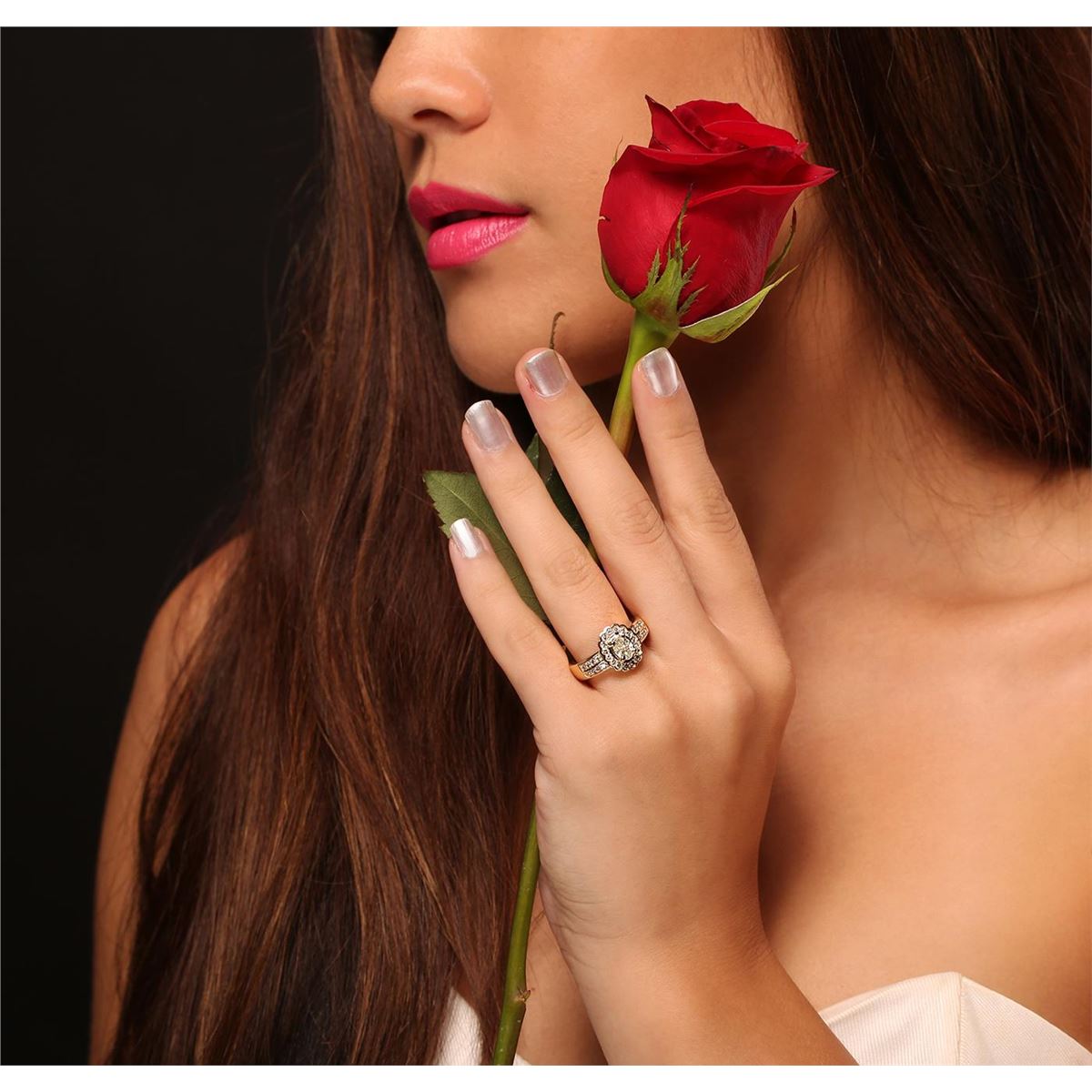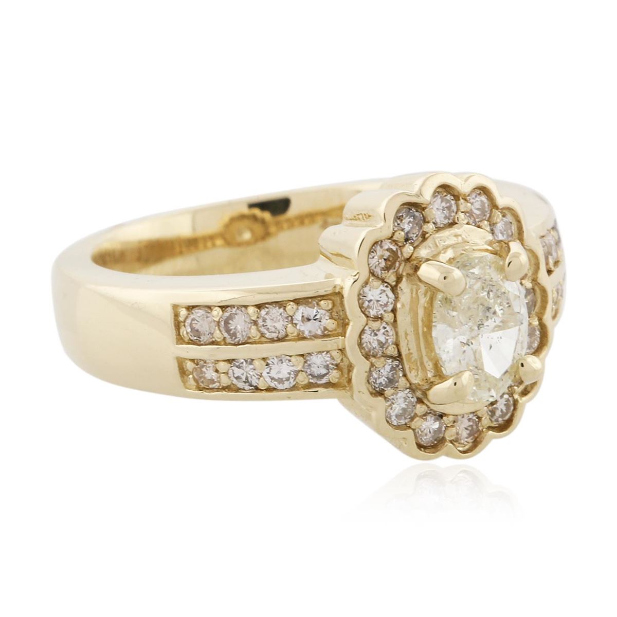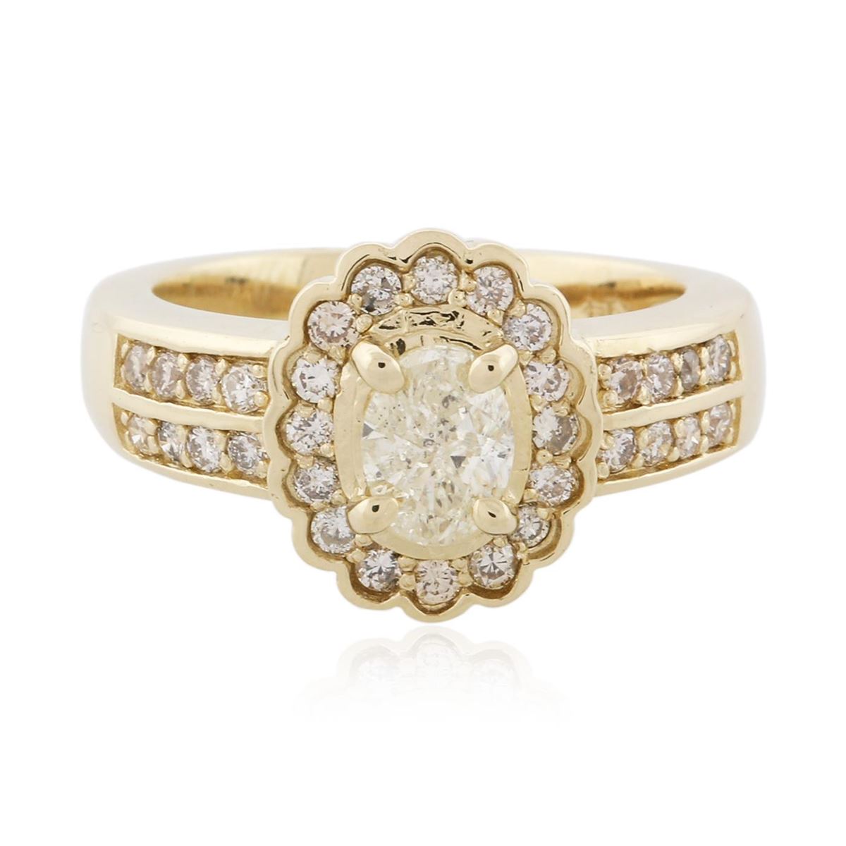 One electronically tested 14KT yellow gold ladies cast diamond unity ring with a bright polish finish. Condition is new, good workmanship. The featured diamond is set within a stylized diamond bezel supported by diamond set shoulders, completed by a three and one-half millimeter wide band. Identified with markings of "K14". Containing: One prong set oval shaped cut diamond, measuring 6.15 x 4.65 x 2.85mm (depth est.) approximate weight of 0.61ct with a faint blue fluorescence. Graded in the setting. Clarity: I-2. Depth: 61.3%. Table 55.9%. Thirty-Two prong set round brilliant cut diamonds, measuring 1.70 - 1.60 x 0.99mm (depth est.) approximate. Total Weight of 32 Stones = 0.62ct. Graded in the setting. Clarity: SI-1 to I-1. Color: H - J. Total Weight of Diamonds 1.23ct. Total Weight of Ring 7.61 grams. AIG Appraised at $4,770.00.