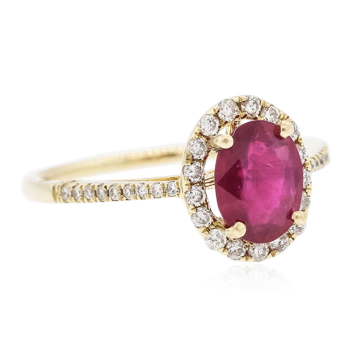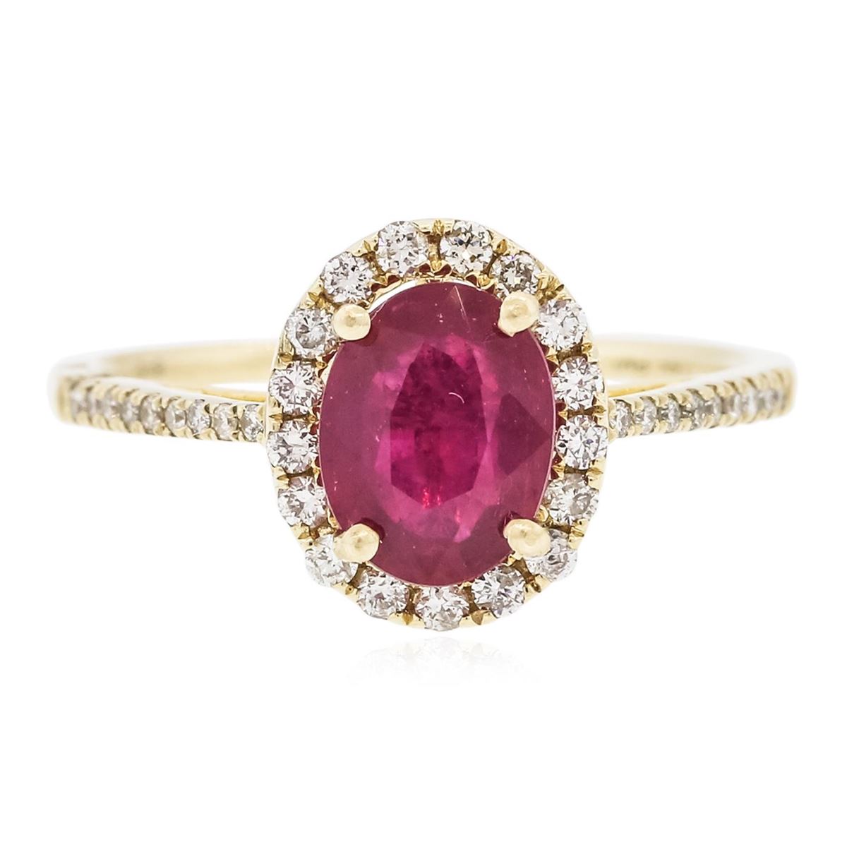 One electronically tested 14KT yellow gold Ladies cast ring with a bright polish finish. Condition is new. Identified with markings of "14K". Containing: One prong set oval modified brilliant cut natural ruby, measuring 7.80 x 5.90 x 3.33mm, approximate weight of 1.25ct., clarity is heavily included, type II, medium, moderately strong, strongly purplish red color, (GIA stpR 5/4), cut is good. Thirty-Five gypsy set round brilliant cut diamonds, measuring 1.40 - 1.10 x 0.75mm (depth est.) approximate. Total Weight of 35 Stones = 0.25ct. Clarity: I-1 to I-2. Color: J - K, Cut is Good. Colored gemstones are presumed to have been subjected to commonly used enhancement processes. All diamonds and colored gemstones are graded in the mounting, unless otherwise stated. Total Weight of Colored Stones 1.25ct. Total Weight of Diamonds 0.25ct. Total Weight of Ring 2.10 grams. GGL Appraised at $2,015.00.